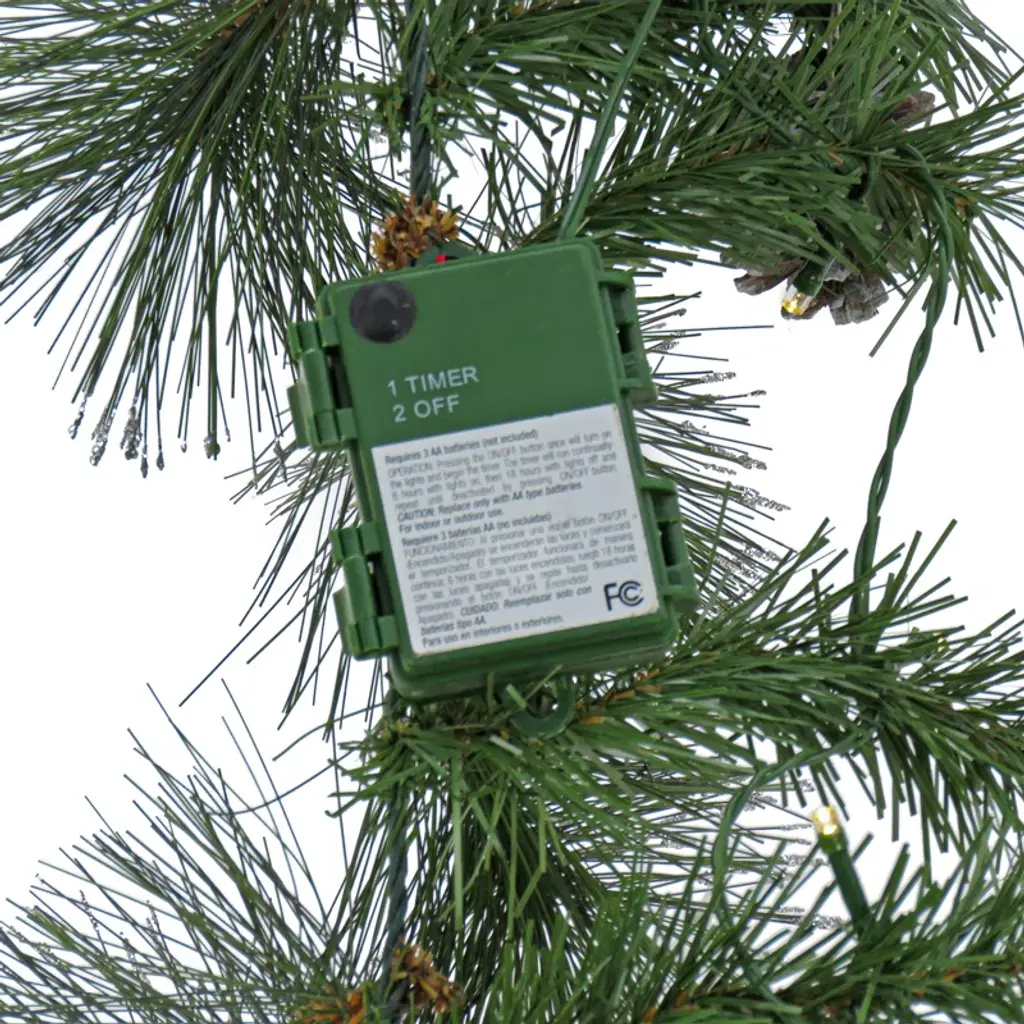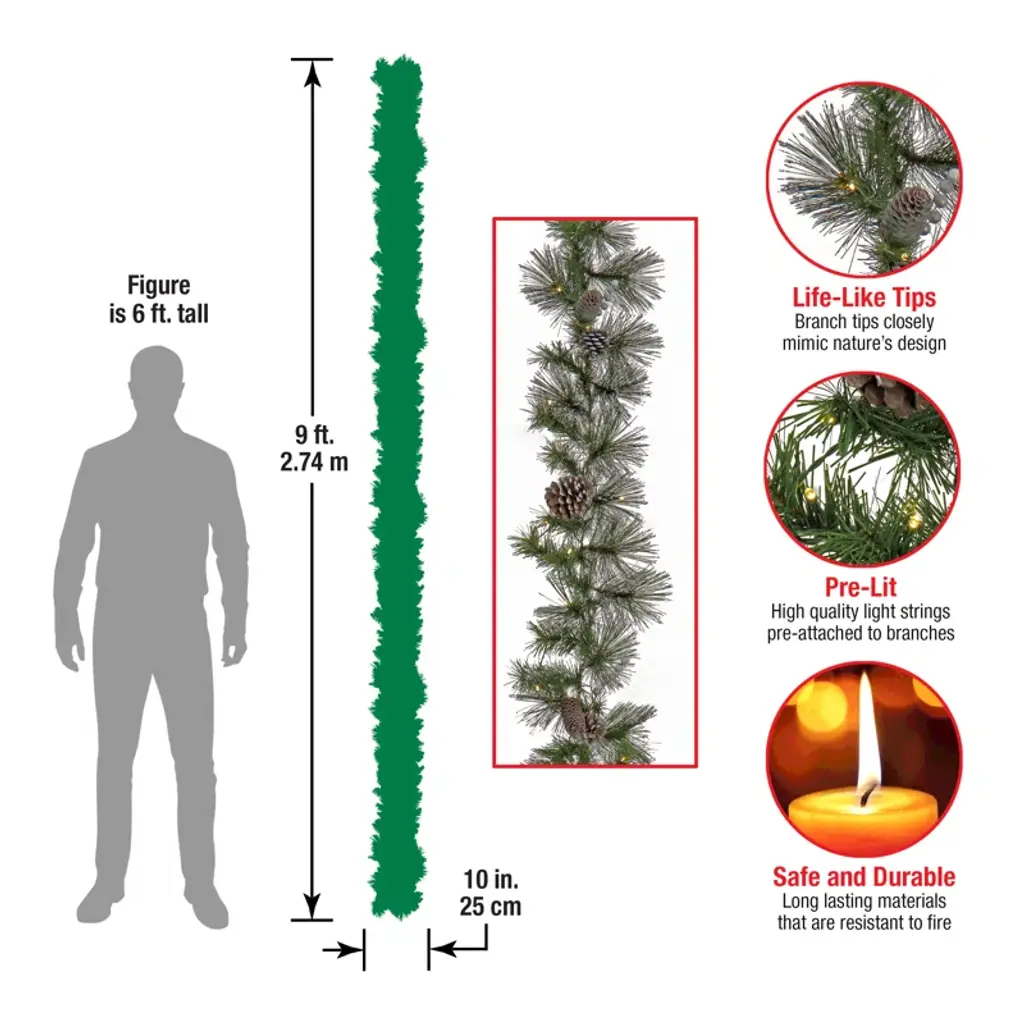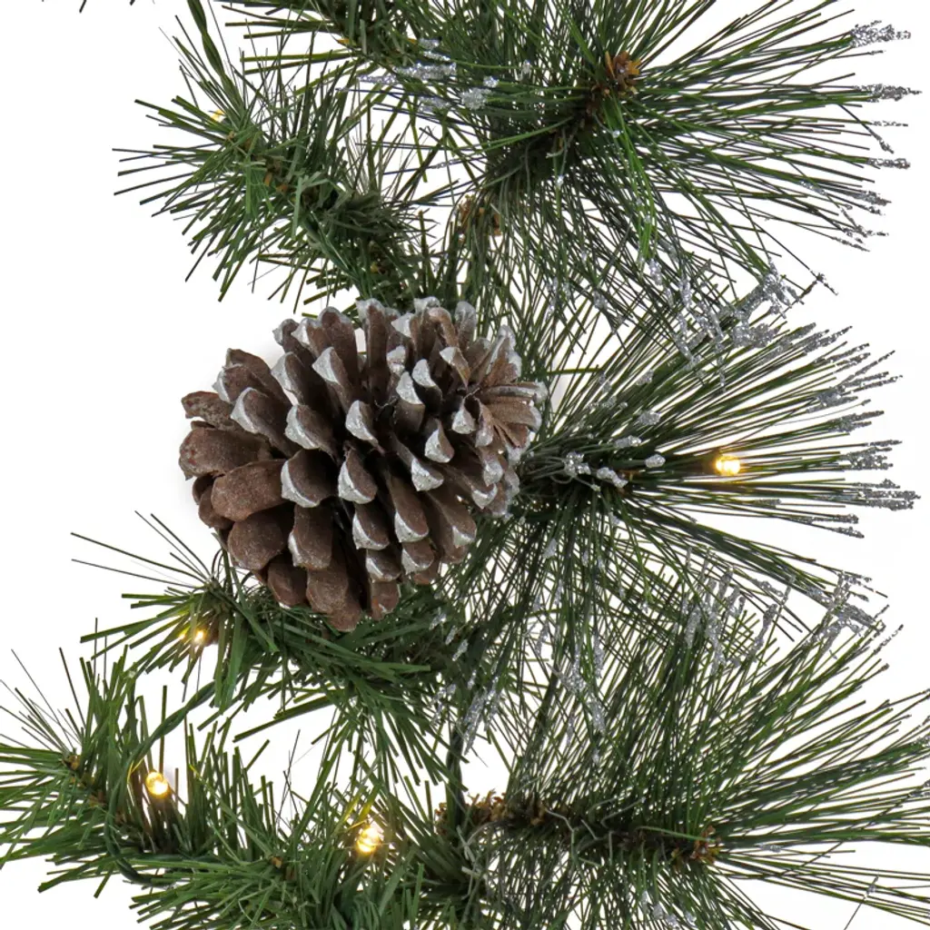 This attractive garland features a mixture of evergreen and bristle branch tips trimmed with glitter, snow-dusted pinecones, and white berries. It is pre-strung with 50 battery-operated warm white LED lights that are energy-efficient and long lasting. Included is an option for 6 hours ON/18 hours OFF timed operation. This indoor/outdoor garland can be displayed over doors, windows, fireplace mantels, fence, or stairway railings.