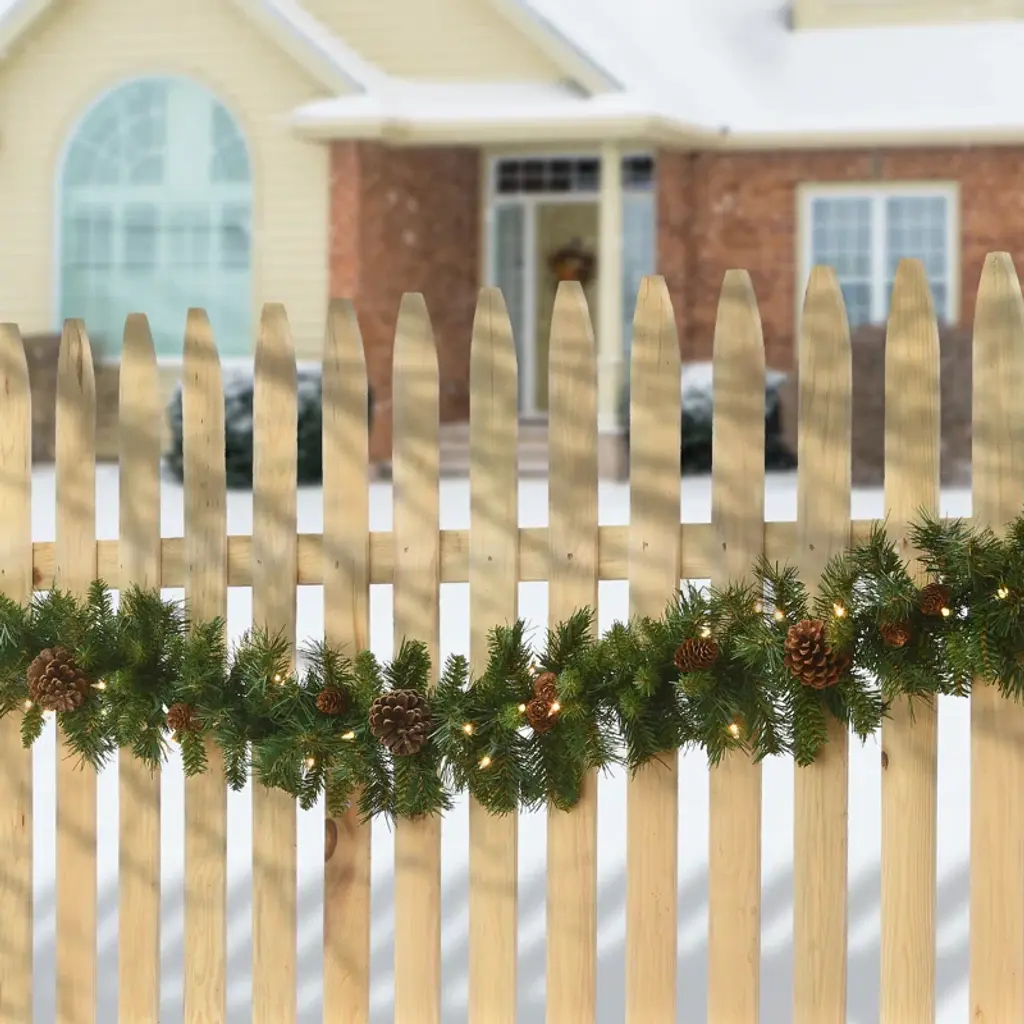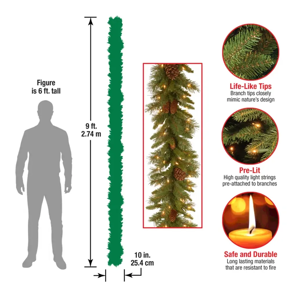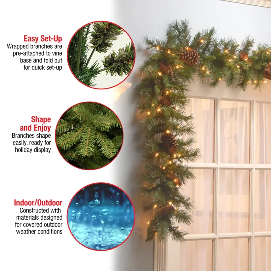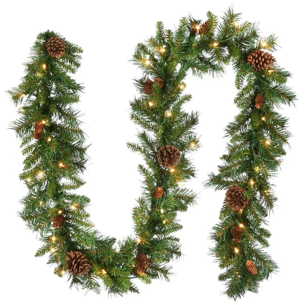 This artificial garland helps you deck the halls in rustic style, thanks to its bristle tips and pinecones. Made to resemble real pine, this swath of green-hued PVC swag comes pre-strung with 50 clear lights to brighten up your indoor or outdoor space. At 9' long, this traditional-looking garland looks just right displayed over doors, windows, fireplace mantels, stairway railings, and even on fences. The stems are also bendable, making it a cinch to adorn this festive decor wherever you'd like.