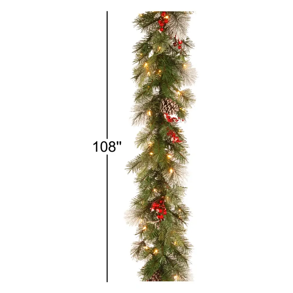 This artificial garland showcases a natural design that's welcome in any coastal or farmhouse space. Made to resemble real pine, this swath of green-hued PV swag is flocked with snow-sprinkled pinecones and red berries for a festive look. This piece comes pre-strung with 70 clear white lights that create a warm atmosphere and remain lit even if a bulb burns out. At 9' long, this traditional indoor/outdoor garland looks great displayed over doors, fireplace mantels, and even along fences. Plus, the stems are bendable, making it a cinch to adorn this festive decor wherever you'd like.