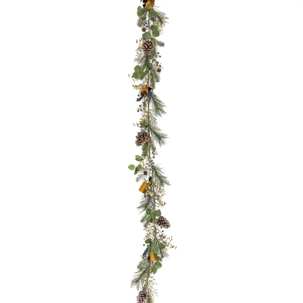 This Swiss Chic-decorated garland features a mixture of evergreen and bristle branch tips flowing from a flexible vine base. It is trimmed with pinecones, leafy greens, white twigs, clusters of blueberries, and gold metal bells. Black velvet ribbons and bows tied to each bell add the finishing touch. Display this festive garland over the door, window, fireplace mantel, or stairway railing. For indoor use only.