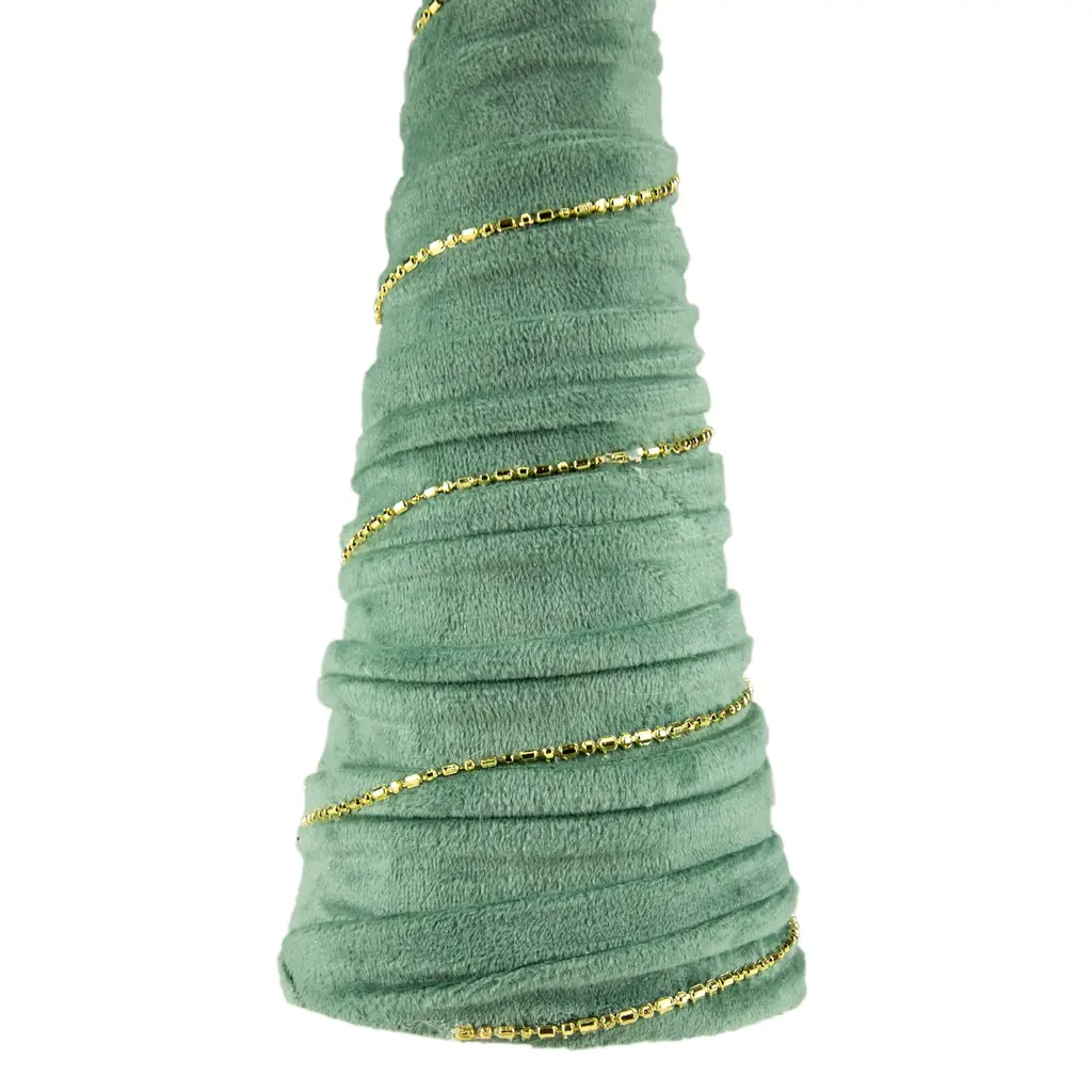 Add this glamorous, one of a kind cone tree to your holiday decor. Soft micro suede fabric is embellished with a shiny, gold garland. Perfect for mantles, tables or as part of your holiday table centerpiece. Features; Cone shaped Christmas tree Micro suede fabric Gold garland accent Recommended for indoor use Dimensions: 11.5" high x 3.5" diameter Material(s): plastic/micro suede