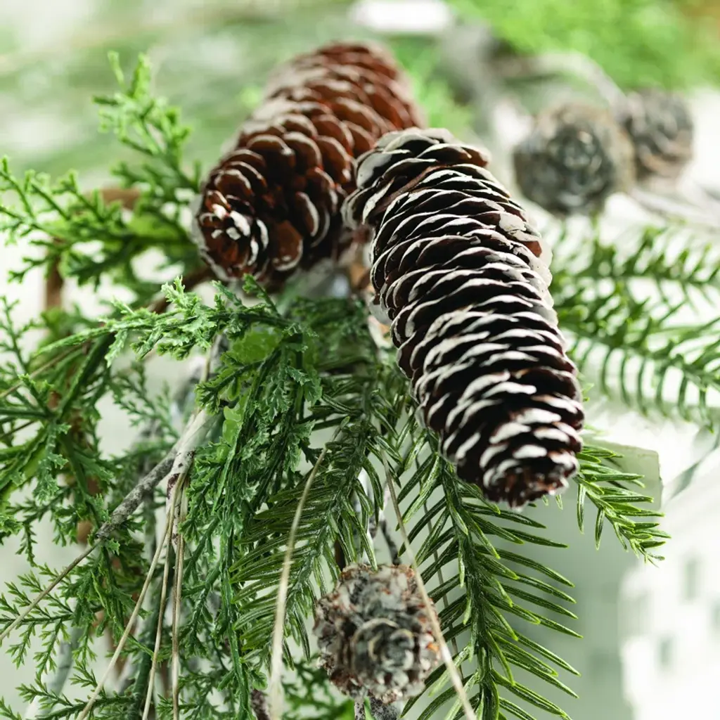 The clever mixture of cedar greens and classic pine and cones provides a casual look that fits any environment. The added texture and interest brought on by the twig accents give this garland a continuous flow of movement. Together, all the pieces create a look that is both classic and current.