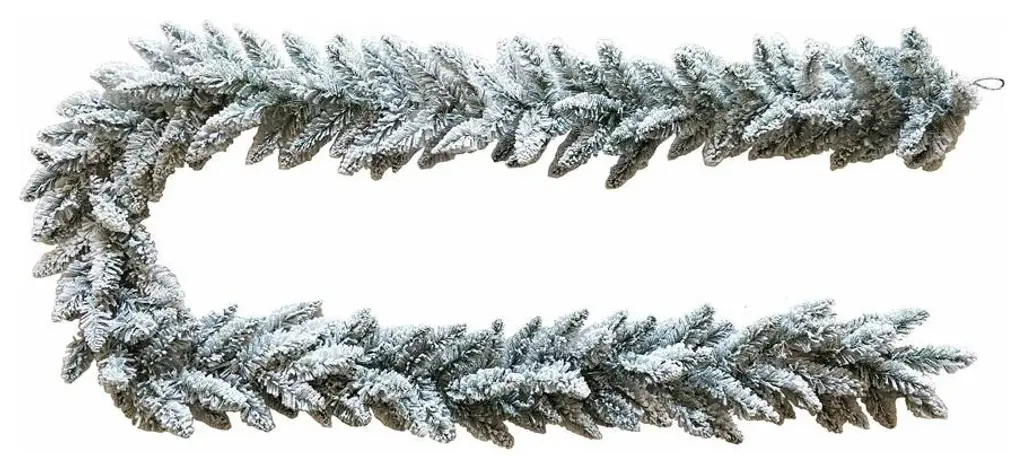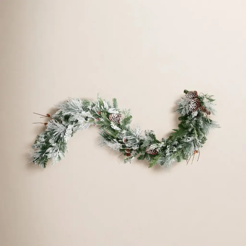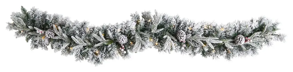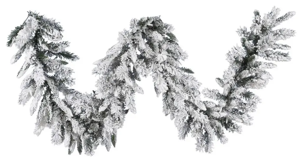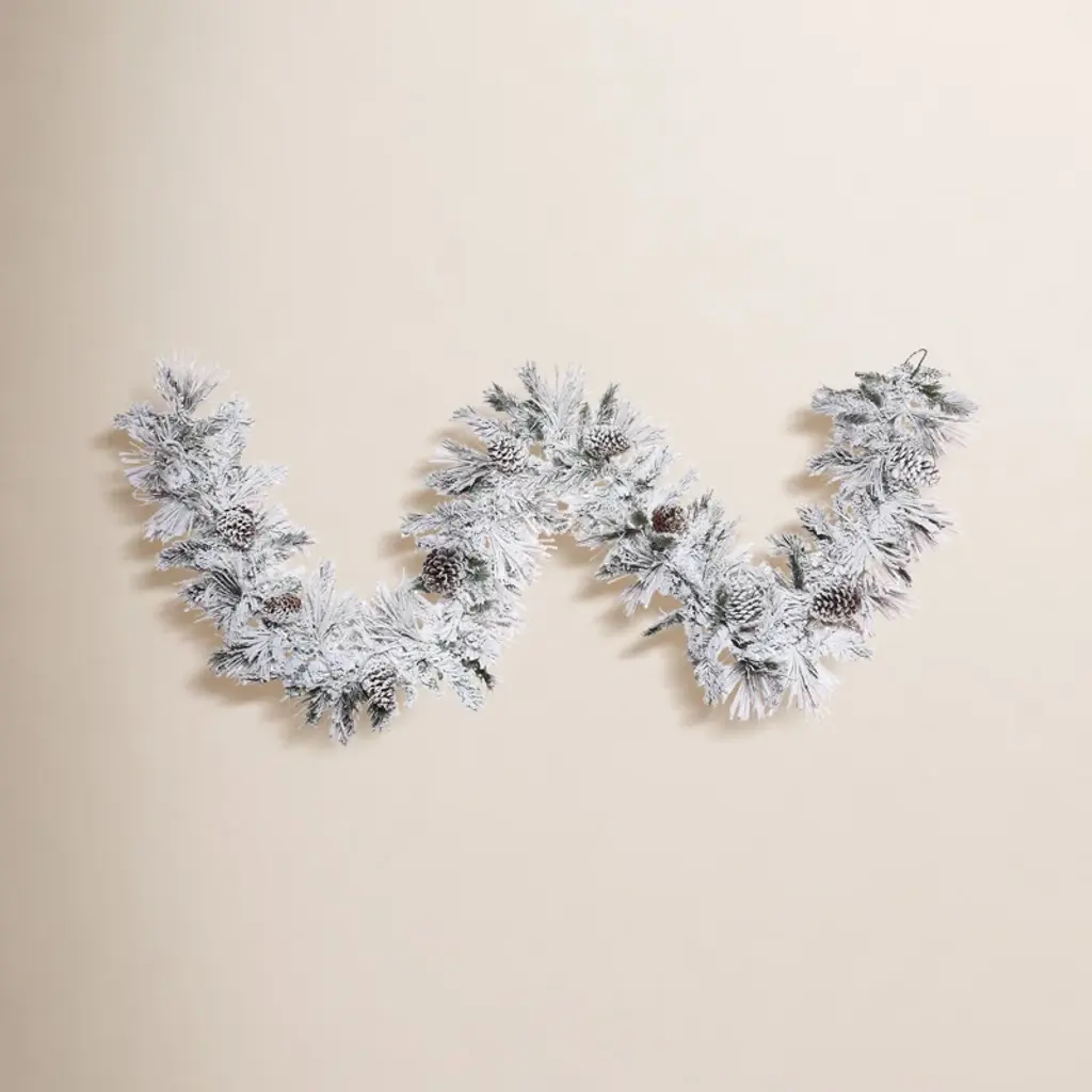 Vickerman 9'' x 18" Flocked Alberta Artificial Christmas Garland With 39 Pine Cones 210 Flocked White on Green PVC Tips. Wrap this garland around a banister or drape it over a mantle to create a cozy holiday feel. This frosty garland comes unlit, has beautifully flocked PVC tips on a flexible metal spine, and features realistic pine cone accents