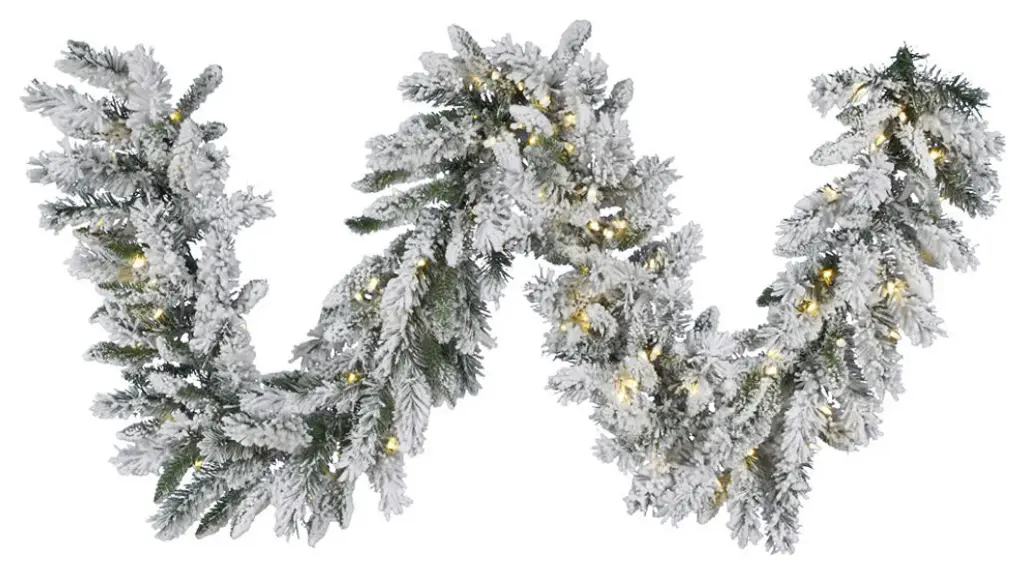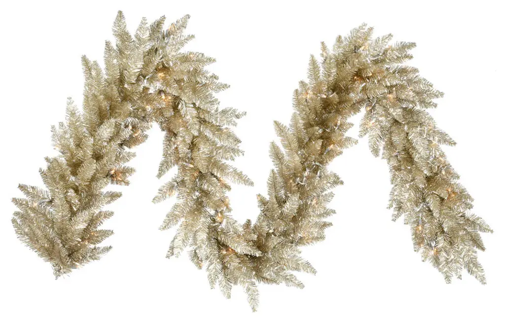 Vickerman 9'' x 14" Frosted Gold Artificial Christmas Garland 230 PVC Tips. A wonderful alternative to traditional green garlands, this amazing garland is made of brilliant Frosted Gold colored PVC tips on a flexible spine, it comes unlit, and makes the perfect accent for your tree, mantle, or stairway railing
