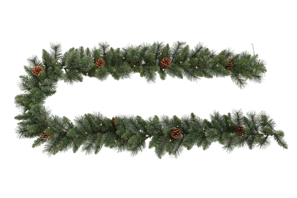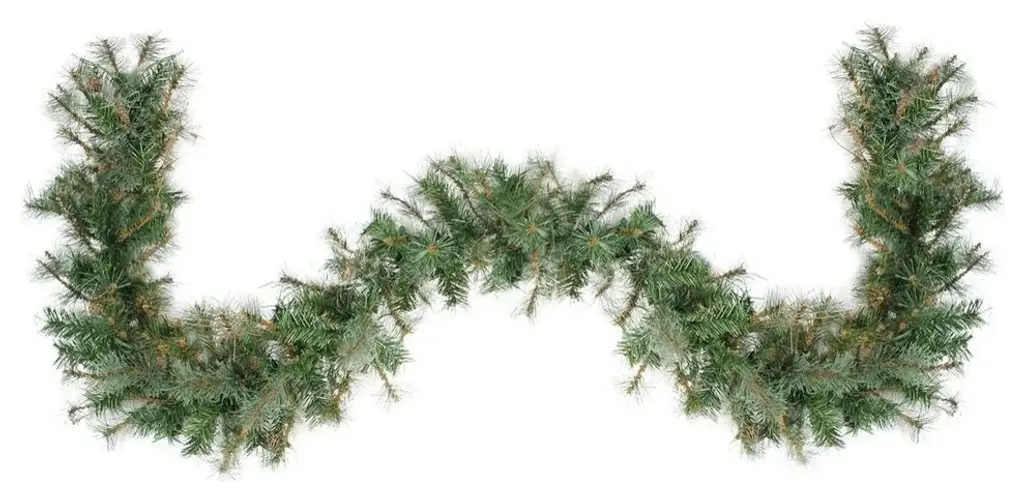 Vickerman 9'' x 12" Cheyenne Artificial Christmas Garland with 240 PVC Tips. Wrap this garland around a banister or drape it over a mantle to create a cozy holiday feel. This garland comes unlit and features traditional PVC tips on a flexible metal spine. The Cheyenne blend has a mixture of needle lengths, light to dark green needle tones, and incorporates pinecones to create a realistic look
