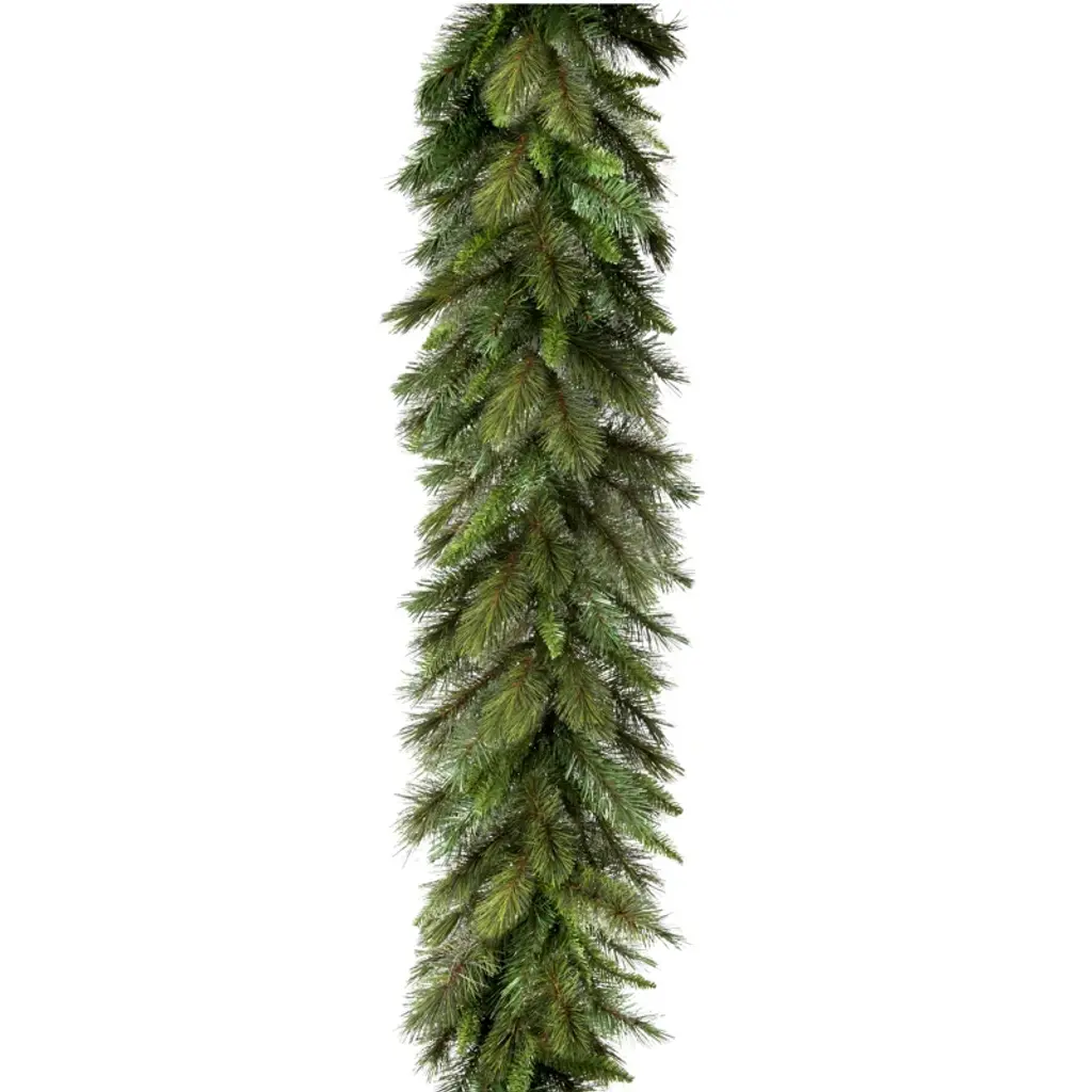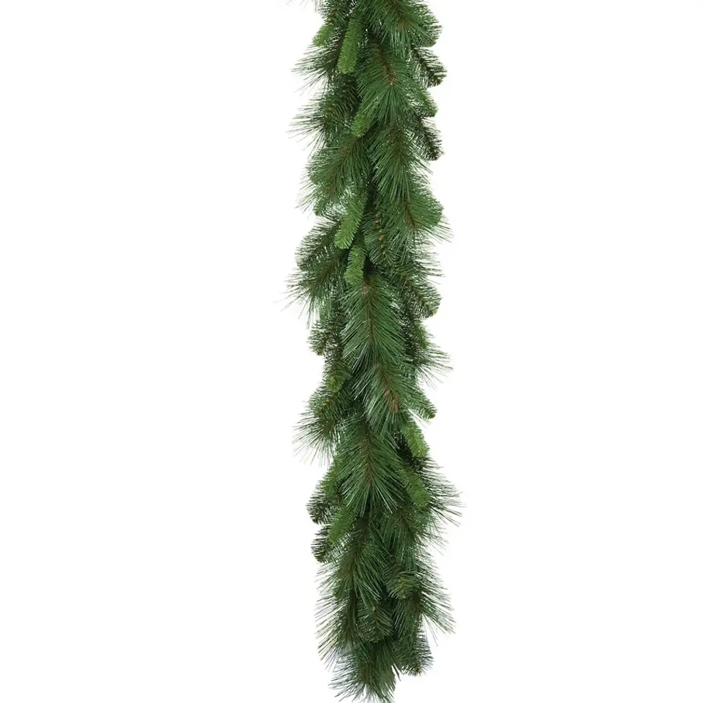 Vickerman 9'' x 16" Cheyenne Pine Artificial Christmas garland with real pine cones and 290 PVC tips. Wrap this garland around a banister or drape it over a mantle to create a cozy holiday feel. This garland comes unlit and features traditional PVC tips on a flexible metal spine. The Cheyenne blend has a mixture of needle lengths, light to dark green needle tones, and incorporates pinecones to create a realistic look