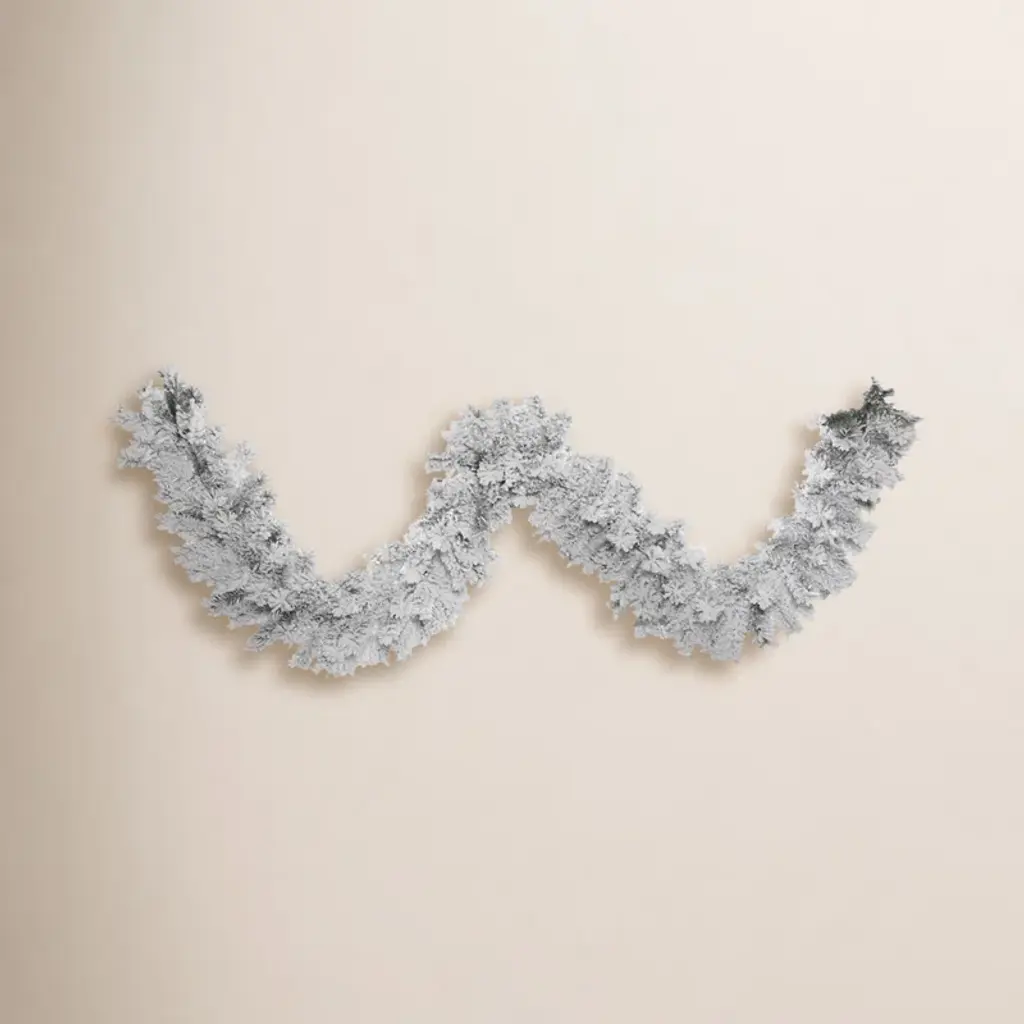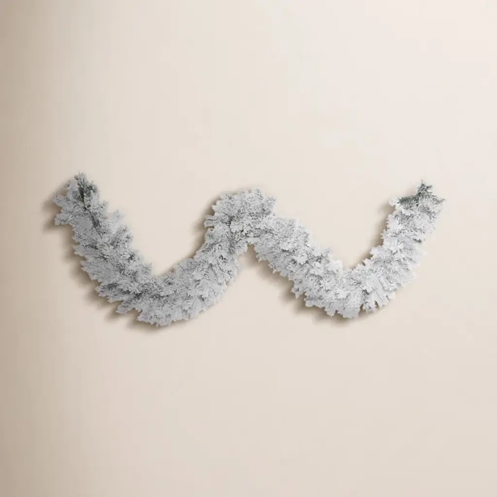 Vickerman 9'' x 16" Flocked Alaskan Pine Artificial Christmas garland with 220 PVC Tips. The flocked Alaskan tip features the combination of long luscious needles with heavy white flocking. Incorporate bright and modern holiday decor into your space with this beautiful garland. The garland includes wire throughout the spine and tips which allows you to create a custom shape, comes unlit and can be customized with your favorite lights, ribbons or Holiday picks