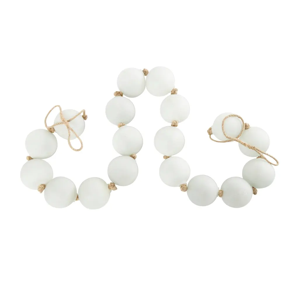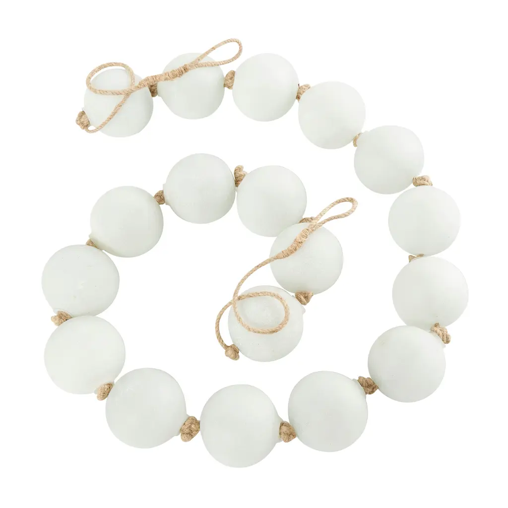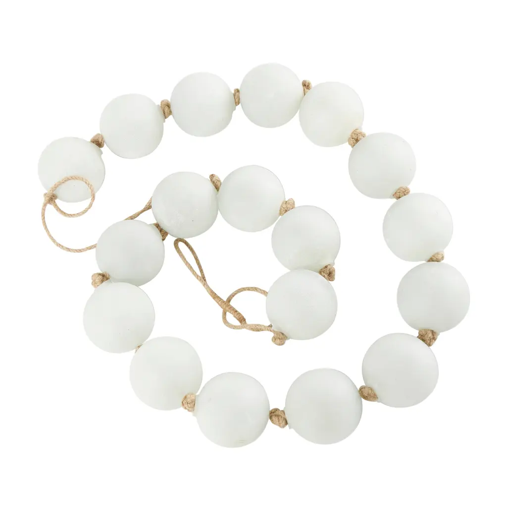 A warm and welcoming way to elevate the look of your tablescape and complement your existing decor. Give your surface space a finishing touch with these beautifully crafted decorative garland. Style this white glass garland draped across a mantle, console, or staircase, or feature it as a centerpiece in a large bowl to create a stunning visual impact and bring texture and dimension to the home. This item ships in 1 carton. This modern glass orb garland can be used year-round or for special occasions, serving as a captivating festive decoration. Glass garland with tassel makes a great gift for any occasion. Due to the handmade nature of these, there will be slight color, shape, and size variations, as well as loose fibers. Suitable for indoor use only. This item ships fully assembled in one piece. Made in India. This is a single white colored large beads with tassel. Coastal style.