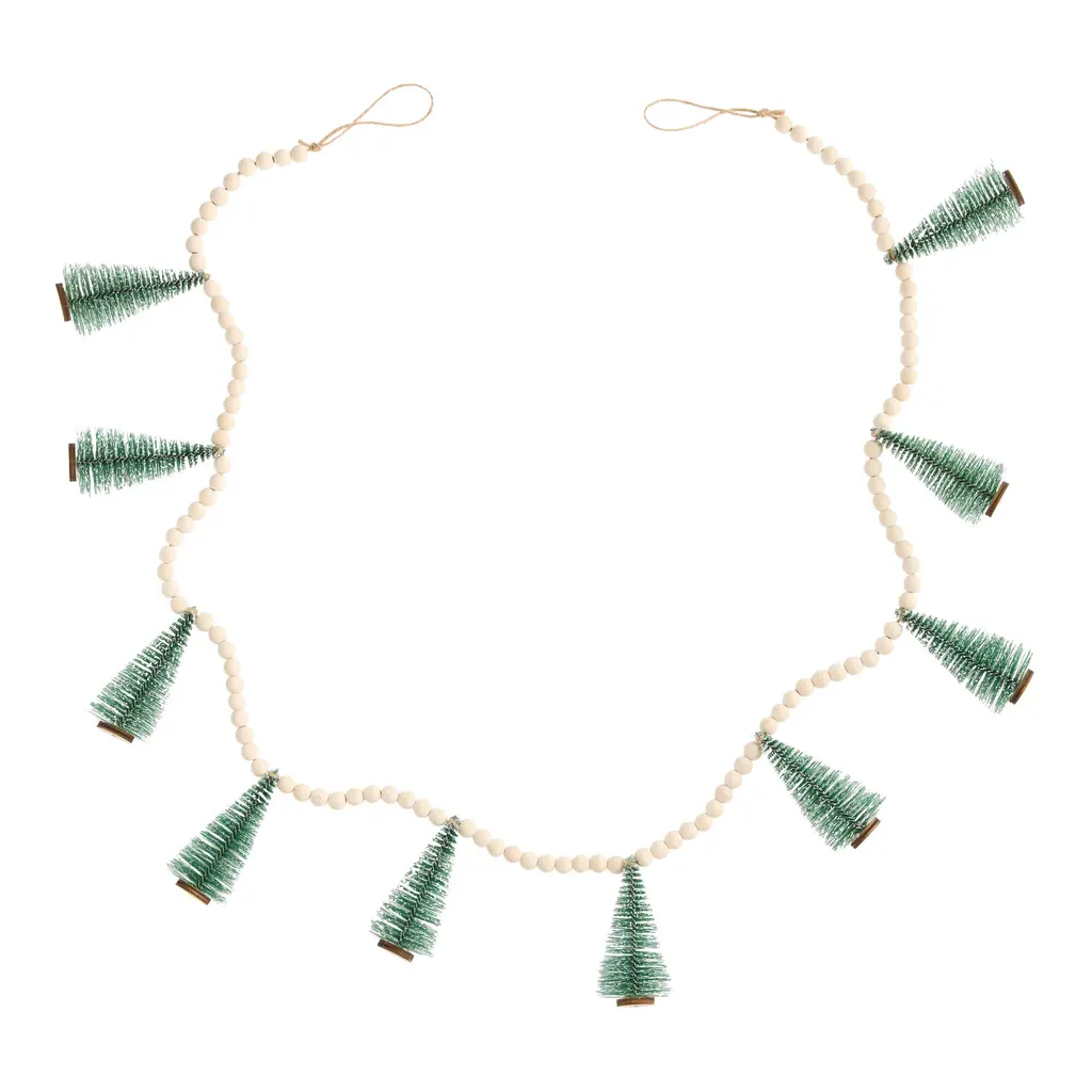 Woodsy, wintry style abounds in our textural garland, a mix of natural wood beads and miniature bottlebrush trees with snowy white-tipped branches. Hanging across your mantel or doorway, it brings forest-fresh beauty to the season.