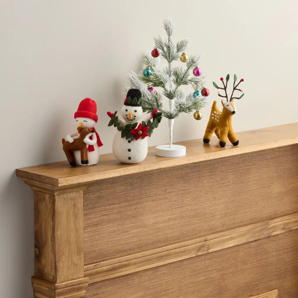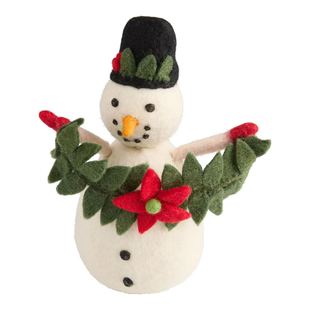 Fair Trade artisans in Nepal create this charming snowman by hand, using New Zealand wool to fashion everything from coal-black buttons to a carrot nose. An inviting addition to your holiday display, this festive, frosty decor dons a hat trimmed in leaves and berries and holds a garland of greenery accented with a bright red poinsettia.