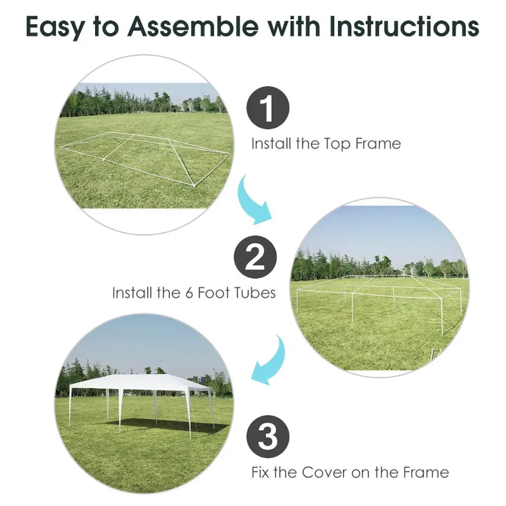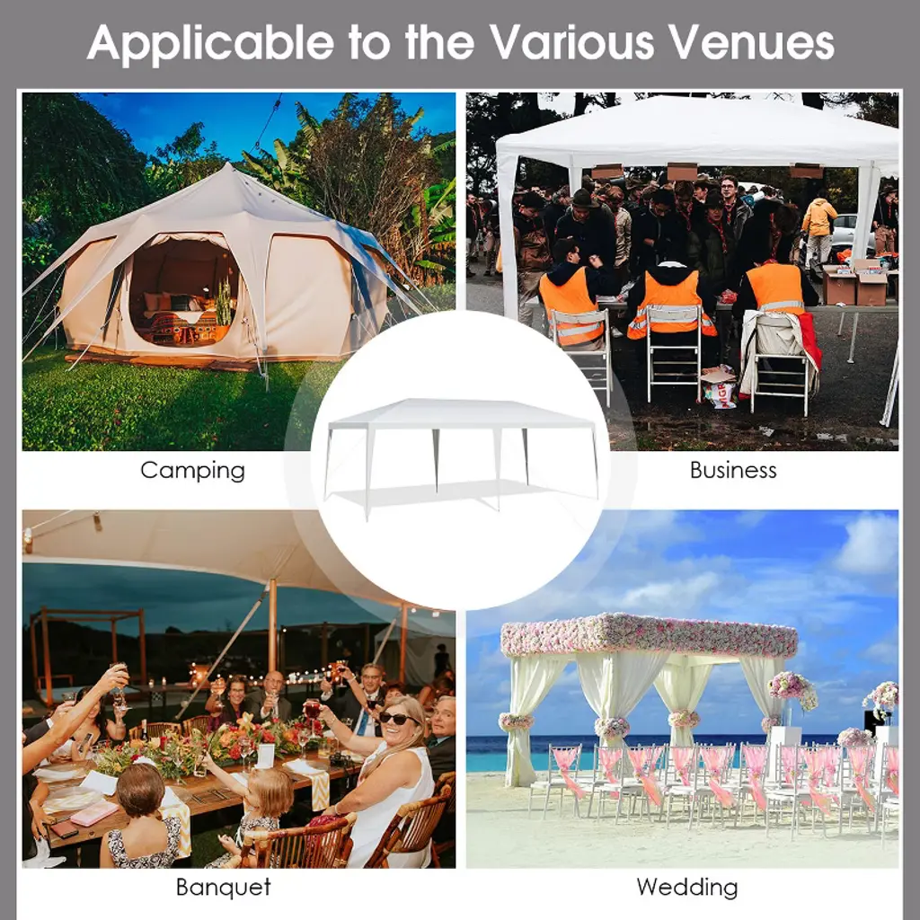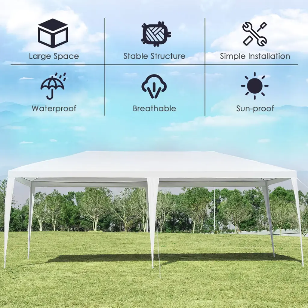 What if there is not enough space for your family members or friends to rest when you go out in a hot sunny day? Maybe our 10' X20' canopy is the perfect solution. This canopy is sturdy and sturdy with solid steel construction. The thick PE fabric is waterproof and sun-proof so you can use this tent when you go out for activities. And the canopy can be easily detached which is convenient for transportation and storage. Wind ropes and tent pegs ensure that the tent is stable enough in windy days. This party canopy is suitable for any outdoor occasions, such as picnic, camping, friends gathering and so on. Our tent is especially suitable for outdoor weddings because of its white appearance. Its spacious space will provide you with a wonderful shade, allowing you to enjoy the outdoor life even in the hot summer. FeaturesRust resistant powder coated steel framework for ultimate durability Weather-resistant PE fabric ensures long service life Waterproof and sun-proof design for better using experience Ventilation design provides you with fresh air Ideal for outdoor activities, such as camping, wedding, BBQ and commercial activities Large top cover offers comfortable cooling shade Spacious internal space for group of people to stay together Detachable design for easy storage and space-saving Bright white color can perfectly match with the outdoor environment Easy to assemble with detailed instructionsColor: White Cover Material: PE Frame Material: White powder coated steel (PE Connectors) Net Weight: 20 LBS Product size: 10' X 20' X 8.5' (L X W X H) Package included: 10'x20' wedding tent x 1 Instruction x 1