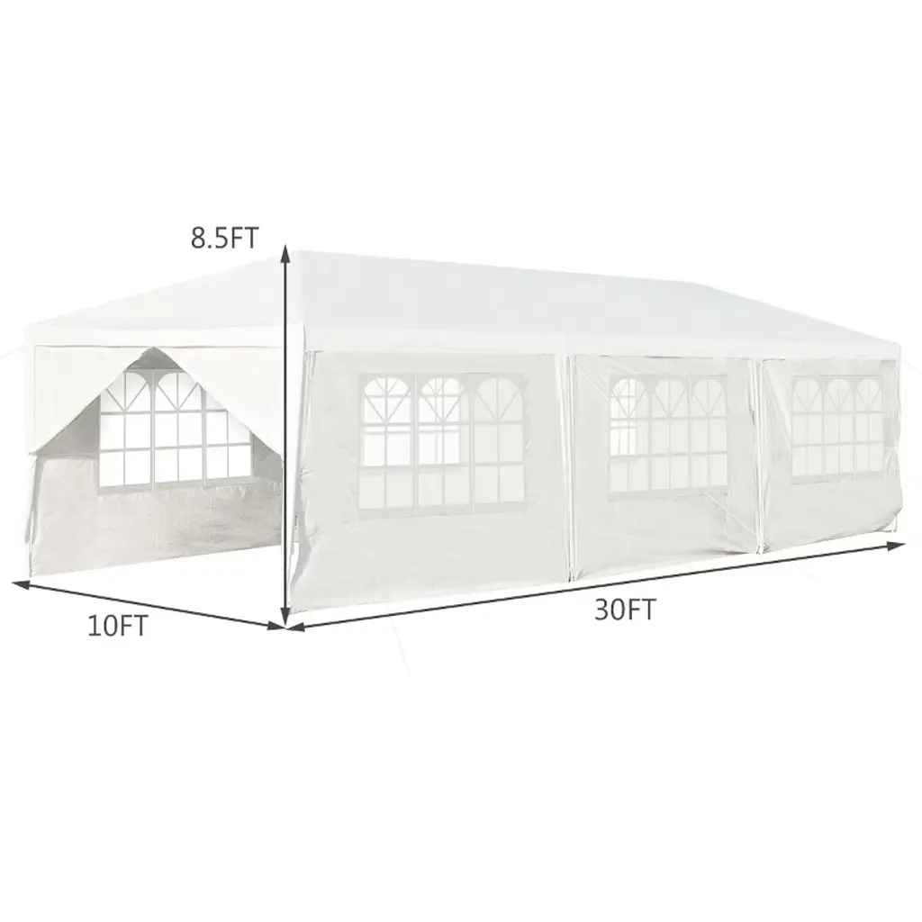 Are you finding a canopy for your outdoor space to provide shelter? Our practical canopy is good to be an indispensable company for you to hold outdoor activities. Made of power coated metal tube and premium PE, the canopy is sturdy and anti-rust for long time using. In addition, the whole canopy is connected with strong and thicker accessories so that the frame is stable after setting up. Comes with 6 removable sidewalls with transparent window, the canopy can keep warmer and also improve air ventilation inside. And there are also 2 doorways with two side zipper for easy access. You don't have to spend too much time to assemble the canopy if you set it up with other people. It is suitable to use for many activities like camping, picnics, outdoor sporting events and so on. You and your friends can really enjoy the outdoors with our canopy.Features10' x 30' canopy is large enough to hold many people Premium and thick PE ensures sun protection and rainproof Powder-coated steel frame to make the tent sturdy and durable Strong and thick connections to keep the canopy stable 6 removable sidewalls with nylon fasteners to meet your different needs 2 doorways with zipper for easy access Easy to assemble the canopy with buckle by following instructions 16 pieces high-quality metal stakes to fix canopy to the ground tightly 8 long ropes can hold the canopy and add stability Perfect for having outdoor activities such as parties, picnic, camping or weddingMaterial: steel, PE Color: white Dimension of Canopy: 10' x 30' x 8.5' (L x W x H) Package Include: 10' x 30' tent x 1 Instruction x 1