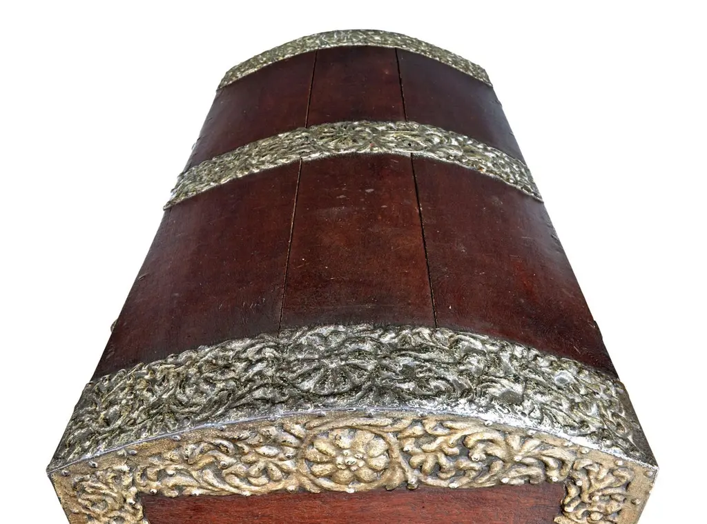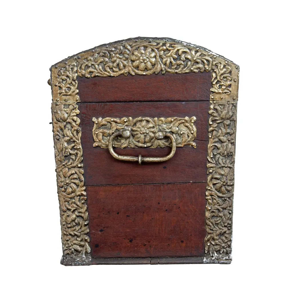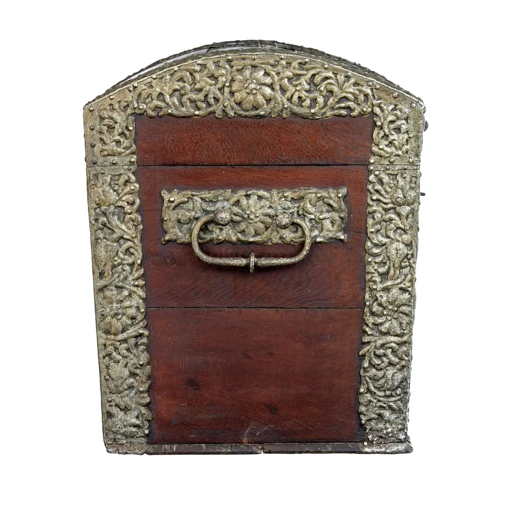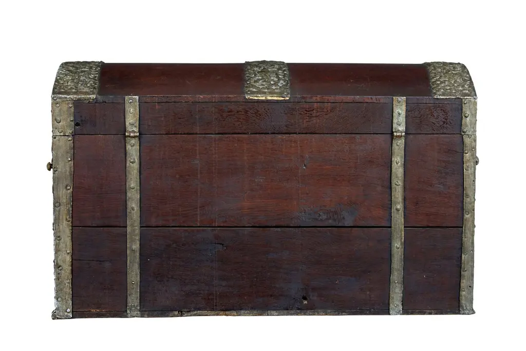 18th century Danish oak dome top coffer circa 1790.Beautiful dome top coffer made from solid oak, and decorated with ornate strap work. Lid opens to reveal a partially fitted interior consisting on a candle box.Strap work on both ends and over the middle, which is continued with the carrying handles each end. Original key and working lock. Traces of original hand painted gilt motifs to the front surface.Expected minor age shrinkage in between wood joins, minor surface marks and discolourations to metal work. Structurally strong and ready for everyday use.