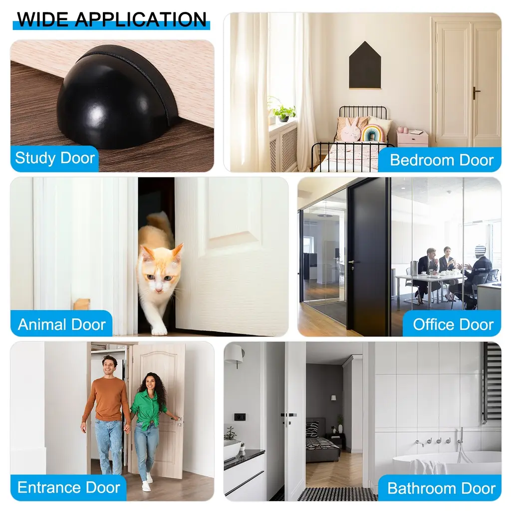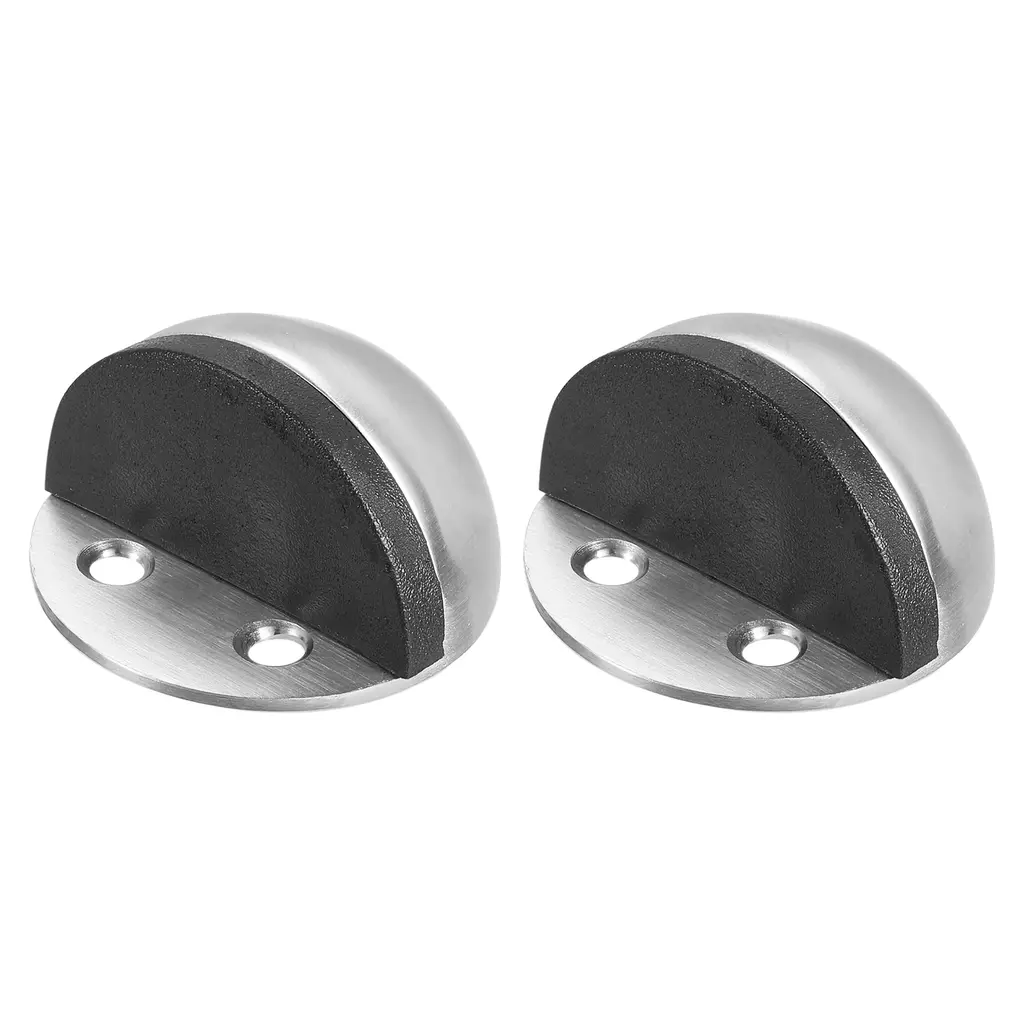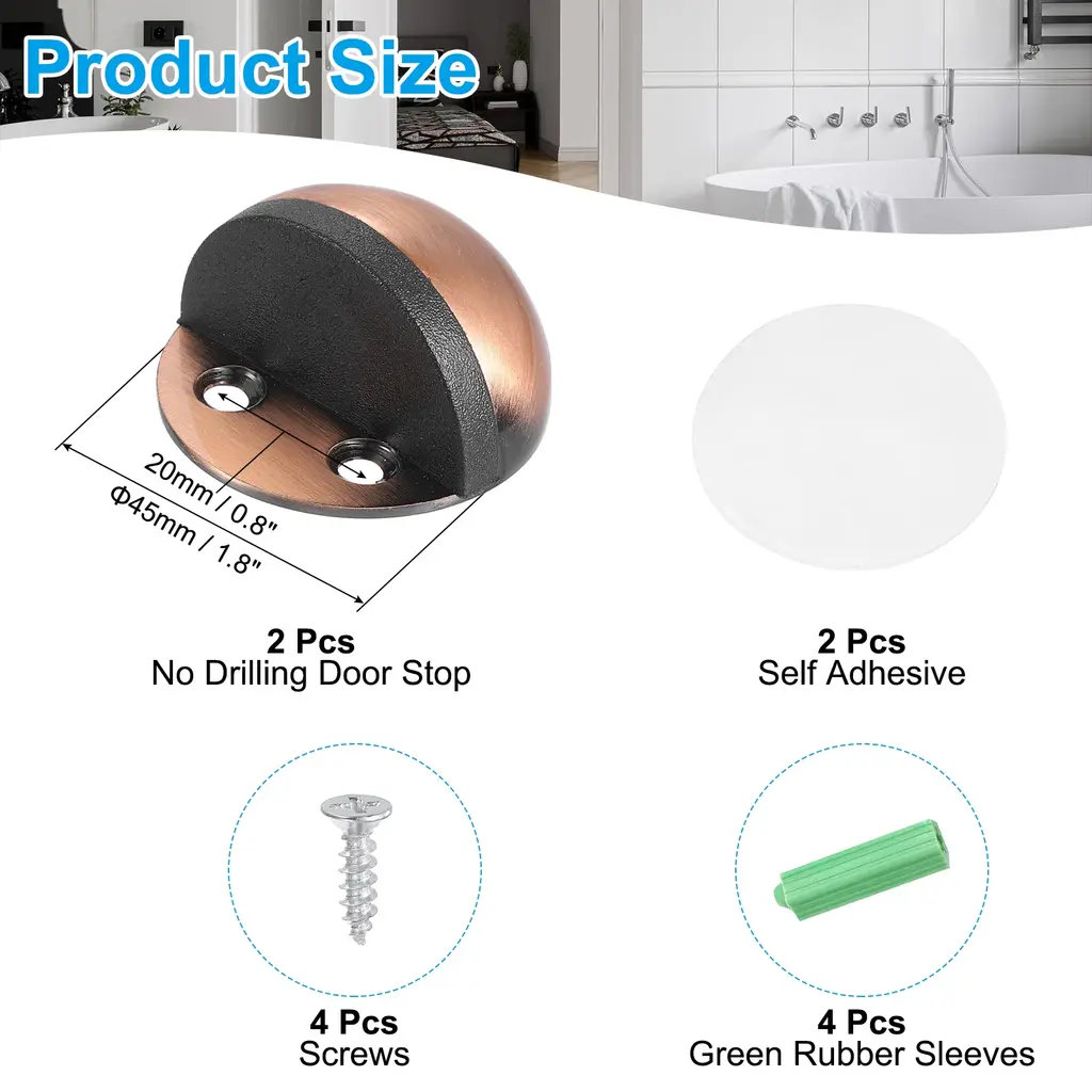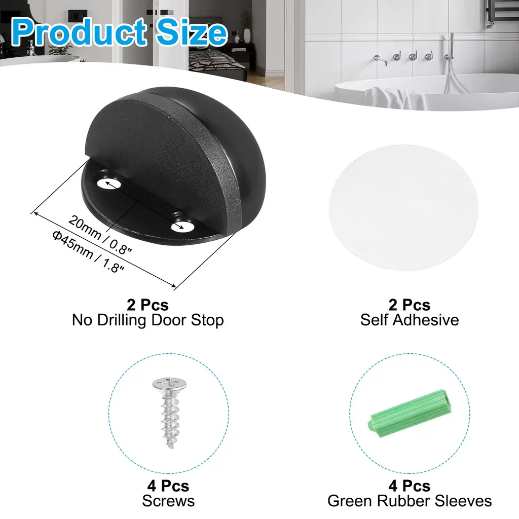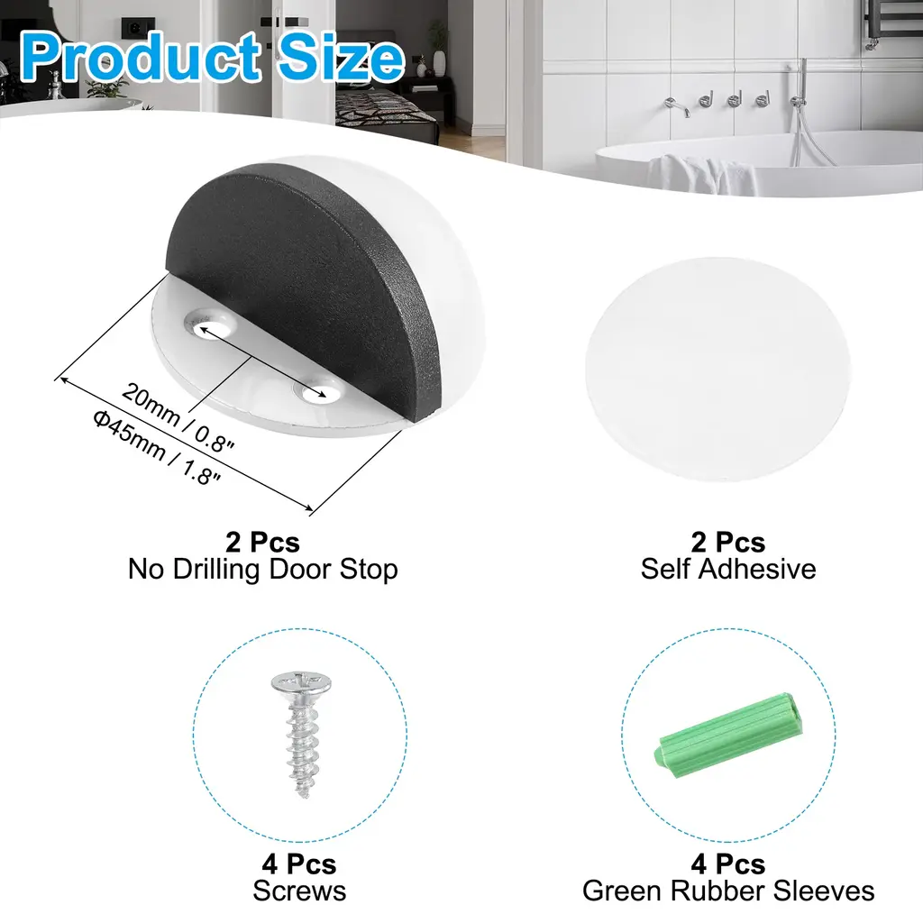 The door stopper is suitable for many occasions, including home, bedroom, nursery, bathroom, office, entrance, hotel, apartment, or other places. It is also good for French, sliding, barn, glass, garage doors, and more.SpecificationColor: SilverMaterial: Stainless SteelHole Center Distance: 20mm/0.8inchOriginal Plate Diameter: 25mm/1inchLength: 45mm/1.8inchPackage List: 2 x No Drilling Door Stop, 4 x Screw Mount, 1 x Self Adhesive, 4 x Rubber SleevesAdvantageDoor stop flooring protects your door handles from damaging walls and prevents pet damage, which can cause damage to doors and walls. It also can be used to hold doors open when needed.InstructionDoor stop provides screws and self-adhesive double-sided tape two installation methods, it is recommended to choose the screw installation that is more solid and durable.NOTE: Self-adhesive stickers are recommended for flat surfaces such as tile, metal, wood, and glass and are not good for dusty or wet areas.
