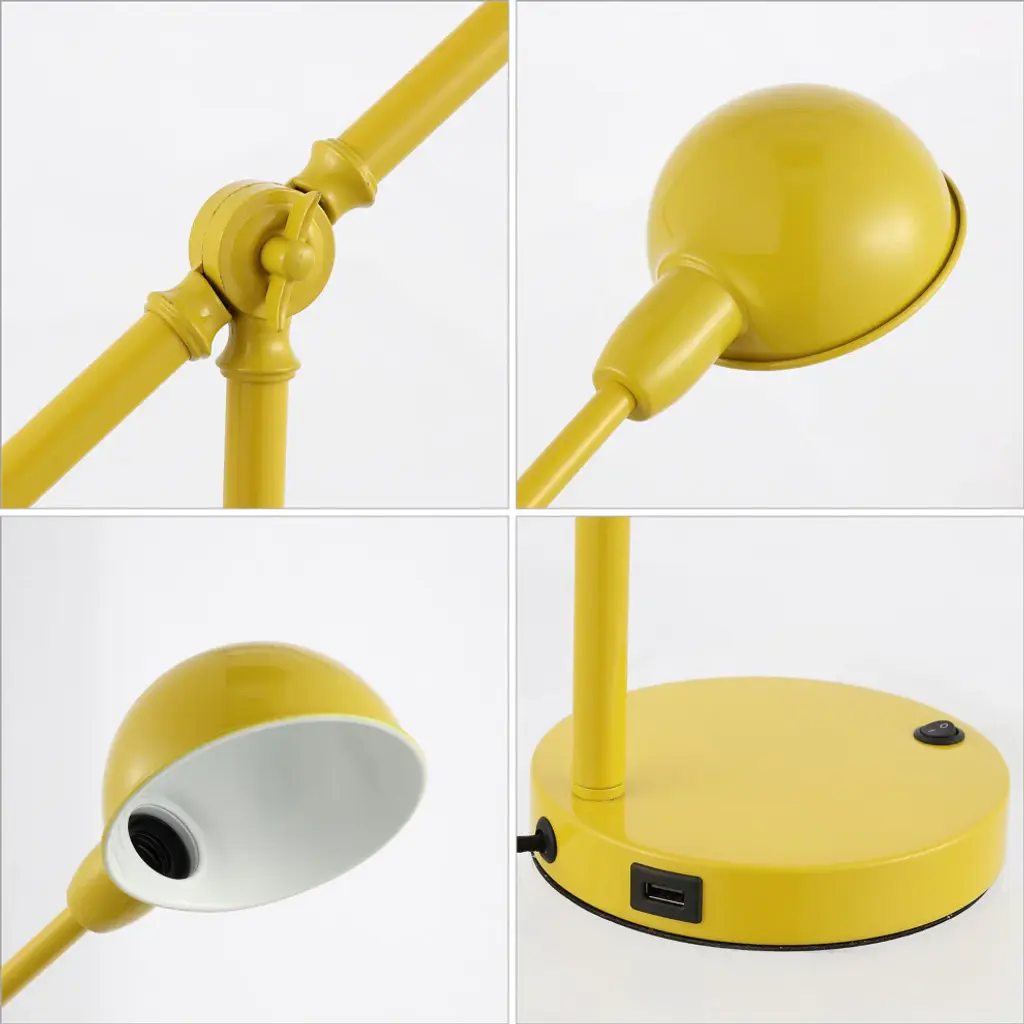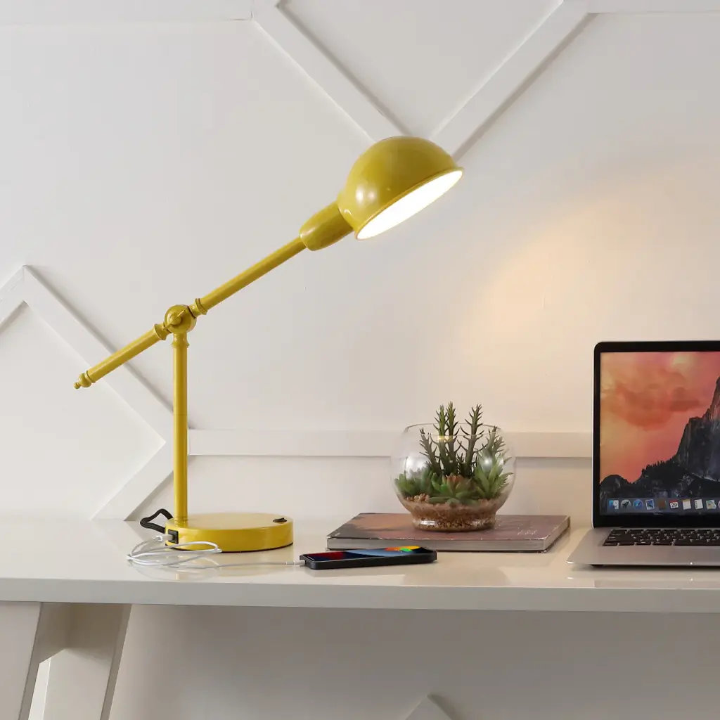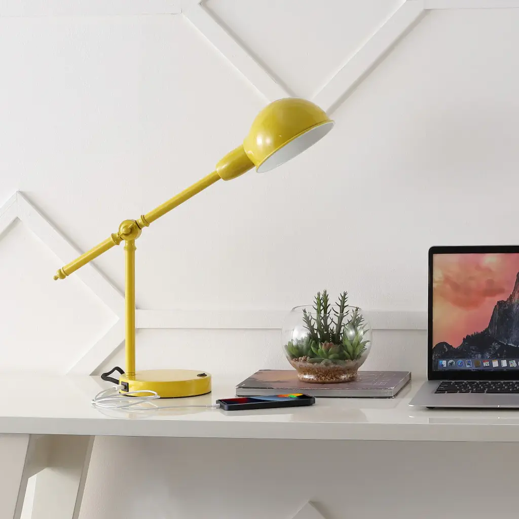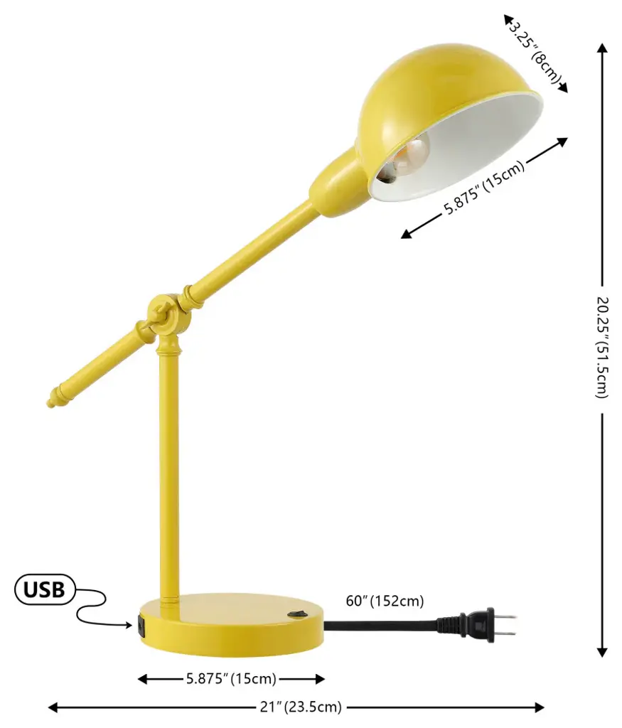 Upgrade your living room, home office or bedroom with our vintage-inspired task lamp. It has an adjustable shade and Edison-style LED bulb for warm, bright light; a built-in USB outlet lets you recharge mobile devices. This classic desk or bedside lamp adds a mid-century touch to any room.Features:• Classic yellow finish with white interior on the shade is perfect for a traditional farmhouse or modern interior• Quality touches include a metal shade, USB charging port and silk-wrapped cord• This lamp''s retro style and handy features make it ideal for vacation homes and hospitality projects• Eco-friendly 4W LED bulb included• Takes 1 bulb and compatible with TYPE "A" 40W or CFL 13W or LED 9W• Color: Yellow• Body Material: Metal• Includes: One (1) lamp• Assembly RequiredDimensions:• Lamp: 20.25 inches high x 5.88 inches wide x 21 inches deepAbout us:You see a lamp.We see a decorative work of art.A perfectly curved shade casts a dramatic shadow on a floor. Compatible with LED lightbulbs: as easy on the environment as they are on the eyes. The JONATHAN Y Lighting collection considers every detail from impeccably sourced materials to designer styling. And our prices are so attractive, we''ve transformed a functional necessity into a fashion accessory.JONATHAN Y Lighting - a fashion revolution in home decor.