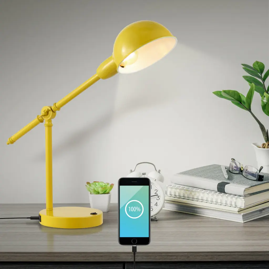 20.25" Iron Adjustable Dome Shade Led Task Lamp With Usb Charging Port, Yellow