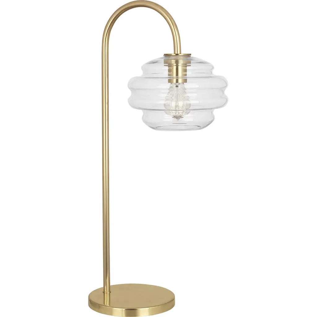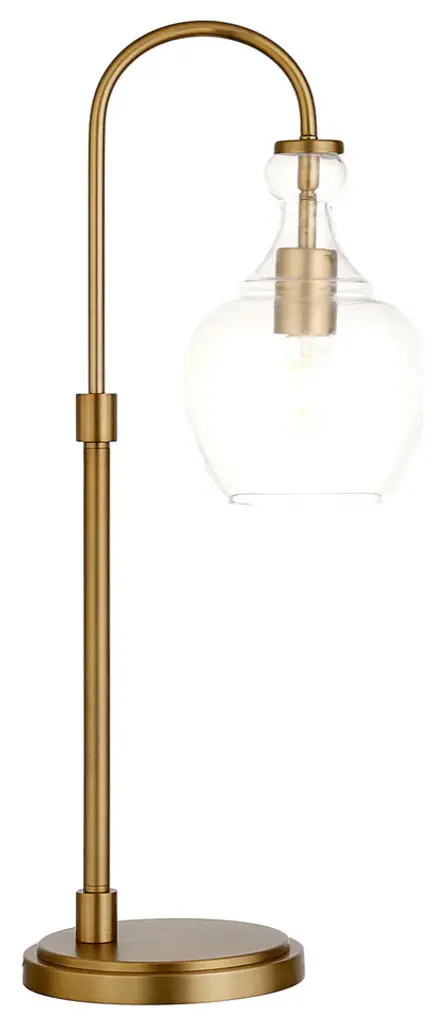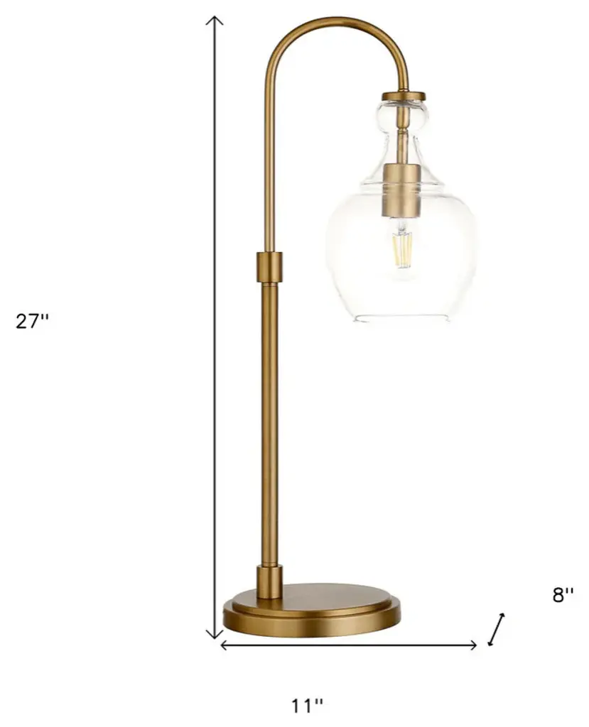 Add a bright anchor to your room with this 27-inch brass metal arched table lamp with clear dome shade. The base of this lamp is made of brass metal. The clear dome glass shade is a great compliment to this lamp. A sophisticated take on a classic, this arched table lamp is a great option for a unique look. The light that this lamp throws is soft and warm to elevate the look of most any space in your home. Bring some lite and good vibes into your space with this updated and stylishly designed lamp. 27-inch H x 11-inch W x 8-inch D