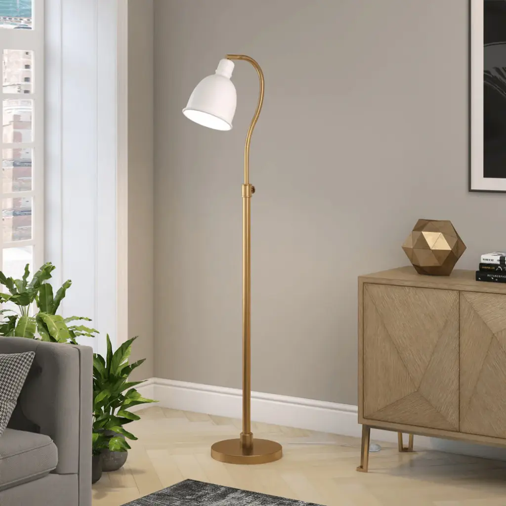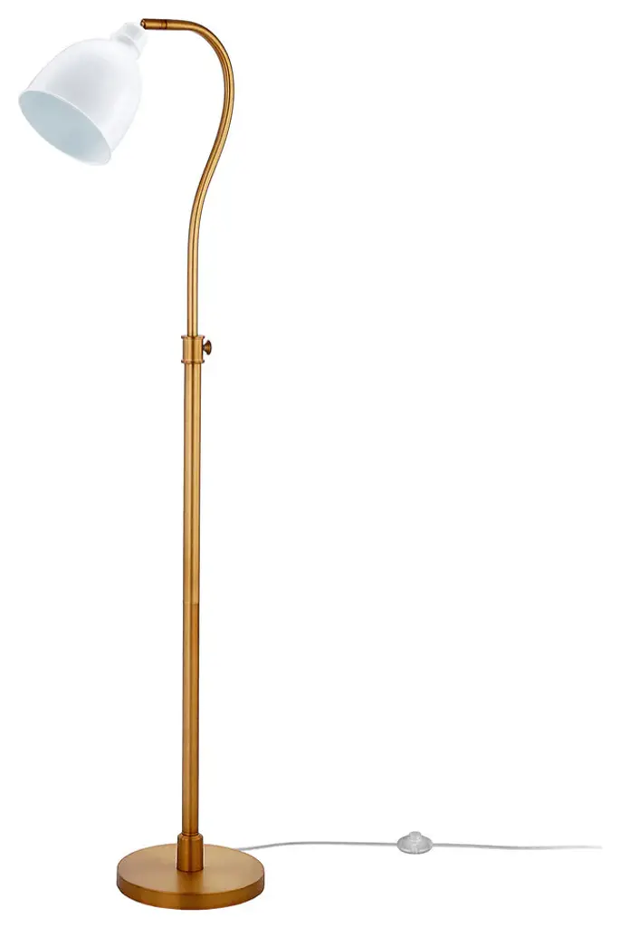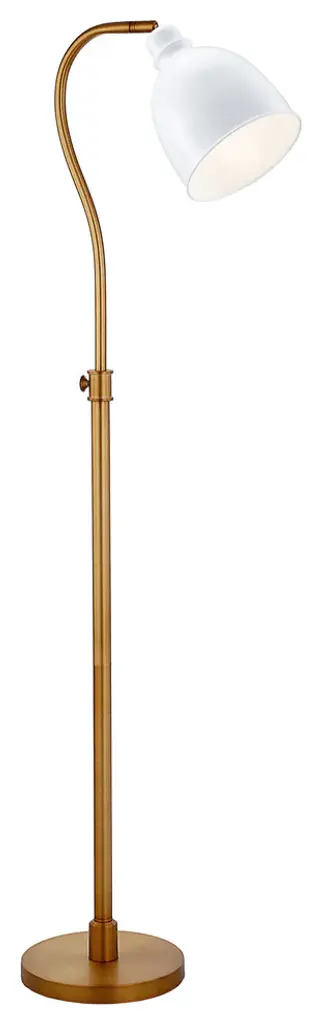 Truly a mix of design and functionality that doesn''t compromise on style, this 68" brass adjustable reading floor lamp with white frosted glass dome shade will be a great addition to your space. The base of this lamp is made of metal finished in a brass tone. The brass base coloring infuses a warm and rich tone to your space. This good looking lamp includes a metal dome shaped shade. Next to your desk or favorite chair this single base task/reading lamp is designed to make your work or activities easier with concentrated light in just the space you need it. Use this lamp anywhere and elevate the look of the whole space. Bring some lite and good vibes into your space with this updated and stylishly designed lamp. 68" H x 11" W x 16" D