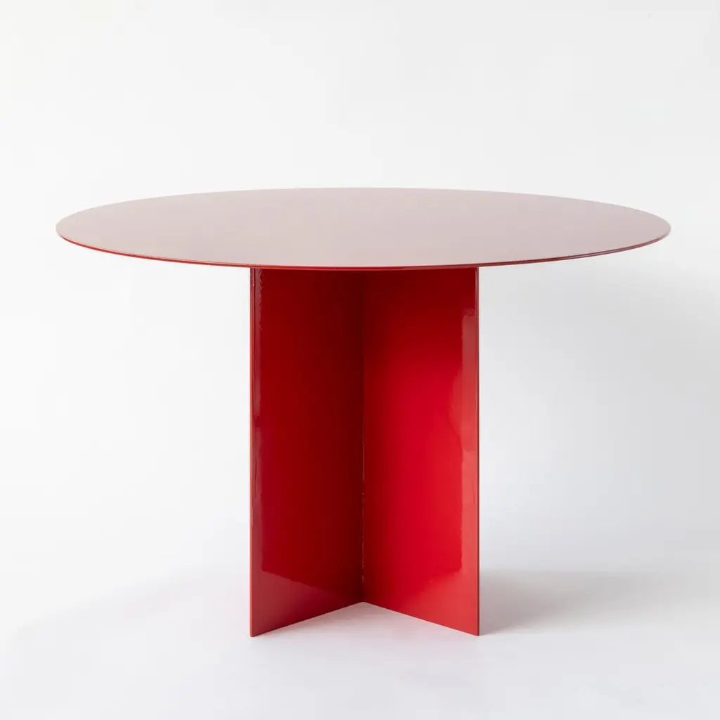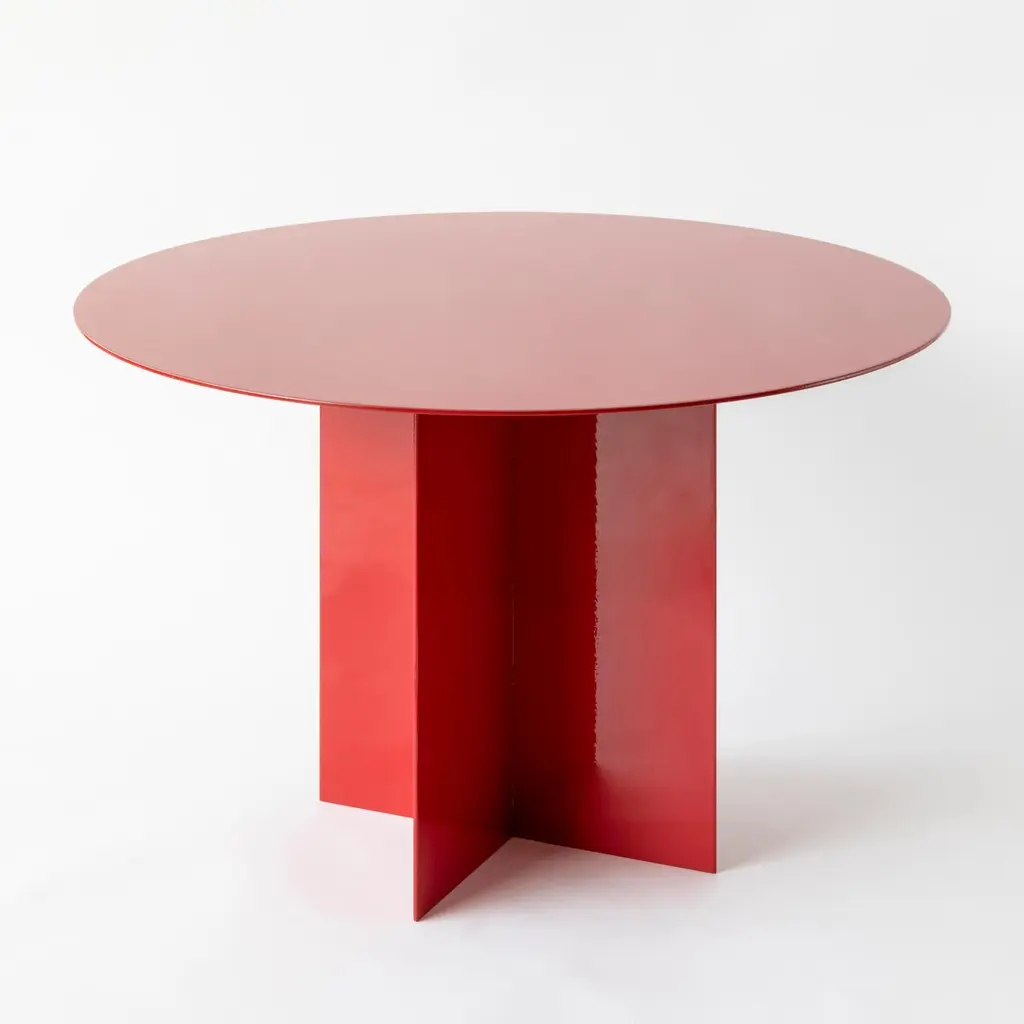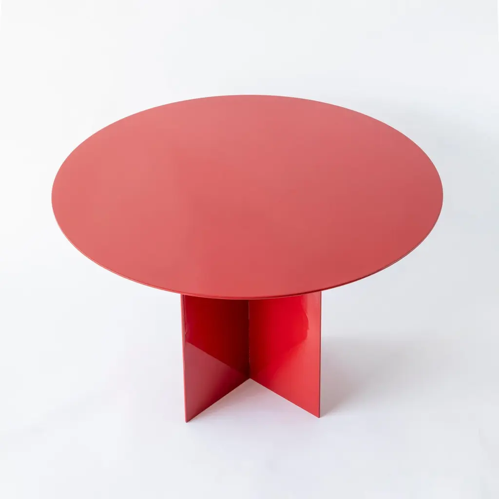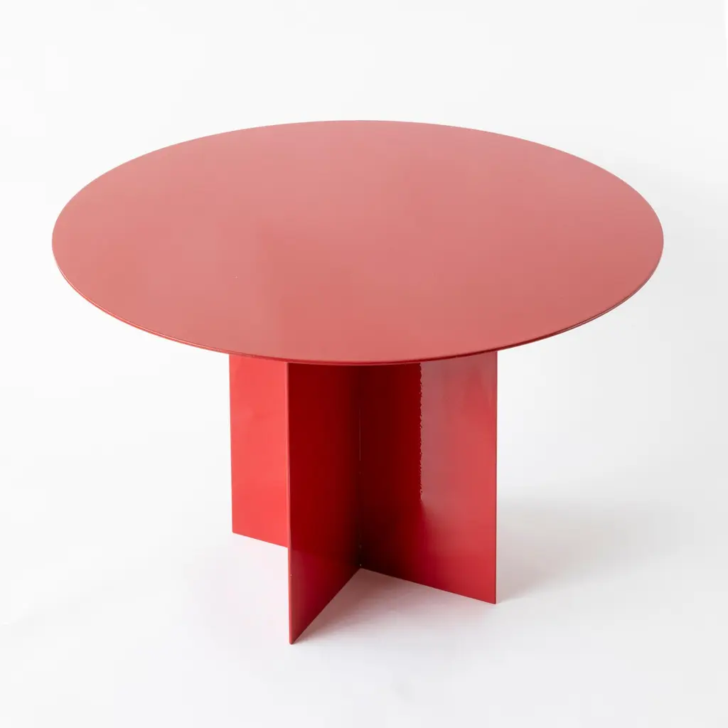 Across Large Round Red Coffee Table by Secondome EdizioniDesigner: Claudia Pignatale.Dimensions: Ø 45 x H 50 cm.Materials: Iron.Collection / Production: Secondome. This piece can be customized. Available finishes: any RAL color. Please contact us. An iron origami that seems light, a game of cross-shaped forms and surfaces of any geometric shape define this collection of tables, characterized by a feature common to all my protects: colour.The cross-shaped base fits any shape of top, all produced with a 3mm metal plate of customizable colour, a project in the making, a construction game in which the end user is free to create their own custom table, a project within a project.THE GALLERYSecondome is a Design Gallery focused on contemporary designers and innovative projects worldwide.Founded by Claudia Pignatale in 2006, Secondome produces its own collection of Furniture and objects working to launch experimental designers, artisans and master craftsmen. Its mission lies in highlighting both the high quality manufacture of the Made in Italy brand and the originality of products, emphasizing the tradition of Italian craftsmanship whilst breaking the mold of lifeless objets d’art.The artisanal nature of Secondome’s production makes each piece individual and highly personalized.