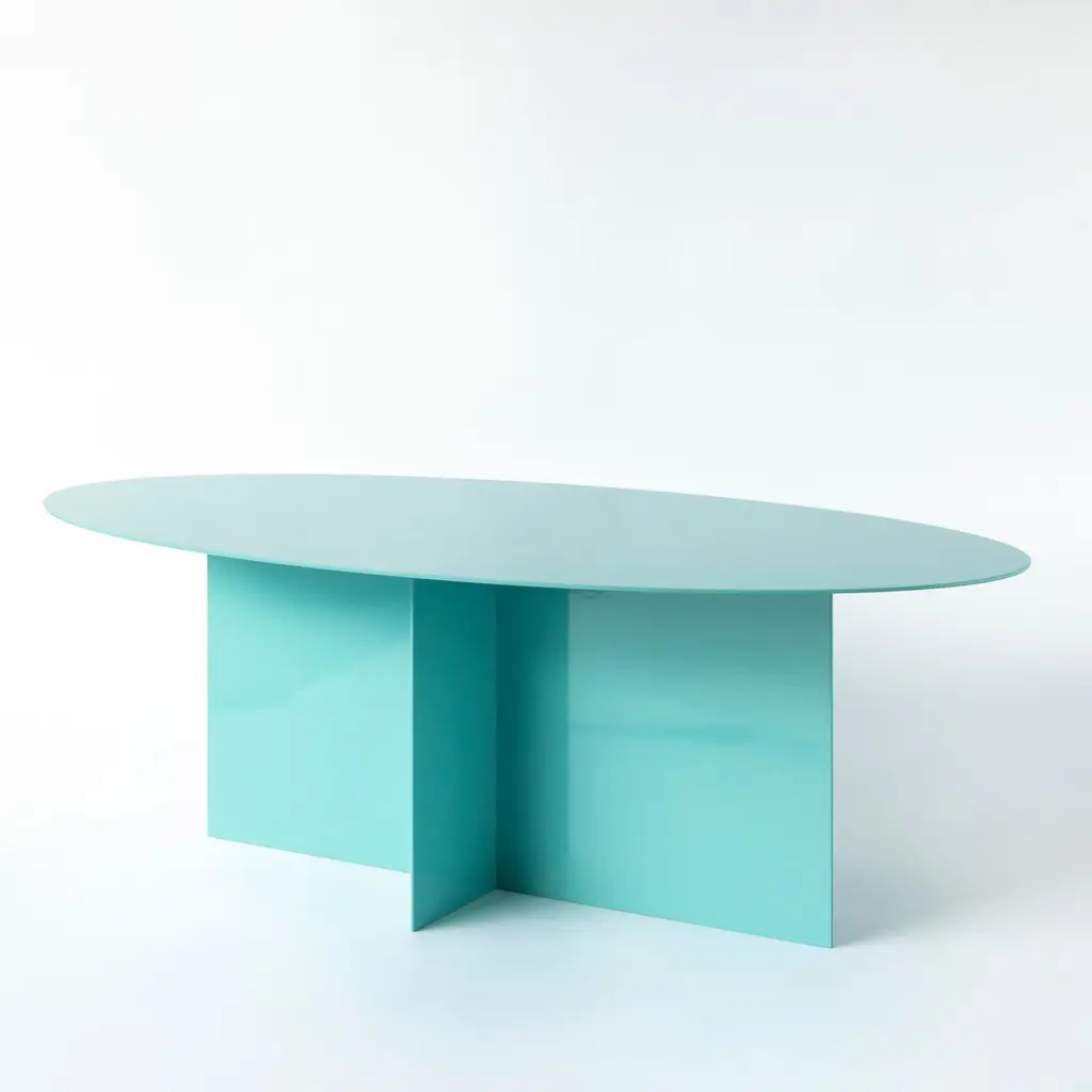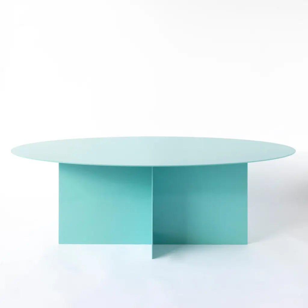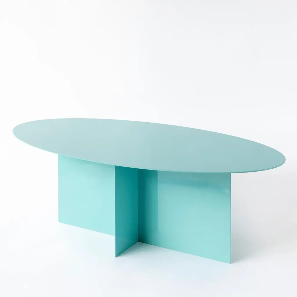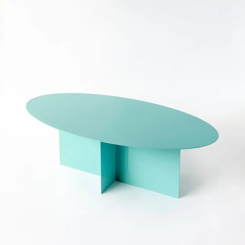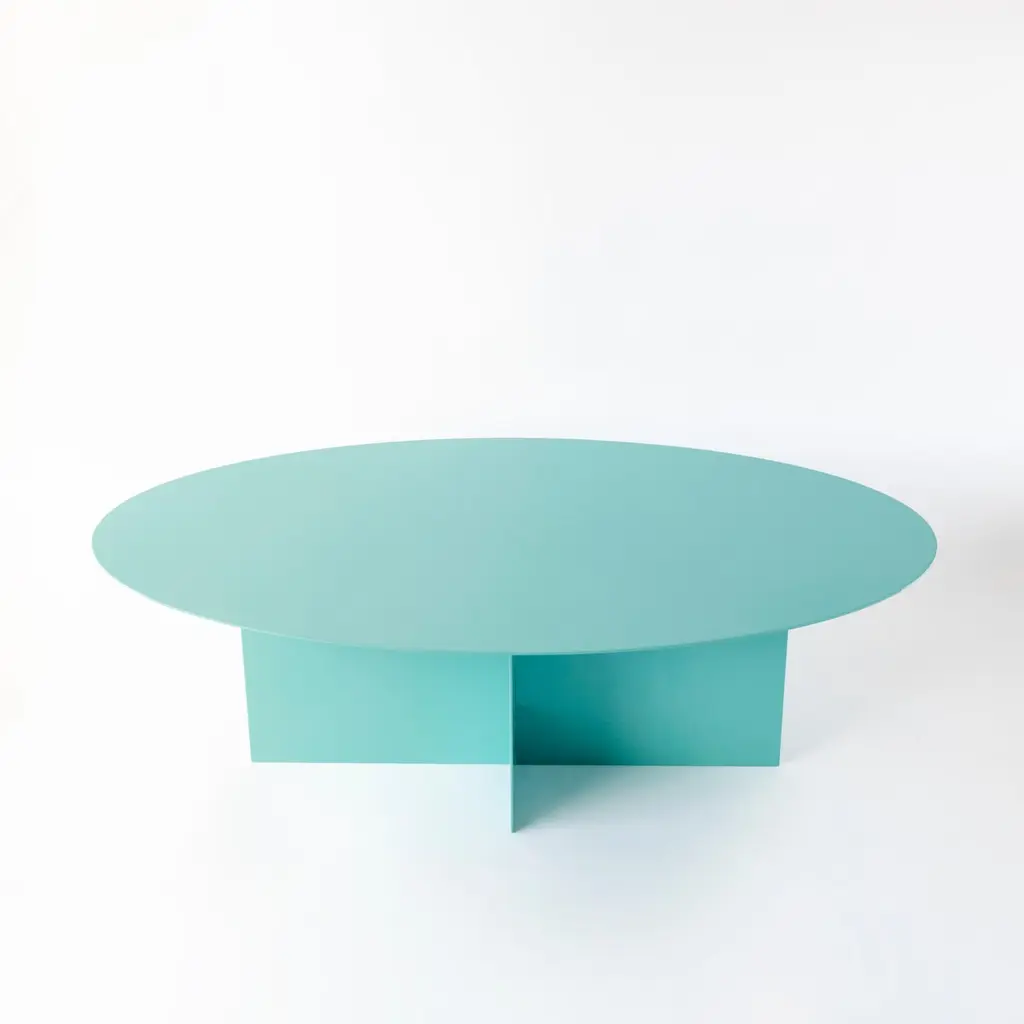 Across Oval Light Blue Coffee Table by Secondome EdizioniDesigner: Claudia Pignatale.Dimensions: D 45 x W 90 x H 37 cm.Materials: Iron.Collection / Production: Secondome. This piece can be customized. Available finishes: any RAL color. Please contact us. An iron origami that seems light, a game of cross-shaped forms and surfaces of any geometric shape define this collection of tables, characterized by a feature common to all my protects: colour.The cross-shaped base fits any shape of top, all produced with a 3mm metal plate of customizable colour, a project in the making, a construction game in which the end user is free to create their own custom table, a project within a project.THE GALLERYSecondome is a Design Gallery focused on contemporary designers and innovative projects worldwide.Founded by Claudia Pignatale in 2006, Secondome produces its own collection of Furniture and objects working to launch experimental designers, artisans and master craftsmen. Its mission lies in highlighting both the high quality manufacture of the Made in Italy brand and the originality of products, emphasizing the tradition of Italian craftsmanship whilst breaking the mold of lifeless objets d’art.The artisanal nature of Secondome’s production makes each piece individual and highly personalized.