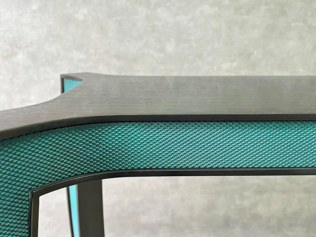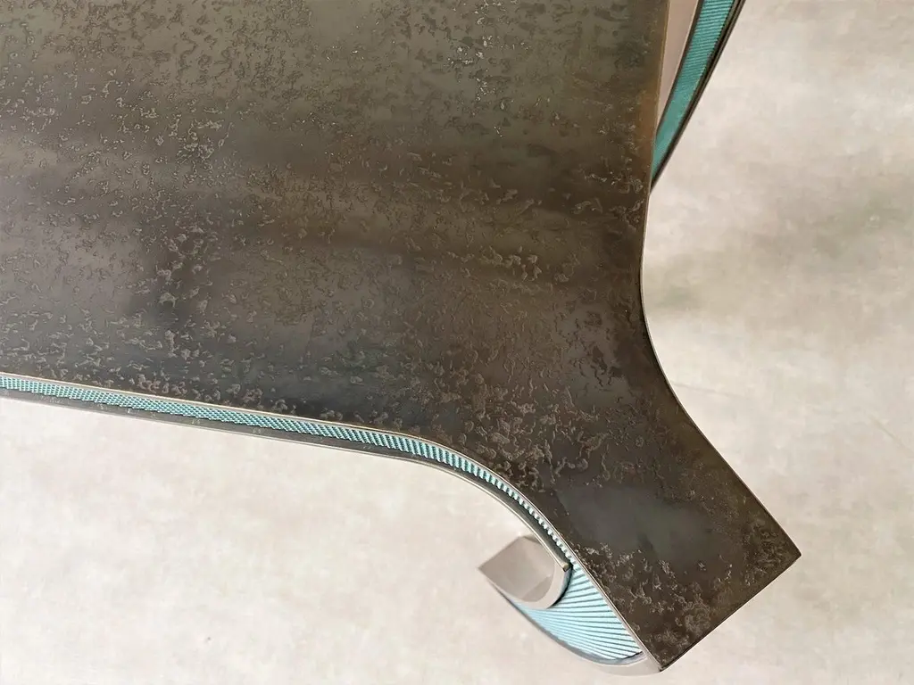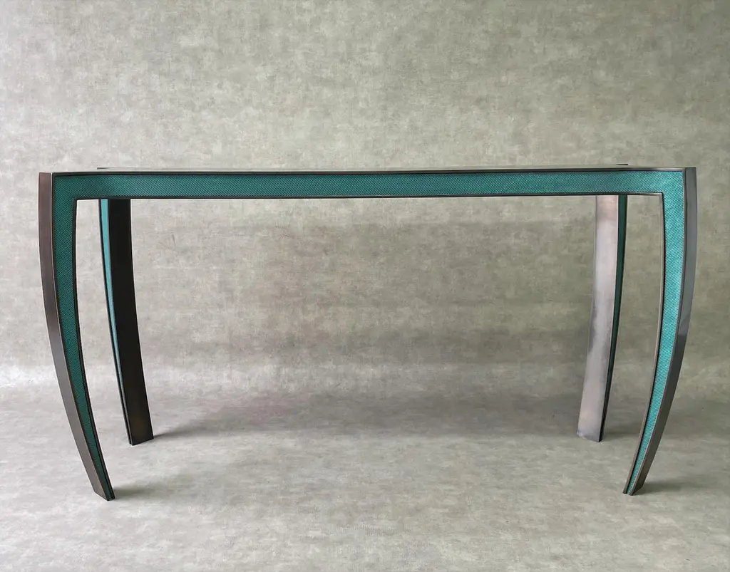 Solid oak console clad entirely in bronze. Here the artist juxtaposes the brown of bronze medal against the green of antique bronze. The tabletop showcases algae impressions. The lateral strips are chiseled by hand to depict a diamond motif.Dimensions : L 140 cm x H 90 cm x D 36 cm // L 55.12 in x H 35.43 in x D 14.17 in.Limited edition of 8 (production time: 15 weeks)Over nearly 20 years, French artist Frédérique Domergue has created a unique body of work based on combinations of metal and rare wood species. She learned traditional woodworking and metalworking techniques from master artisans, and quickly developed her own skillful approaches, especially metal cladding which has become her hallmark.Frédérique Domergue uses thin sheets of metal that hug the contours of the wood (which she sometimes sculpts beforehand) to create a "second skin". The artist creates astonishing effects by transforming metal into a material that appears supple and elastic. She draws on her extensive expertise with a wide range of metals (bronze, zinc, titanium, steel, etc.) to achieve surprising results. She sometimes uses oxidation techniques that lend sheets of zinc or bronze warm, sensual hues that shift with the light. Her entirely hand-made pieces take on a patina over time as the unexpected alchemy of the materials reveals an array of subtle, distinguished tones. The passion that drives her, the curiosity that propels her toward new worlds and the care she brings to finishing her pieces have enabled Frédérique Domergue to produce a singular oeuvre that allies excellence, innovation, esthetics and audacity.
