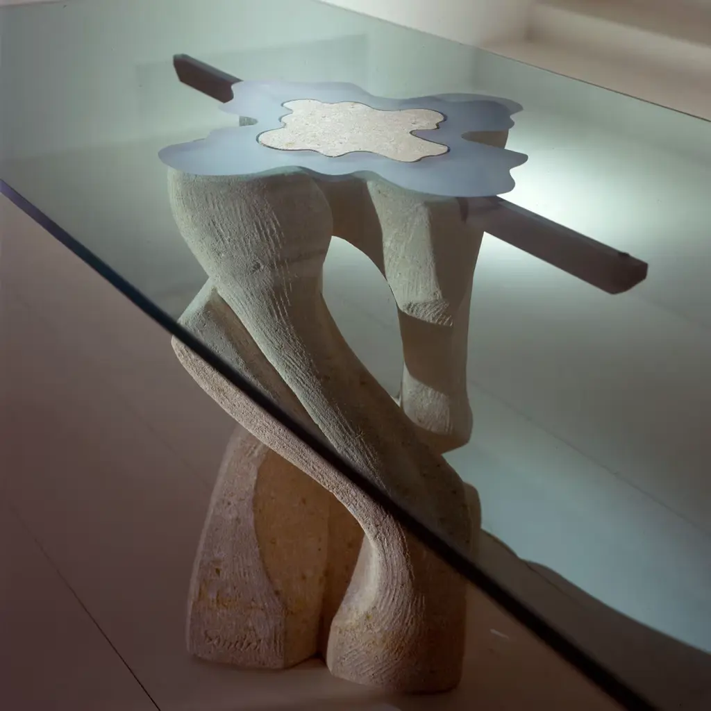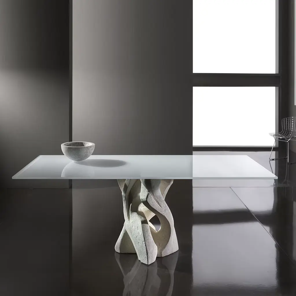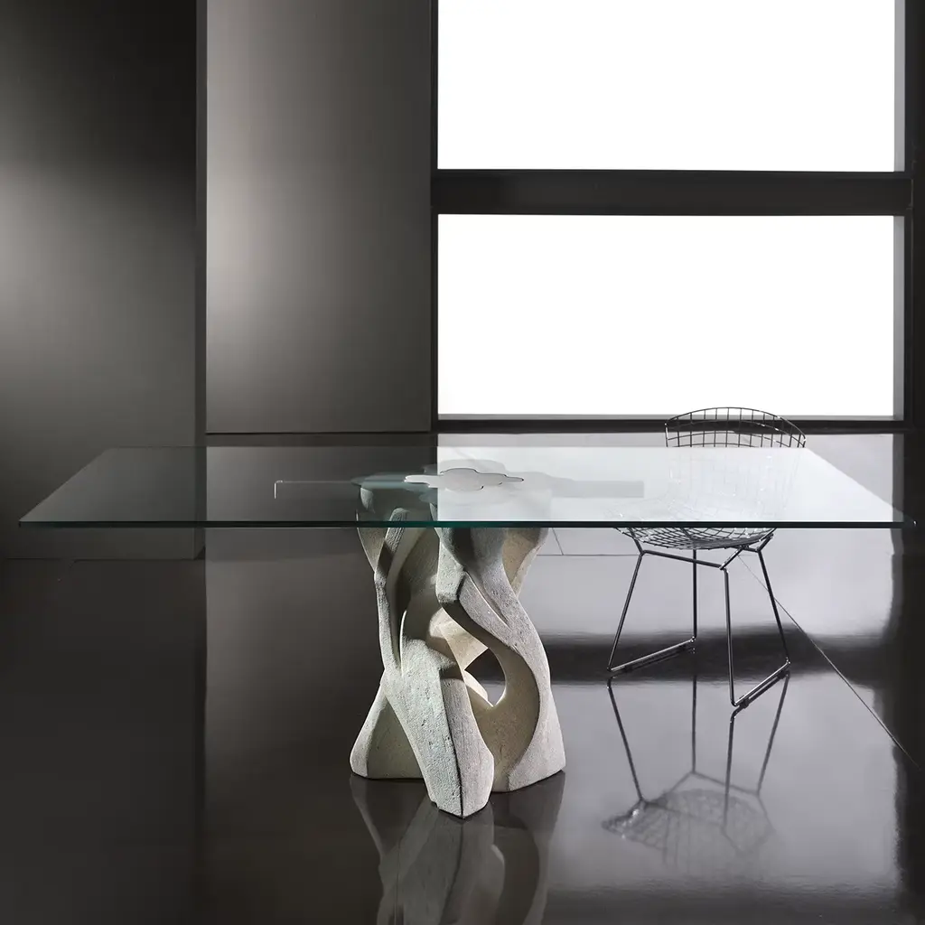 In a spectacular design that gives the impression of twisted tree branches, the Alex Dining Table by Giandomenico Sandri features a sculpted base crafted from white Vicenza stone. With its neutral coloring and unique design, the base also features a shiny chromed metal bar to elegantly support the 200 x 90 cm clear glass top.