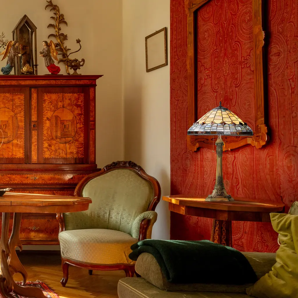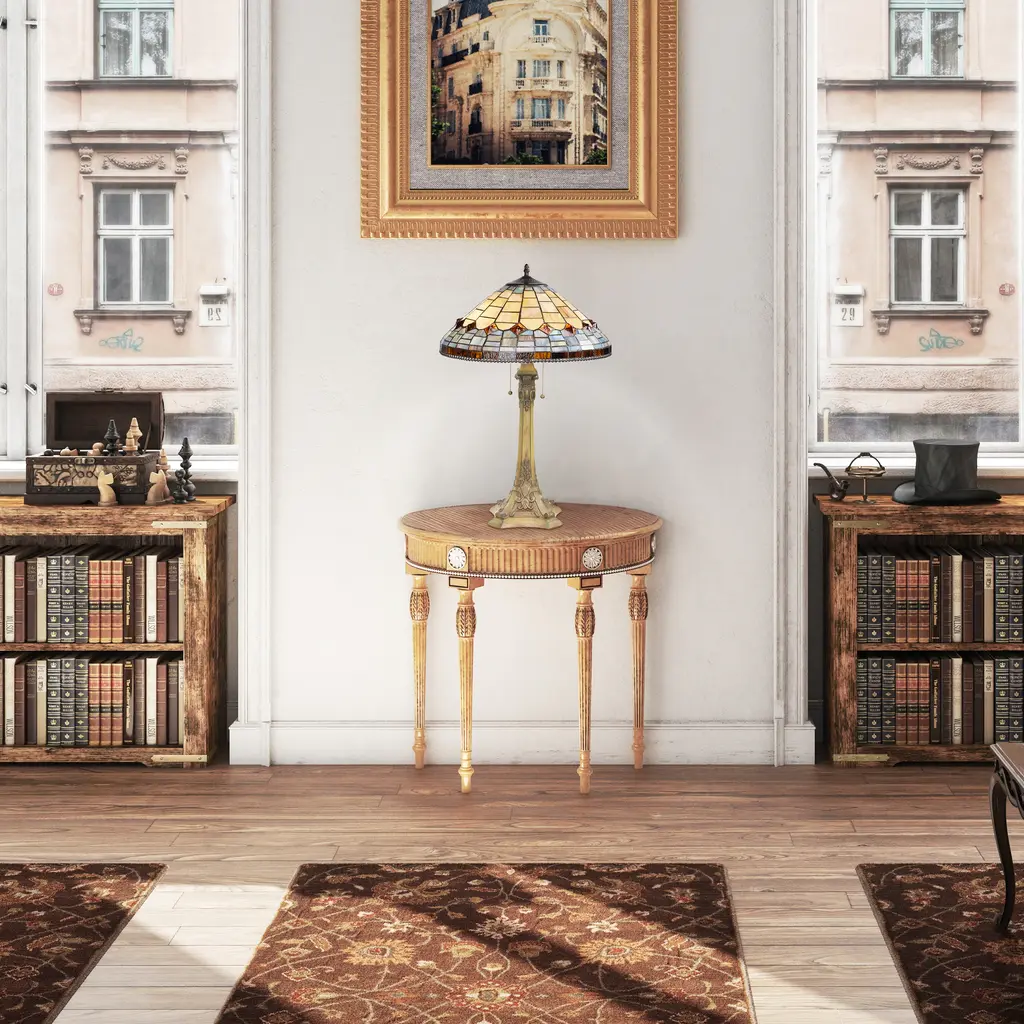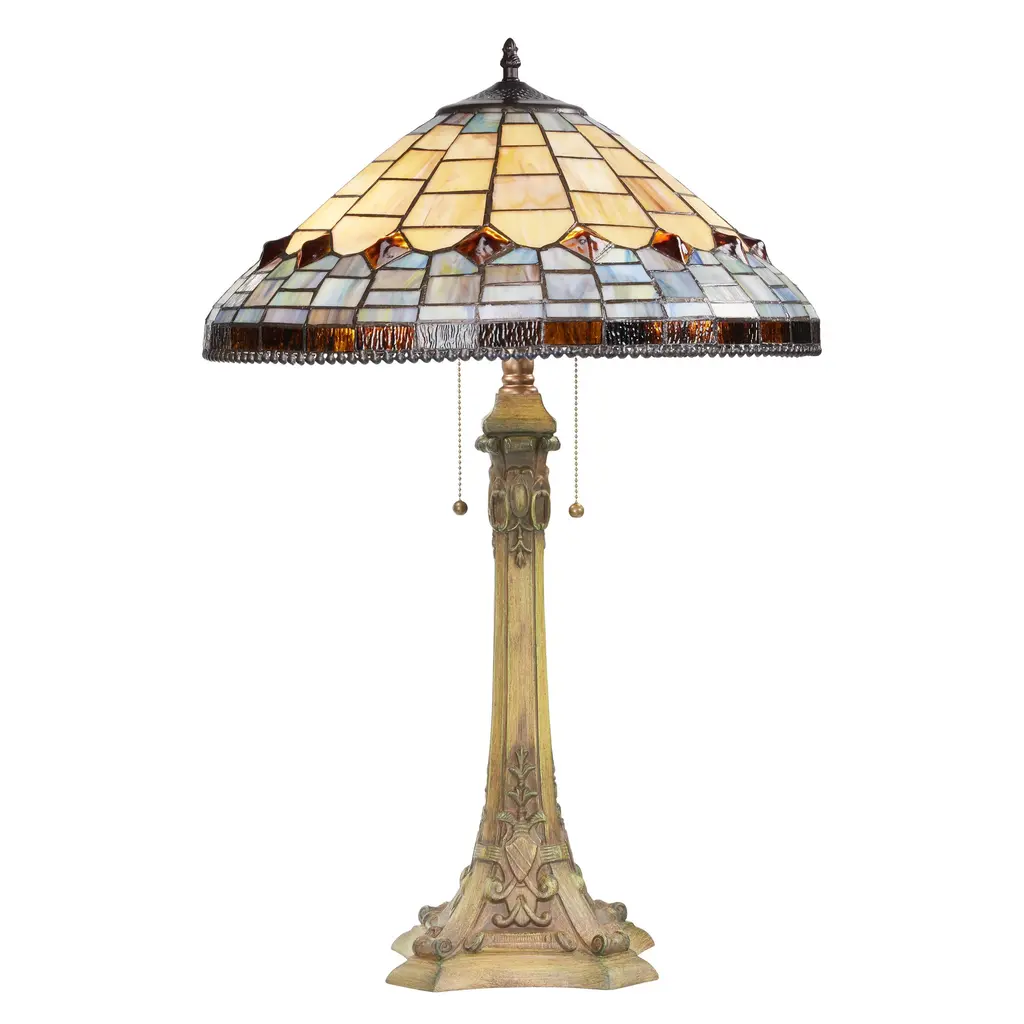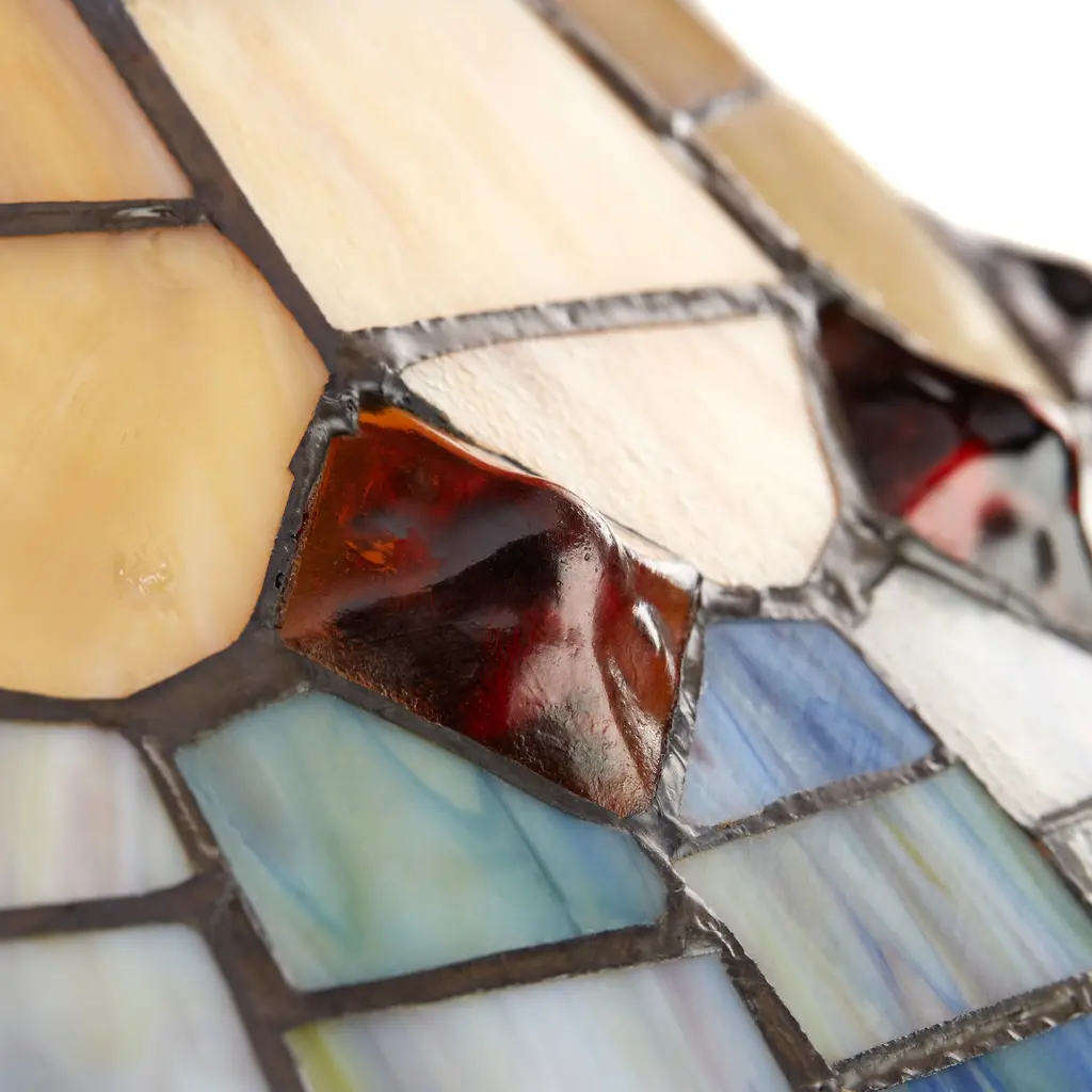 Experience the allure of this Victorian-style table lamp, skillfully crafted with a charming blend of amber, blue, brown, and purple stained glass. The handcrafted design features a stunning dome-shaped shade with a traditional brickwork pattern. The base of the lamp, fashioned from polyresin and metal, is designed in an appealing candlestick shape with intricate detailing, adding an elegant touch to your desk or side table. The rich multicolor scheme of the lamp creates a warm and inviting atmosphere, perfect for reading, working, or simply basking in its captivating beauty.