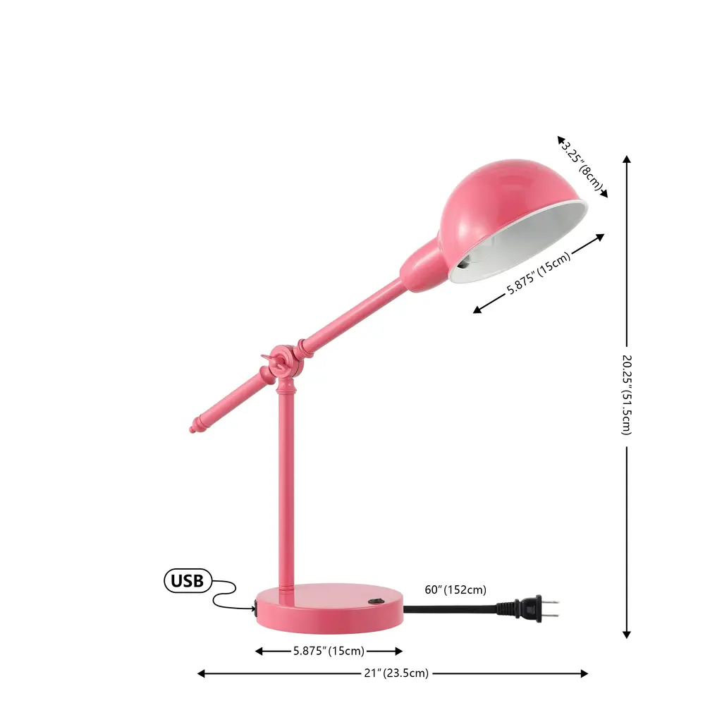 Allegra 20.25" Vintage Industrial Iron Adjustable Dome Shade Led Task Lamp With Usb Charging Port, By Jonathan Y - Pink