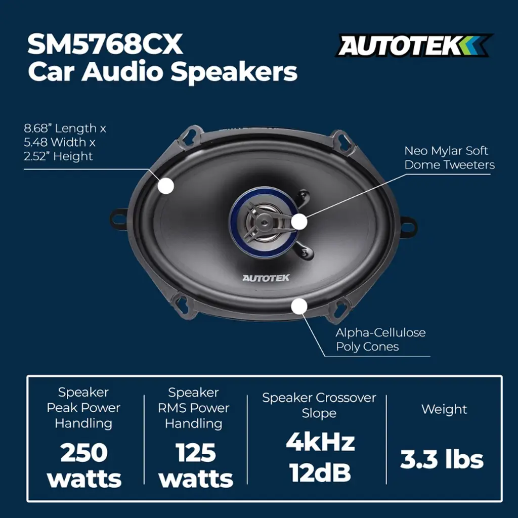 Upgrade your car’s audio system with the Autotek Street Machine 5"x7" & 6"x8" 2-Way Car Speakers, engineered to deliver powerful, crystal-clear sound in a compact design. These premium car audio speakers feature Neo Mylar Soft Dome Tweeters, offering ultra-clear high frequencies with enhanced durability, while the Alpha-Cellulose Poly Cones produce rich midrange tones and deep bass response – perfect for music lovers who want to elevate their in-car listening experience. Built for reliability and performance, each speaker is crafted with a UV-resistant rubber surround to withstand moisture and deliver lasting mid-bass impact. The pure copper voice coil and Kapton former ensure efficient heat dissipation for stable operation, even under high volumes. With an epoxy-infused natural fiber spider and over-coil cooling system, you get long-lasting performance without distortion. These coaxial speakers include a passive Butterworth crossover with a 6dB slope for smooth frequency transitions, while the anti-resonant stamped steel basket reduces unwanted vibrations and harmonics. Compact yet powerful, the ferrite magnet enhances performance while fitting easily behind most OEM panels. Designed for quick and easy installation, the textured ABS gasket ensures a secure, vibration-free fit. Whether you’re replacing factory speakers or building a custom setup, these 2050W peak car stereo speakers deliver high-impact sound with flexible connectivity – use standard spade terminals or solder directly for a secure connection. Take your sound system to the next level with Autotek Street Machine 5"x7" & 6"x8" Coaxial Speakers – your perfect upgrade for immersive, reliable, and high-fidelity car audio.