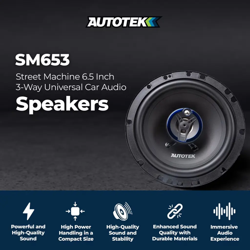 Upgrade your ride with the Autotek Street Machine 6,5 Inch 3-Way Coaxial Speakers, engineered for music lovers who demand more from their car audio. These premium coaxial speakers feature Neo Mylar Soft Dome Tweeters that deliver crystal-clear highs and enhanced durability, while Alpha-Cellulose Poly Cones produce rich midrange tones and deep, impactful bass. Designed for universal fit, this pair of 6.5 inch speakers transforms your in-car listening experience with balanced, full-range audio. Built for performance and resilience, these speakers include a UV-resistant rubber surround for weather protection and enhanced mid-bass response, while a high-temperature adhesive system maintains integrity in harsh conditions. At the heart of the design, a pure copper voice coil and Kapton former provide efficient heat dissipation, ensuring longevity and stable output. The epoxy-infused natural fiber spider adds strength and flexibility, while an over-coil cooling system keeps the components running cool during extended sessions. Autotek’s attention to detail continues with a passive Butterworth crossover and 6dB internal crossover, delivering smooth frequency transitions. The anti-resonant stamped steel basket and textured ABS gasket minimize distortion and secure a tight fit, while a compact ferrite magnet ensures strong magnetic performance. With braided tinsel leads for high conductivity and multiple connection options, these 6.5 inch 3-way speakers are built for reliability, clarity, and easy installation. Elevate your car audio with Autotek—where sound meets precision.