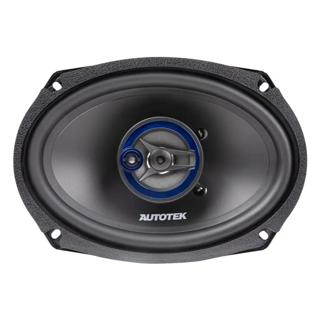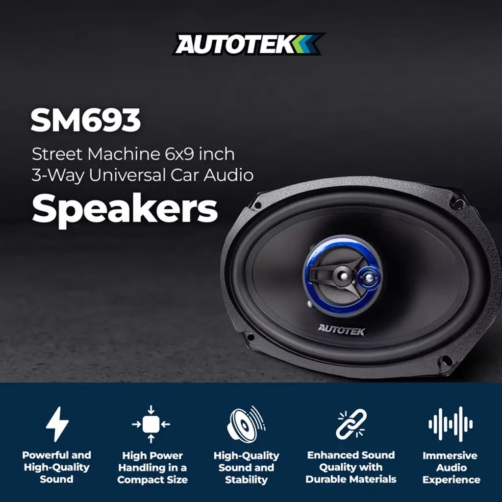 Upgrade your ride with the Autotek Street Machine 6x9 Inch 3-Way Coaxial Speaker System, engineered for music lovers who demand more from their car audio. These premium coaxial speakers feature Neo Mylar Soft Dome Tweeters that deliver crystal-clear highs and enhanced durability, while Alpha-Cellulose Poly Cones produce rich midrange tones and deep, impactful bass. Designed for universal fit, this pair of 6x9 inch speakers transforms your in-car listening experience with balanced, full-range audio. Built for performance and resilience, these speakers include a UV-resistant rubber surround for weather protection and enhanced mid-bass response, while a high-temperature adhesive system maintains integrity in harsh conditions. At the heart of the design, a pure copper voice coil and Kapton former provide efficient heat dissipation, ensuring longevity and stable output. The epoxy-infused natural fiber spider adds strength and flexibility, while an over-coil cooling system keeps the components running cool during extended sessions. Autotek’s attention to detail continues with a passive Butterworth crossover and 6dB internal crossover, delivering smooth frequency transitions. The anti-resonant stamped steel basket and textured ABS gasket minimize distortion and secure a tight fit, while a compact ferrite magnet ensures strong magnetic performance. With braided tinsel leads for high conductivity and multiple connection options, these 6x9 inch 3-way speakers are built for reliability, clarity, and easy installation. Elevate your car audio with Autotek—where sound meets precision.
