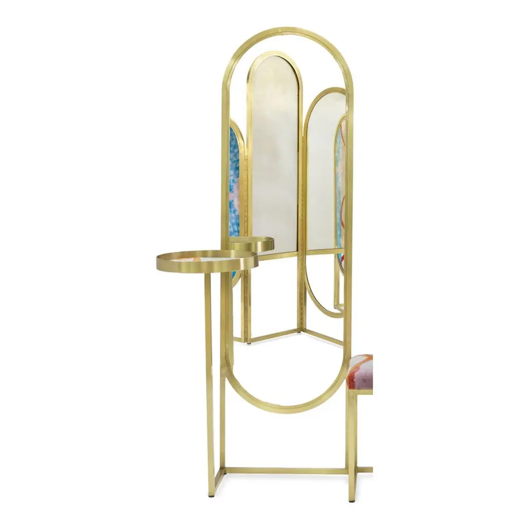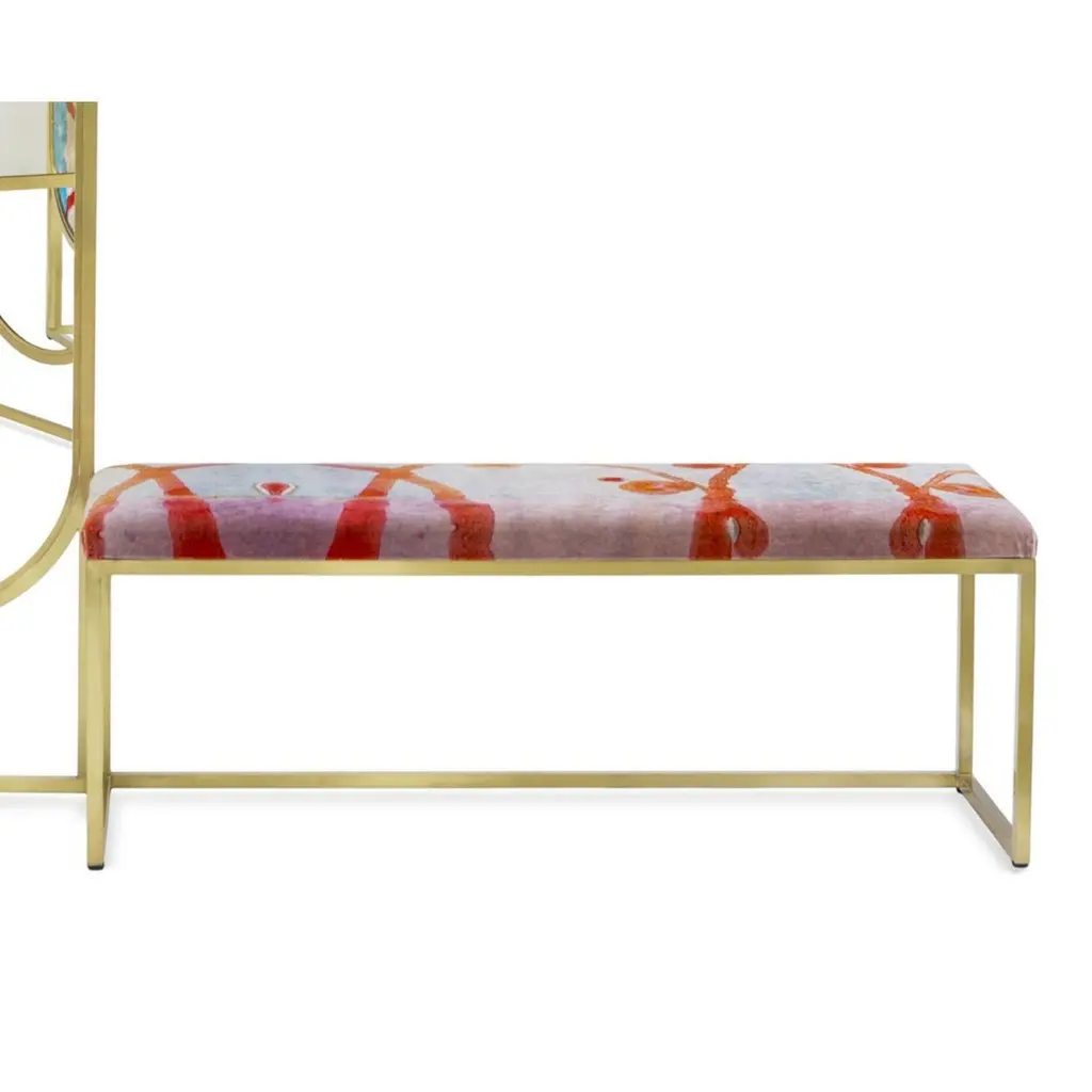 Awaiting J Bench by Secondome EdizioniLimited Edition Of 9 pieces + 3 A.P.Designer: Coralla Maiuri + Giorgia Zanellato.Dimensions: D 49 x W 190 x H 167 cm.Materials: Brass and original printed velvet.Collection / Production: Secondome. This piece can be customized. Available colors: any kind of velvet color. Please contact us. The project’s name speaks to the feeling of anticipation and excitement that precedes an encounter and it’s deeply linked to the purpose of the objects: benches, stools, a mirror, a vanity table and a room divider. The collaboration started as a game. The artist, Coralla Maiuri, inspired by the pictures of her porcelain pieces, designs a collection of bold colored velvet cloth. Her will to shape them in to something equally bold yet refined, brings her, trough Claudia Pignatale, together with the designer Giorgia Zanellato. Awaiting is a feminine and sensual collection that mixes a taste of classic and contemporary in pieces of furniture realized in golden brass and original printed velvet.THE GALLERYSecondome is a Design Gallery focused on contemporary designers and innovative projects worldwide.Founded by Claudia Pignatale in 2006, Secondome produces its own collection of Furniture and objects working to launch experimental designers, artisans and master craftsmen. Its mission lies in highlighting both the high quality manufacture of the Made in Italy brand and the originality of products, emphasizing the tradition of Italian craftsmanship whilst breaking the mold of lifeless objets d’art.The artisanal nature of Secondome’s production makes each piece individual and highly personalized.