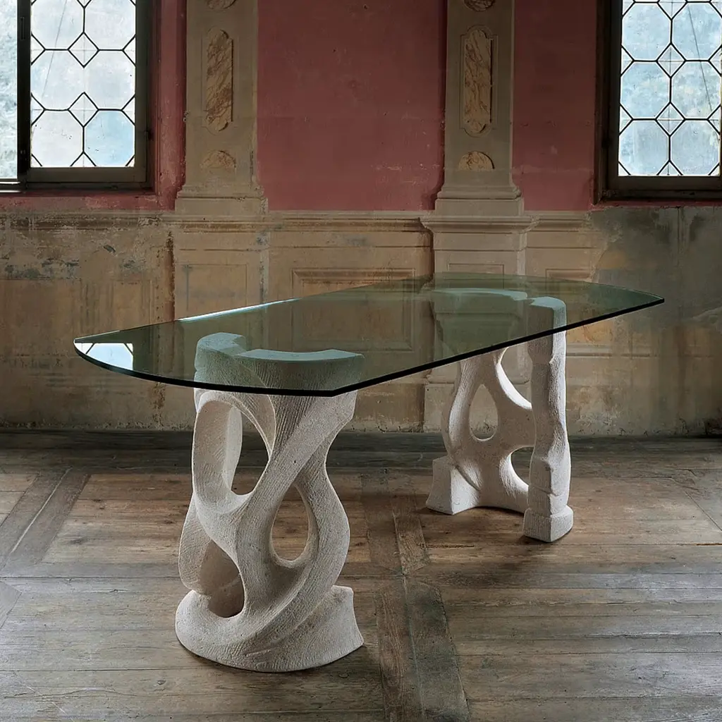A splendidly unique piece of furniture for a contemporary home, the Ca’ d’oro Dining Table by Giandomenico Sandrini is super stylish and brimming with character. A highly original piece featuring spectacular sculptures in White Vicenza Stone supporting an oblong clear glass table top, it will beautifully compliment the modern decor in the dining room.
