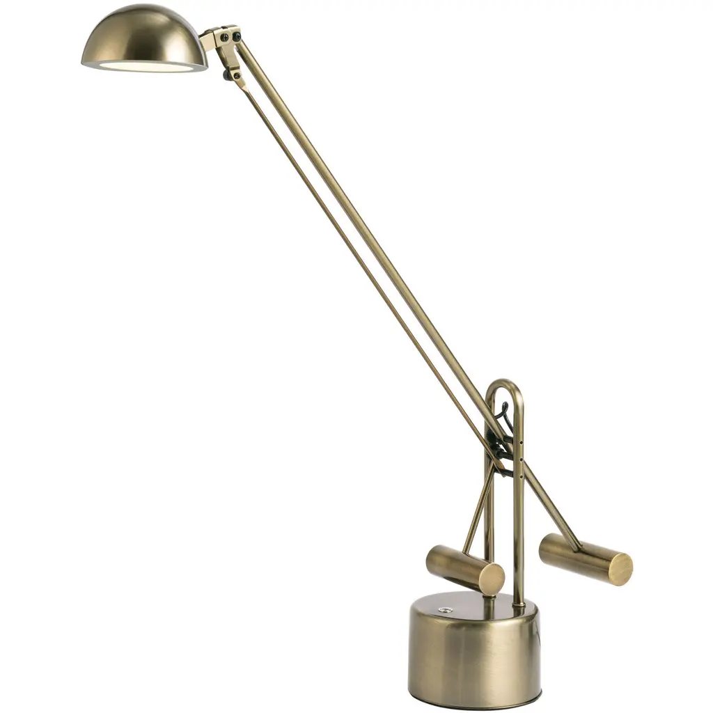 This traditional table lamp comes in shines in antiqued brass metal and has an adjustable hood making it perfect for a desk or workspace.As shown: 20"L x 6.5"W x 30.5"H. Height adjustable from 23" - 30.5". Shade 6.5" dia. Base 6" dia. Weighs 5 lbs.Hand Finished MetalUL listed. Uses one max 25W Type B candelabra bulb (not included). On/off switch.Heirloom Quality - Expertly hand crafted and hand finished. Due to the hand crafted nature of this piece, each piece may have subtle differences.