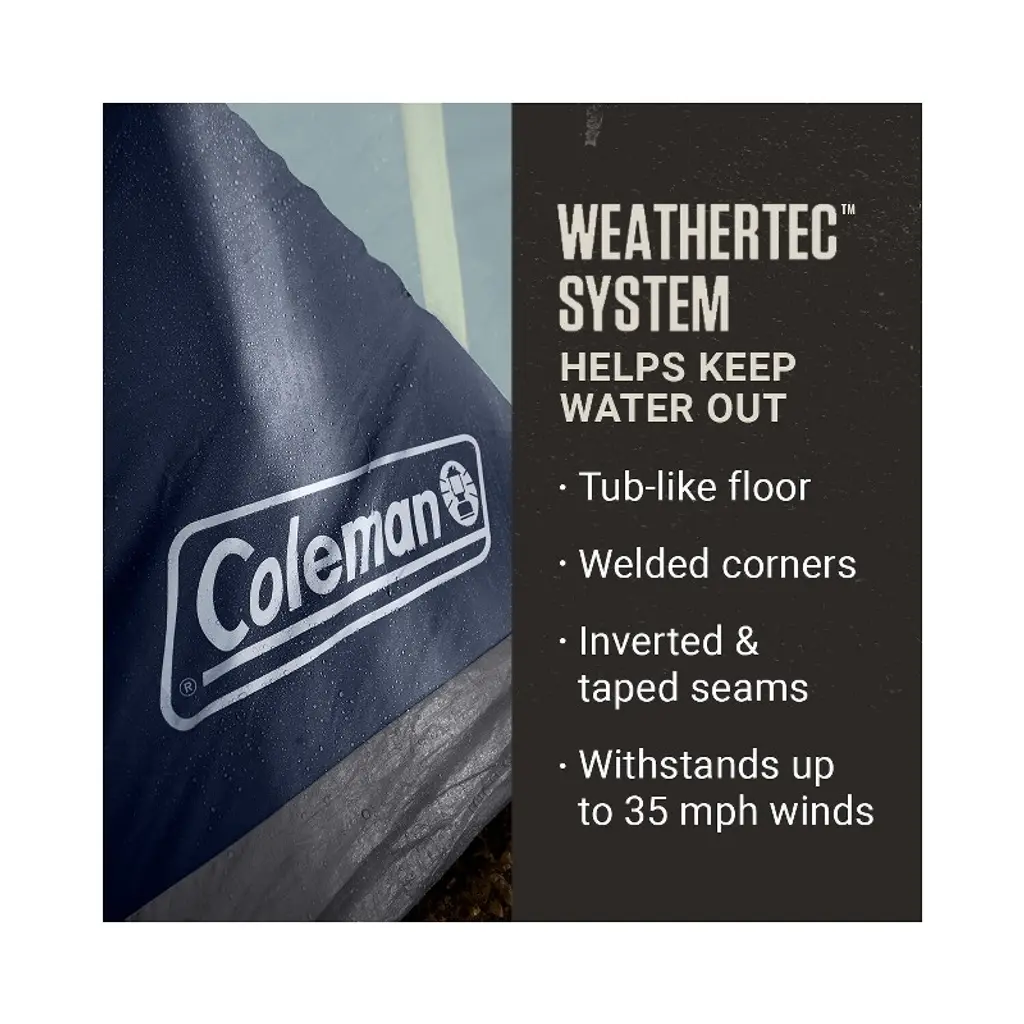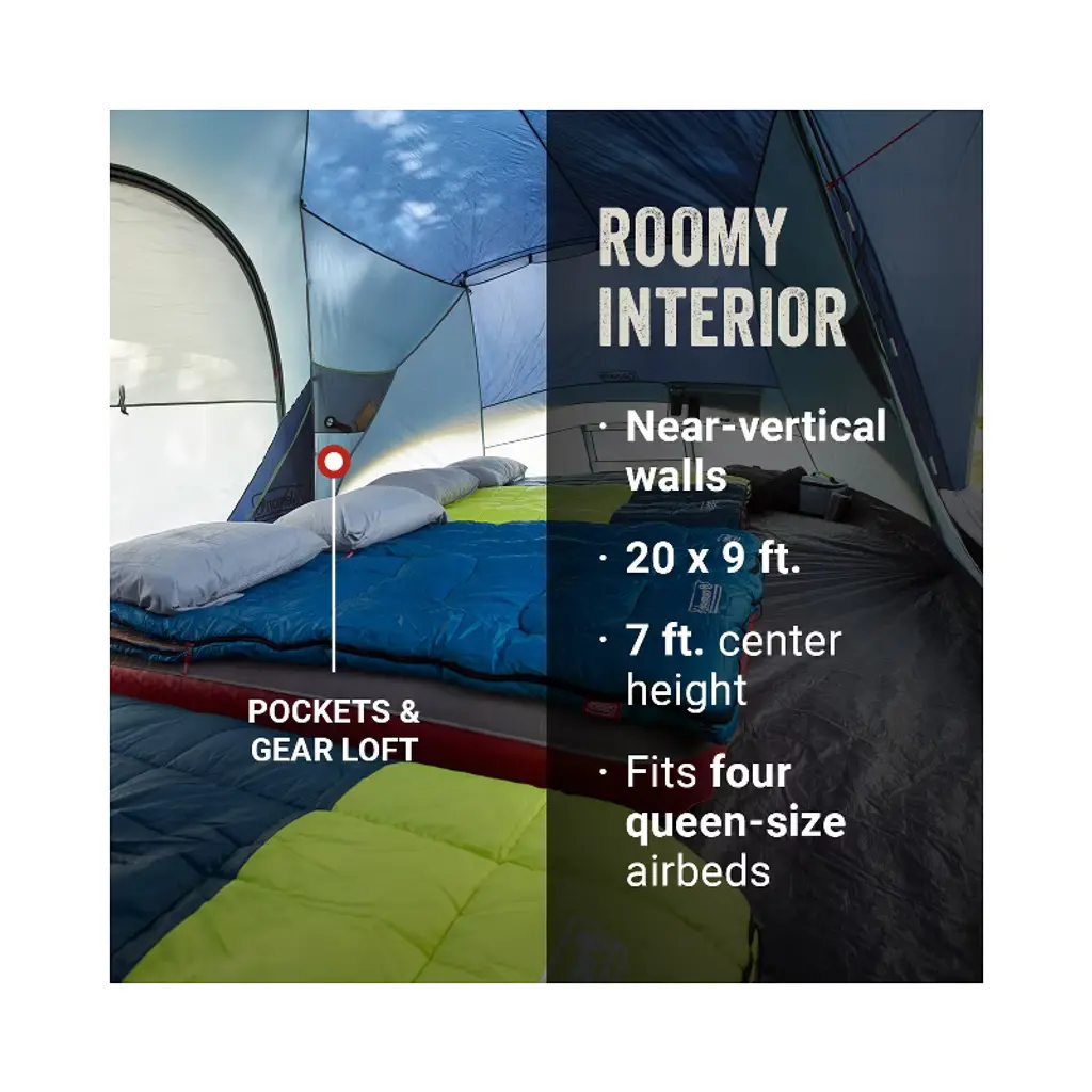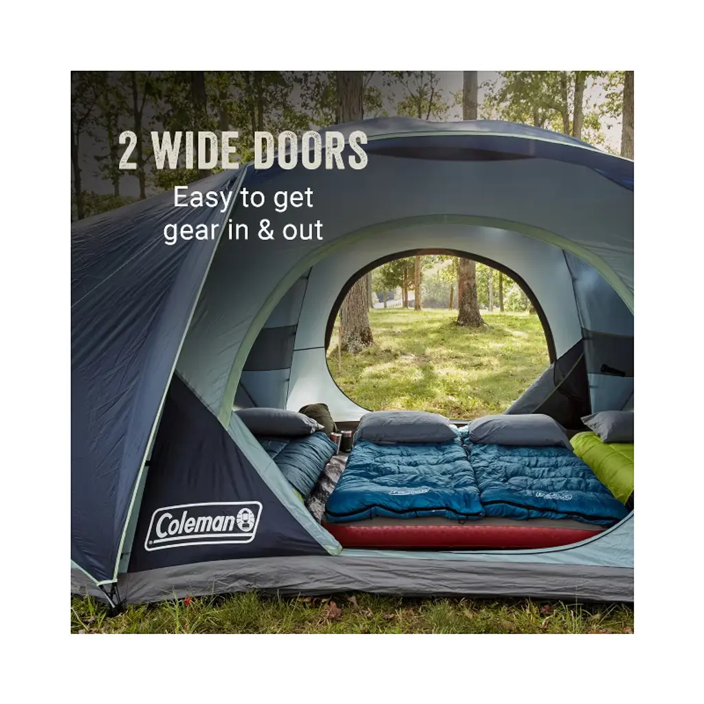 Sets up in under 5 minutes (based on average setup time with 2 people) so you spend less time pitching the tent and more time relaxing at the campsite. Go ahead and spread out, the Coleman Skydome™ Camping Tent XL fits 4 queen-sized airbeds so you and your family can camp in comfort. The unique design features a room divider and 2 doors (front and back) so you have two entrances, making it easier for your group to get in and out of the tent. The nearly vertical walls offer more headroom. Plus, a wide door design means you can move airbeds, sleeping bags, and other gear in and out with ease. Large door awnings provide more weather protection and better airflow. An E-port makes it easy to access an extension cord so you can bring electrical power inside your tent. Downpour in the forecast? This tent features the WeatherTec™ system with a tub-like floor and patented welded corners, while inverted seams and taped seams on rainfly and tent body help keep water out. Plus, the strong frame has been tested to withstand up to 35 mph winds. The extra-large size makes this tent a great choice for car camping with a large group. So gather around and make some memories outside. These Skydome™ tents are available in a range of sizes: 8-person, 10-person, and 12-person.