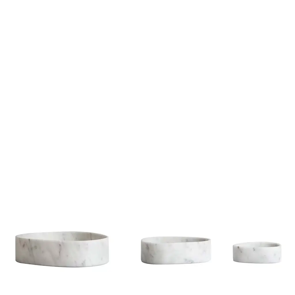 This superb soap dish designed by Matteo Cibic exemplifies the immediate charm of prized marble paired with smooth curves and minimalist shapes. Its oval frame in white Michelangelo marble makes for the sculptural shell where to place bar soaps, while the side disks in black Marquina marble allow for optimal grip. The unpredictable veining and exact tone distinguishing each piece enhance the natural flair of the design. Please note that marbles and stones are natural materials and they can differ also if coming from the same quarry or the same block. The product shown may differ from purchased items. Every piece is unique. Please read carefully the unpacking and handling instructions. Please note that the Cibic pieces with “ears” or tray handles are ornamental and not functional. Use them can cause breaks and is unsafe. Customer has to read the instruction that accompany the delivery of these pieces.