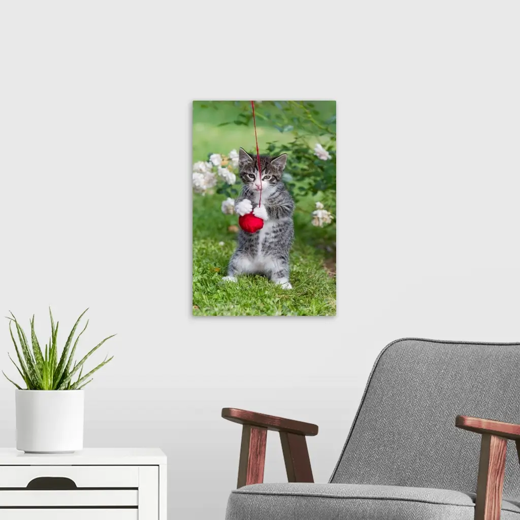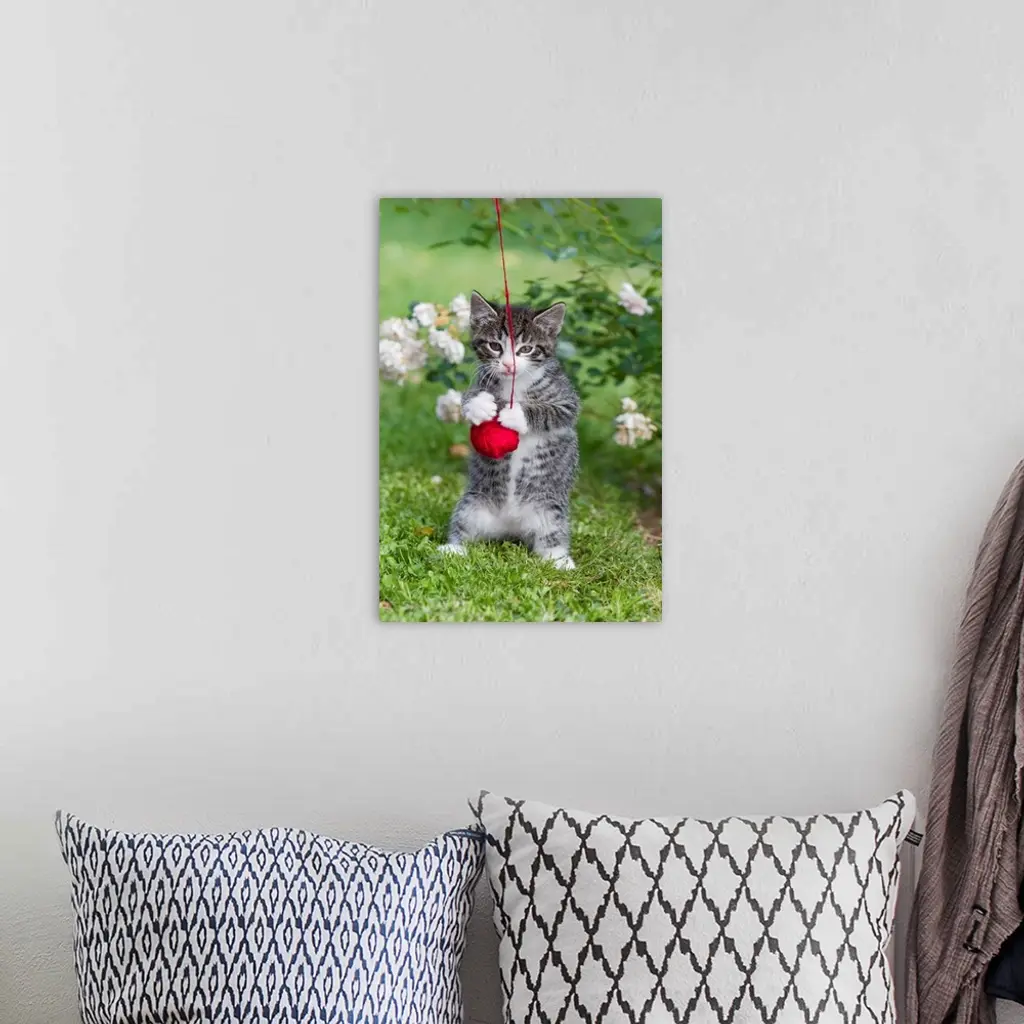 kitten playing with ball of wool in garden, Lower Saxony, Germany, Europe