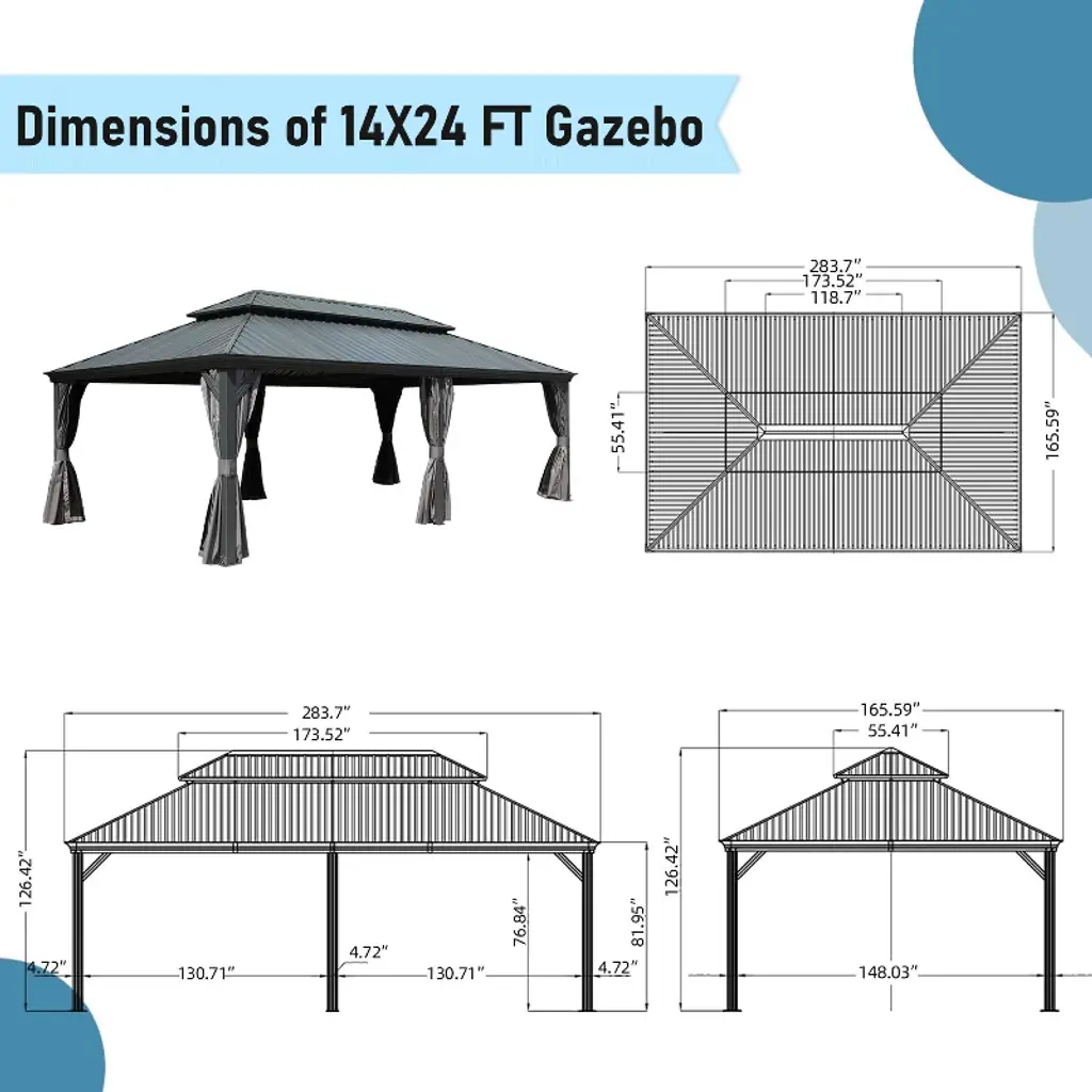 Create the perfect outdoor retreat with this 14x24FT Hardtop Gazebo. Featuring a durable galvanized steel double roof, rust-resistant aluminum frame, and a built-in gutter system, this spacious metal gazebo is designed for all-weather protection and year-round use. The included curtains and netting provide privacy and protection from insects, making it ideal for entertaining, dining, or relaxing on your patio, deck, or garden. Its modern grey finish seamlessly complements any outdoor décor.
