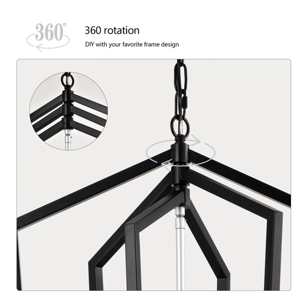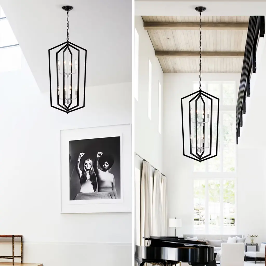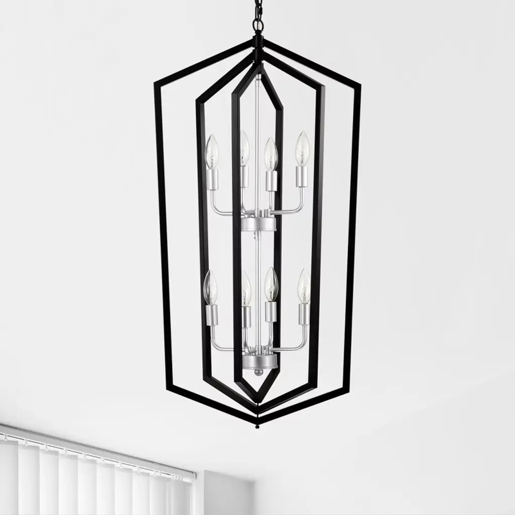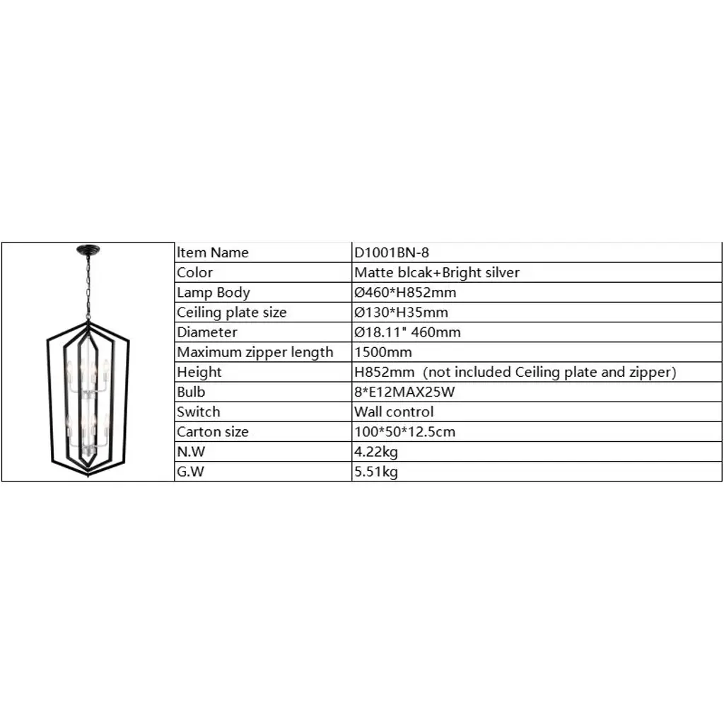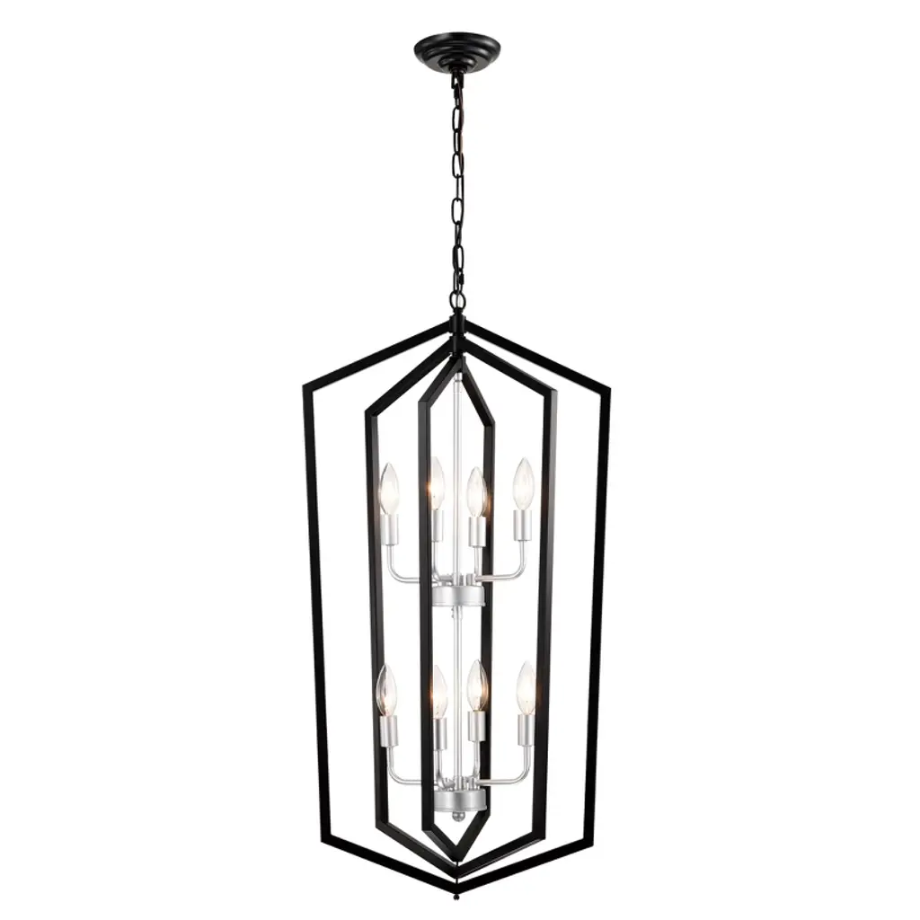 Elevate your home's aesthetic with this 8-light farmhouse kitchen chandelier. Featuring a matte black and silver finish, this vintage rustic cage light fixture adds a touch of elegance and warmth to any space. Perfect for dining rooms, hallways, foyers, and entryways, its adjustable height allows for a customized fit to suit your needs. Please note, E12 bulbs are not included.