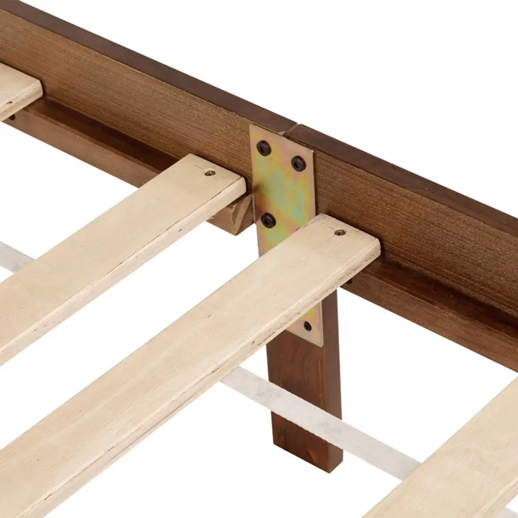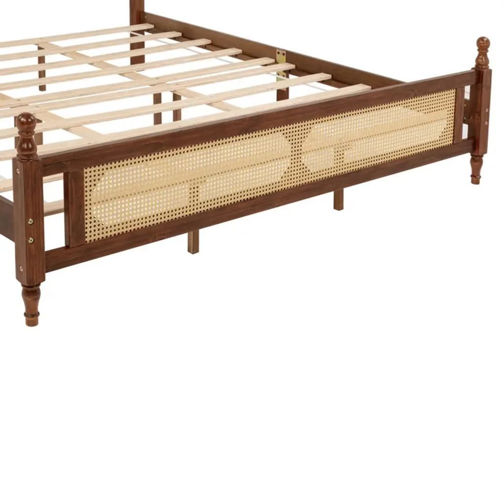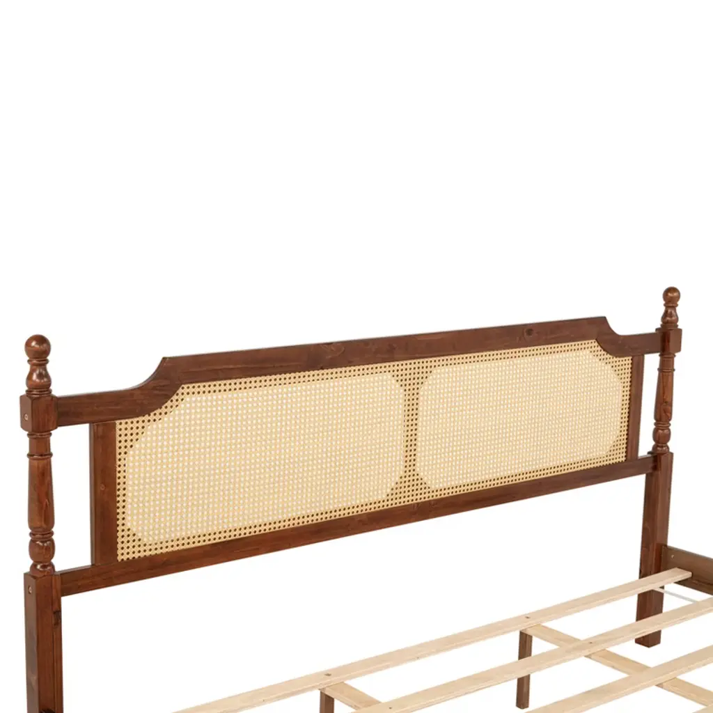 Dometour King Pine Wooden Bed With Rattan Headboard And Footboard, With Central Enhanced Bed Platform,walnut