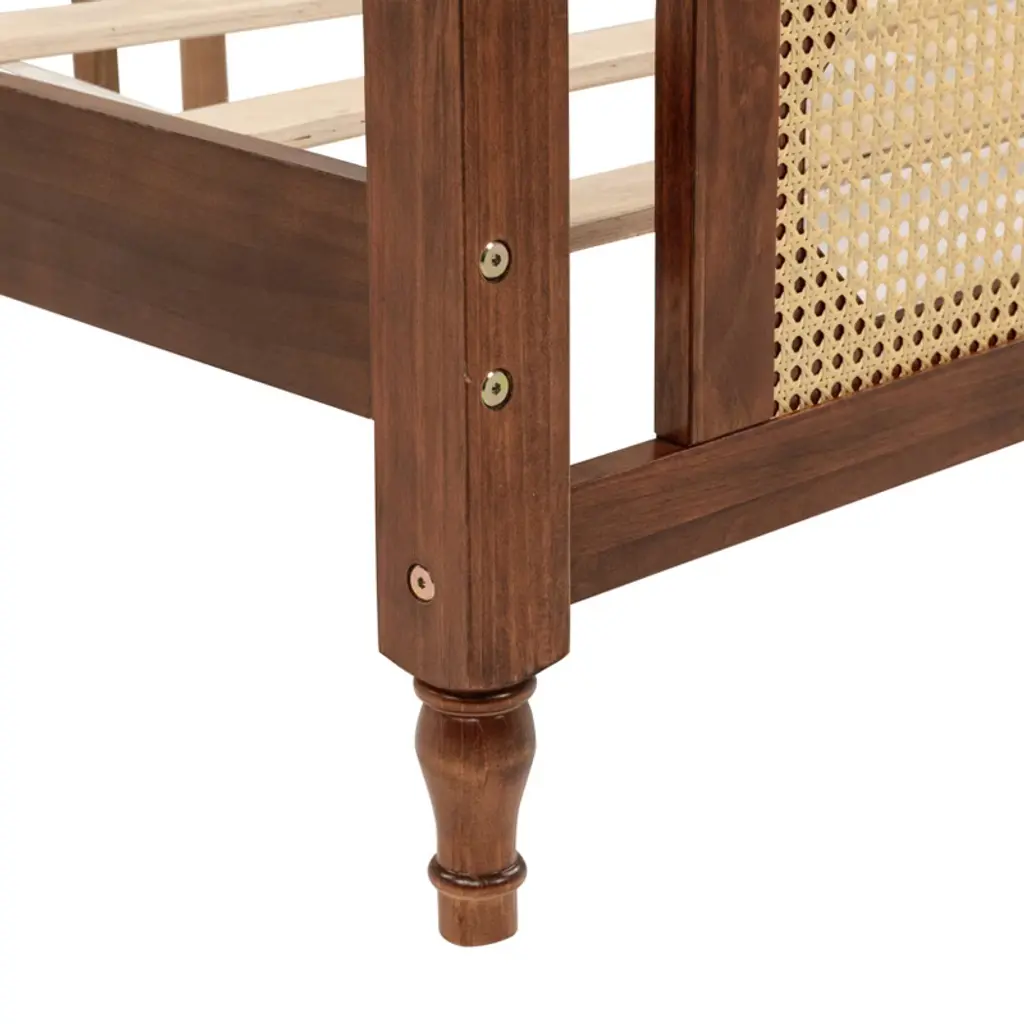Transform your bedroom with the King Pine Wooden Bed, featuring a beautifully crafted rattan headboard and footboard. The central enhanced bed platform offers sturdy support, ensuring a restful night's sleep. Finished in a rich walnut color, this bed adds a touch of elegance and warmth to any decor.