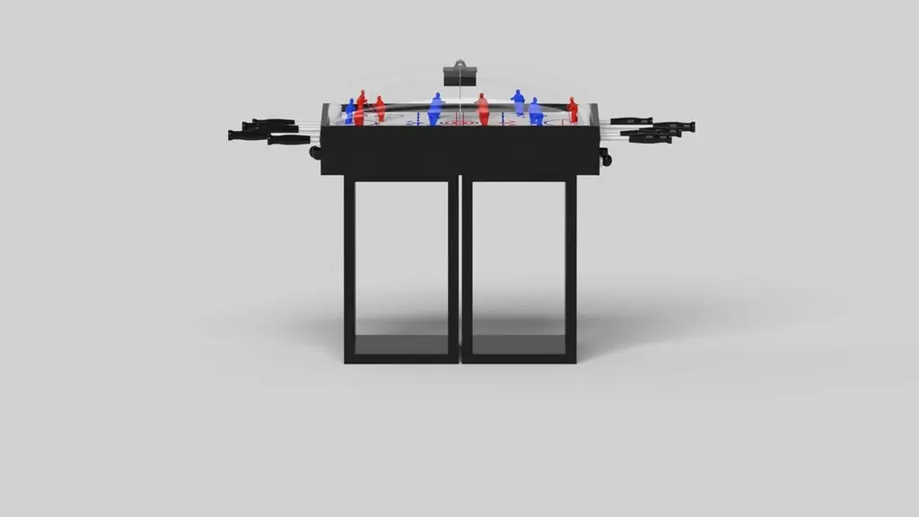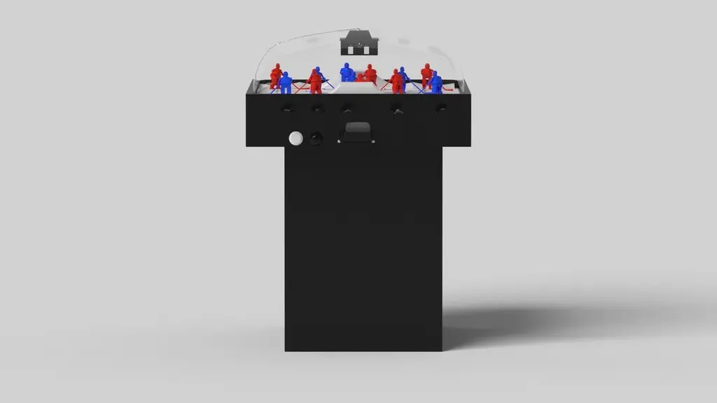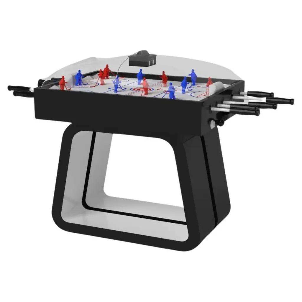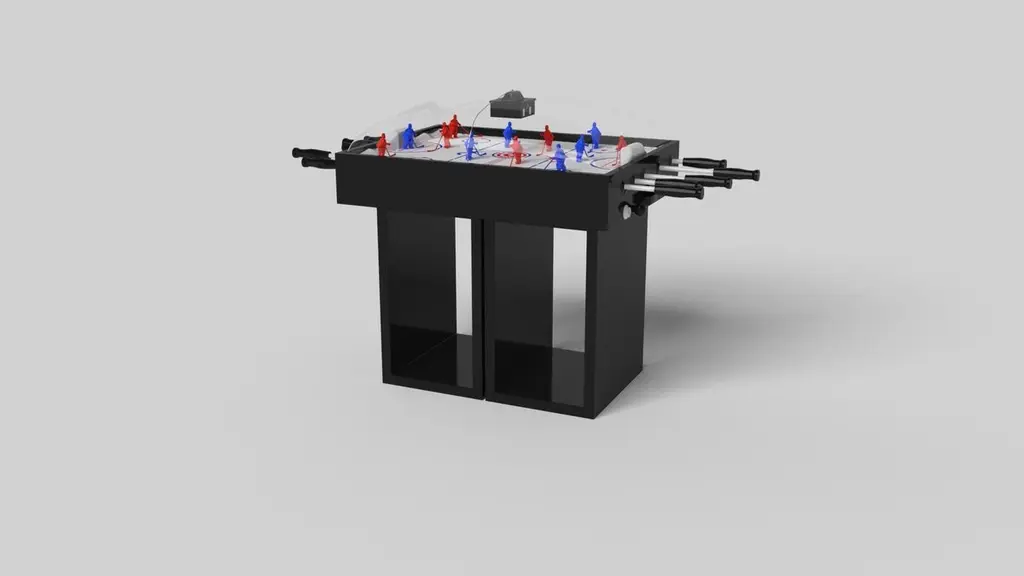 Supported by two rectangular open pedestals as the base, this handcrafted bubble hockey table is modern and minimalistic with its combination of simple, geometric forms. Viewed from the front, the use of negative space is evident; viewed from the side, the base appears to be one solid form. A hand-sanded hardwood top frames the impeccable game surface, allowing for the perfect combination of superior playability and irrefutable style.Size:45”X34”X47”