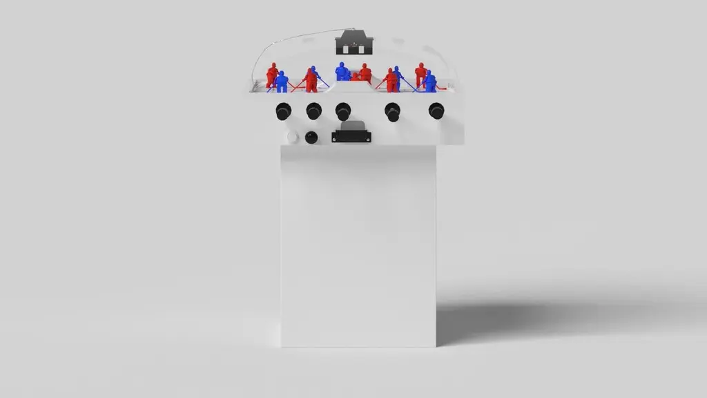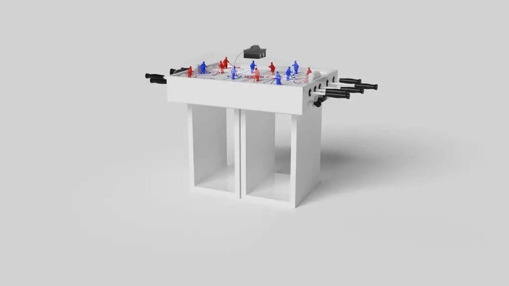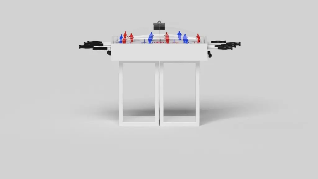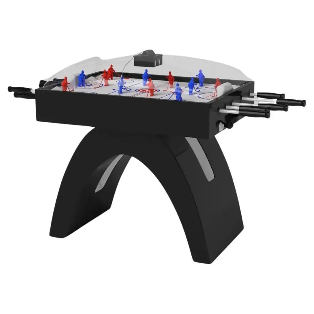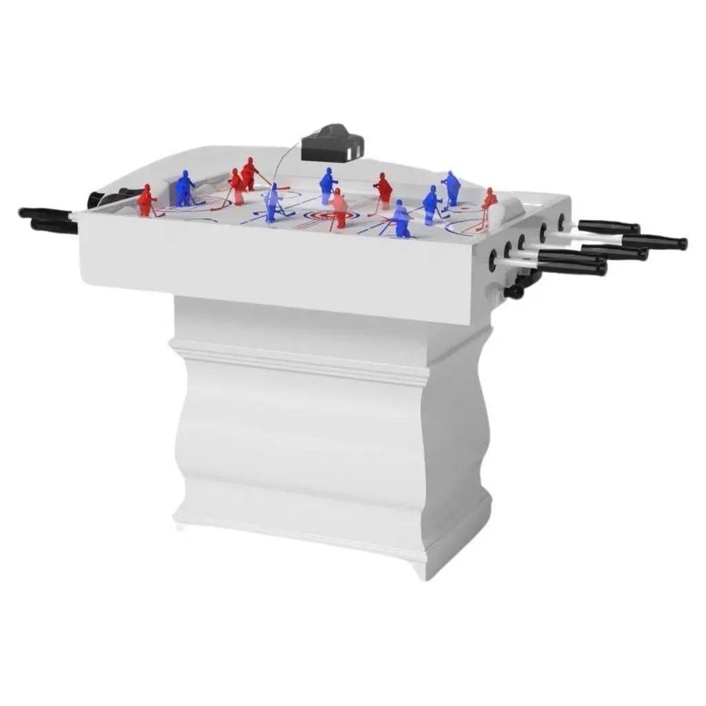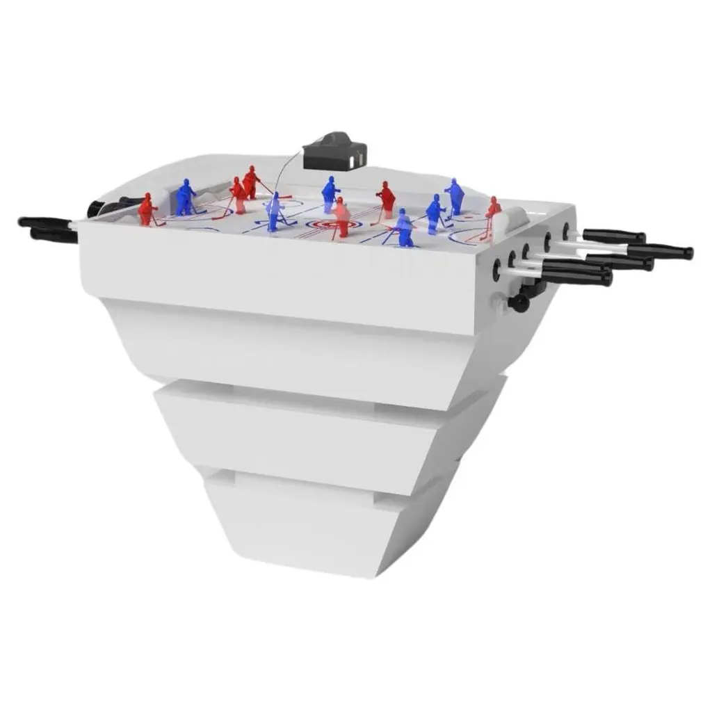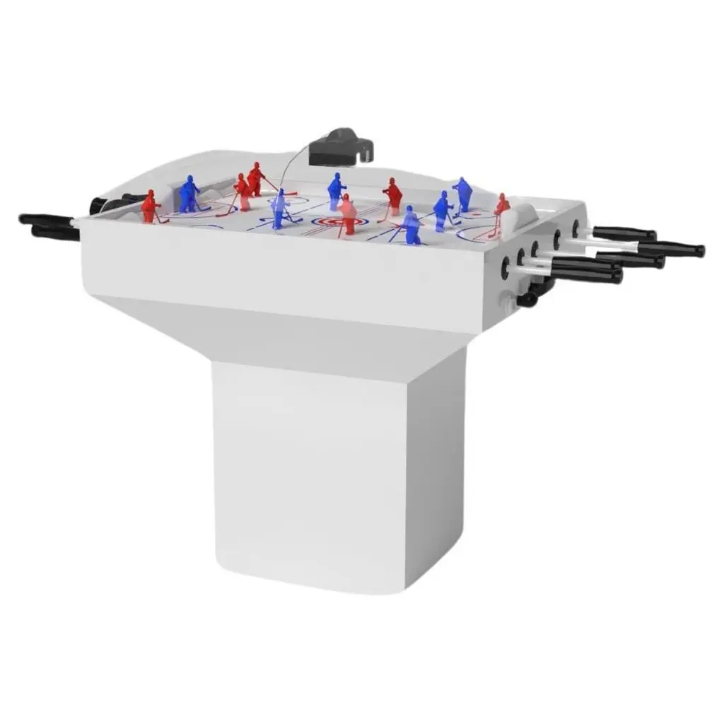 Supported by two rectangular open pedestals as the base, this handcrafted bubble hockey table is modern and minimalistic with its combination of simple, geometric forms. Viewed from the front, the use of negative space is evident; viewed from the side, the base appears to be one solid form. A hand-sanded hardwood top frames the impeccable game surface, allowing for the perfect combination of superior playability and irrefutable style.Size:45”X34”X47”
