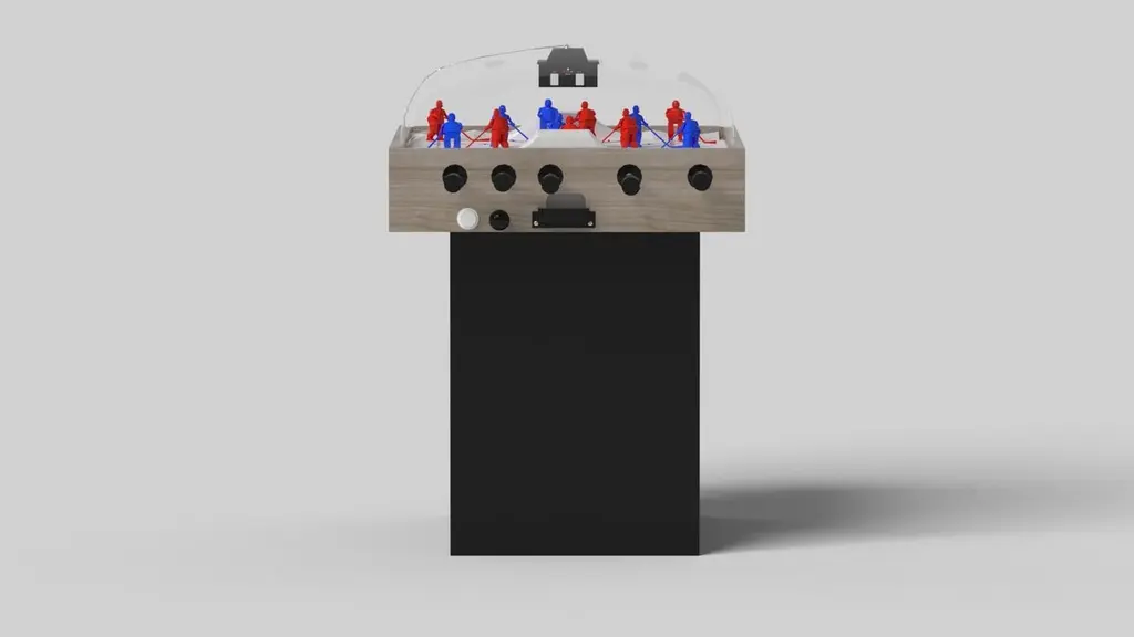 Supported by two rectangular open pedestals as the base, this handcrafted bubble hockey table is modern and minimalistic with its combination of simple, geometric forms. Viewed from the front, the use of negative space is evident; viewed from the side, the base appears to be one solid form. A hand-sanded hardwood top frames the impeccable game surface, allowing for the perfect combination of superior playability and irrefutable style.Size:45”X34”X47”