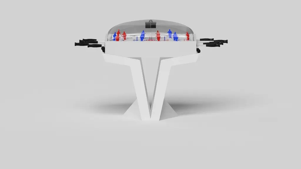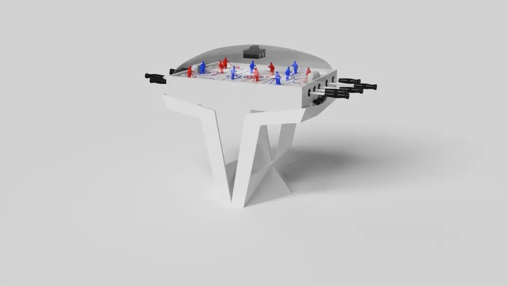 The Enzo dome hockey table is Inspired by the aerodynamic angles of top-of-the-line European vehicles. Designed with sleek, V-shaped lines and a thoughtful use of negative space, this table boasts an energetic sense of spirit while epitomizing the look of luxury and evoking the sense of speed. A perfect catalyst for encouraging hours of friendly or competitive play, this handcrafted design is available in your choice of teak, white oak, curly maple, black/white, stainless steel, and custom colors.Size:45”X34”X47”
