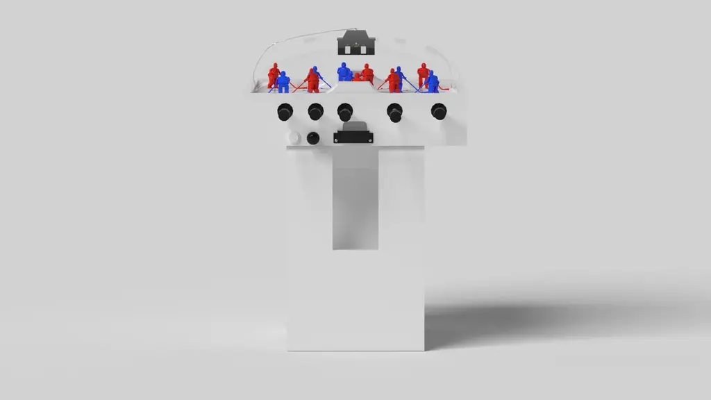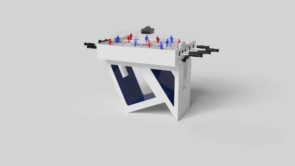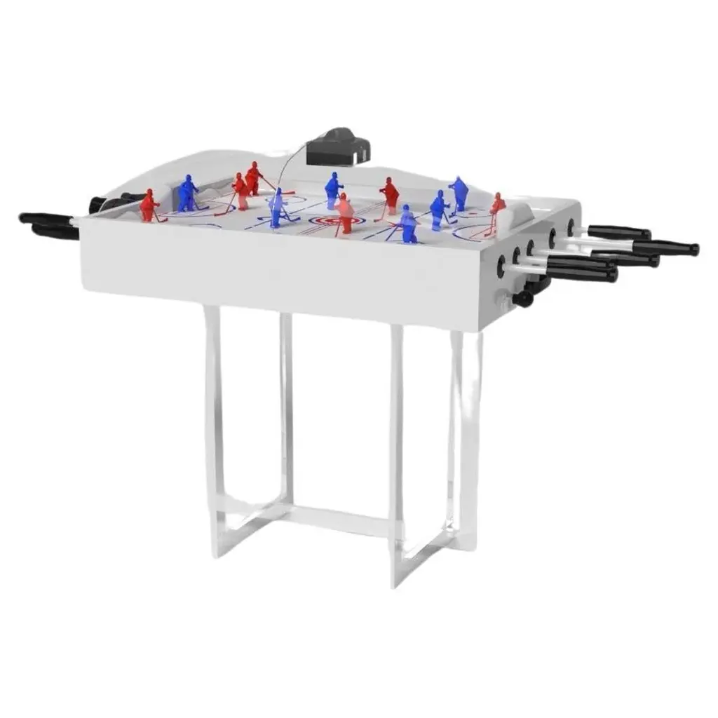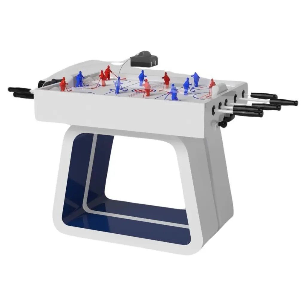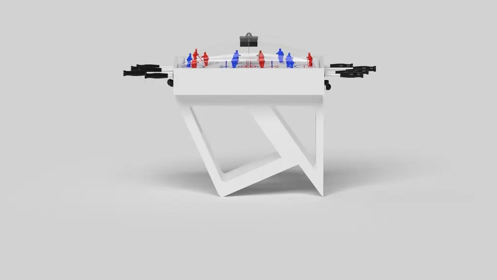 Drawing inspiration from the beauty of geometric forms, the Rumba dome hockey table in brushed aluminum is characterized by a series of hollow and solid shapes that form an offset asymmetric base. This custom table features a high-end designer appeal that coordinates seamlessly into any modern room design.Size:45”X34”X47”