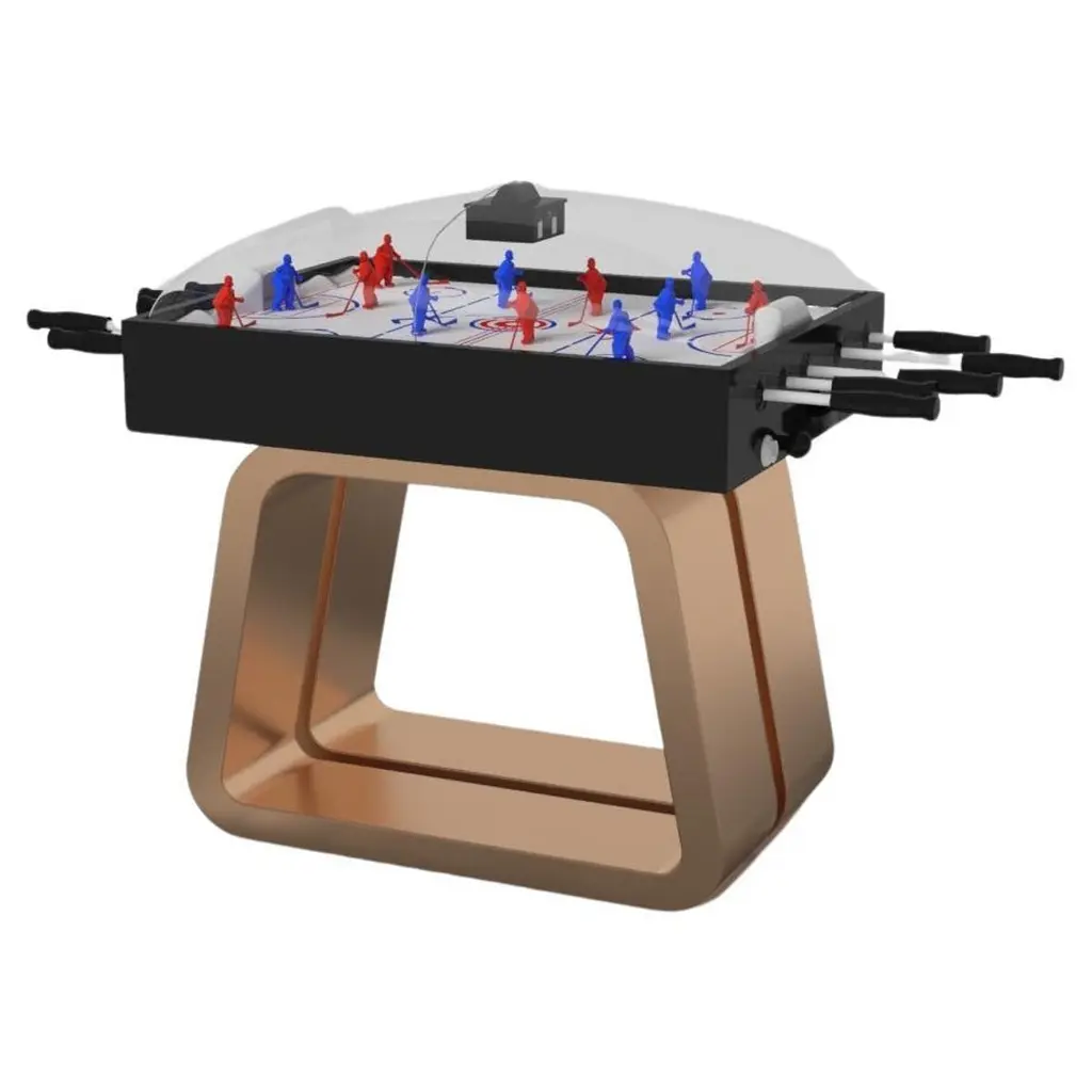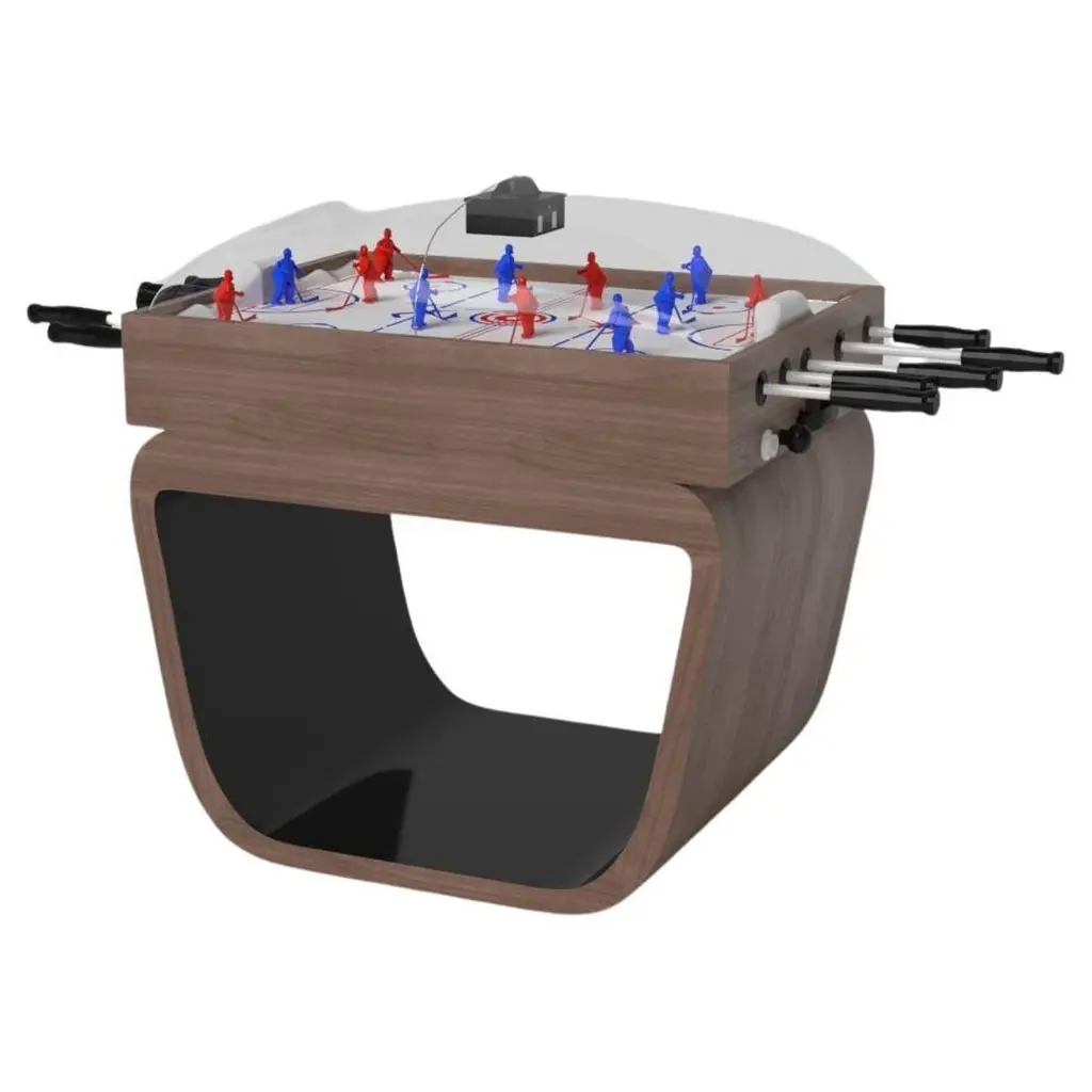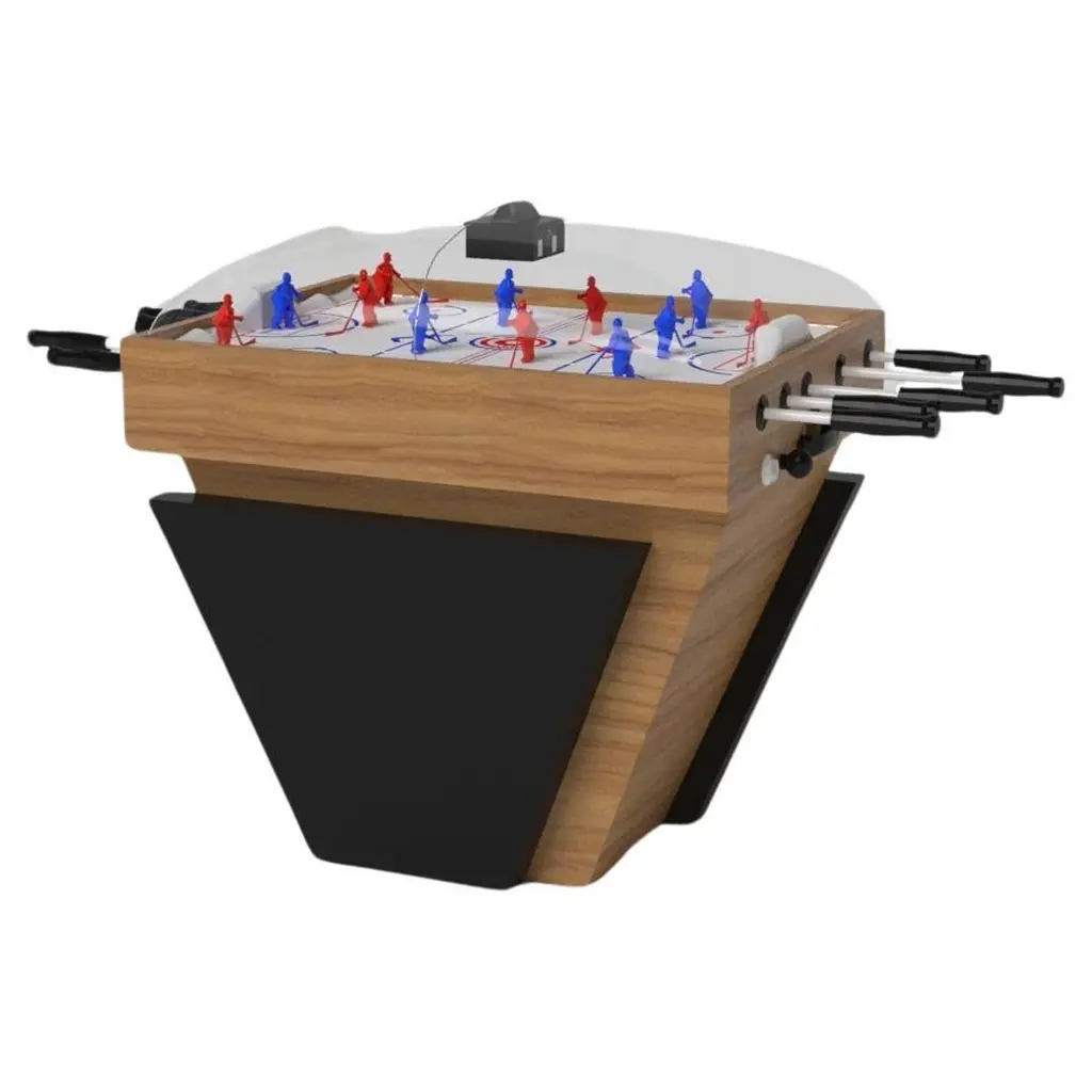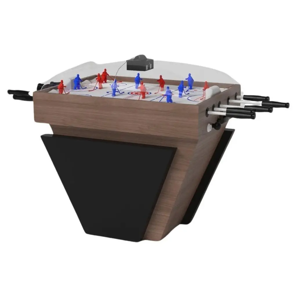 Handcrafted with clean lines, sharp angles, and a pyramid base, the Vogue dome hockey table in chrome with black strikes the perfect balance between sport-inspired style and contemporary design. Timeless in its appeal and revered for its practicality and purpose, this custom game table is beautifully crafted from durable metal with solid black maple wood accents that give it a cutting edge look.Size:45”X34”X47”