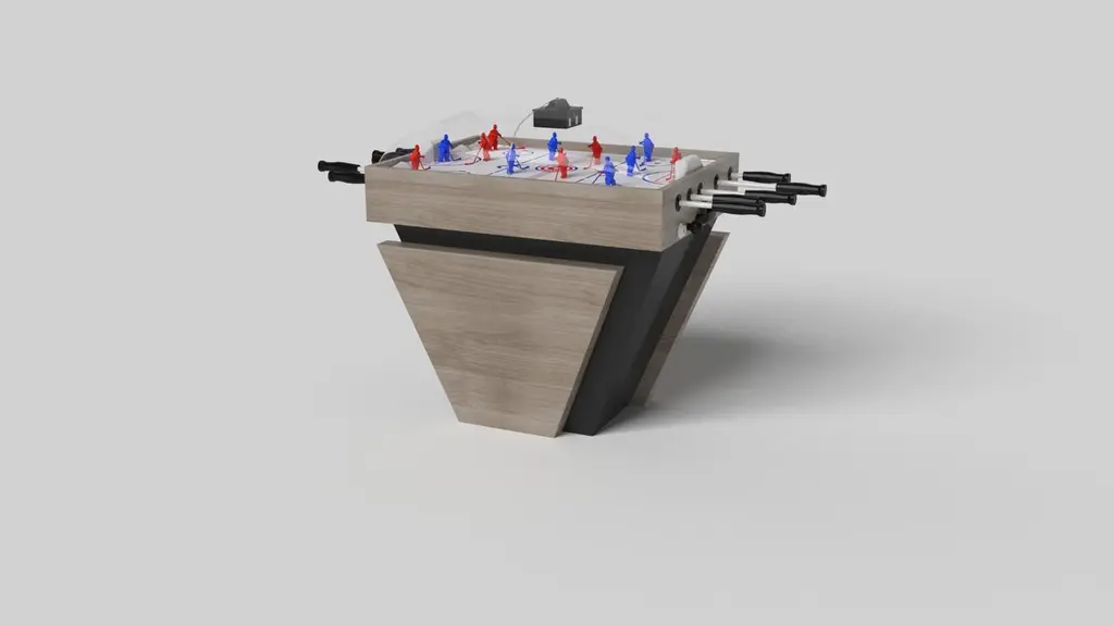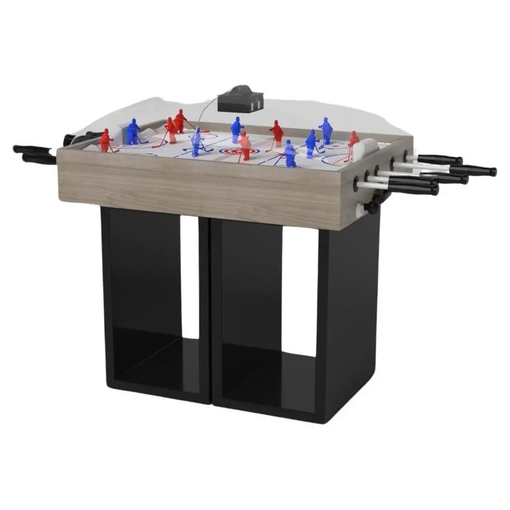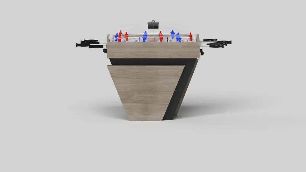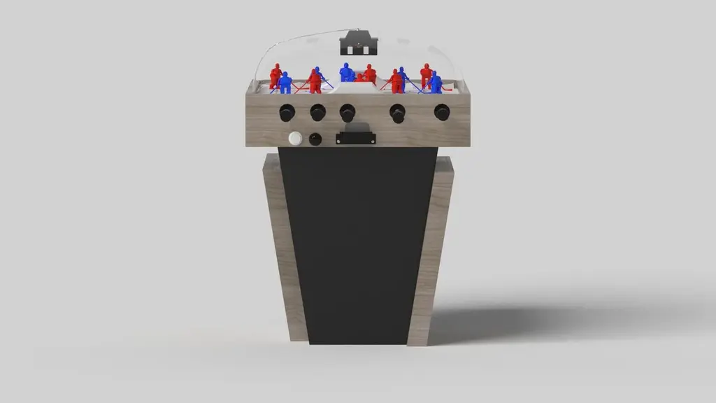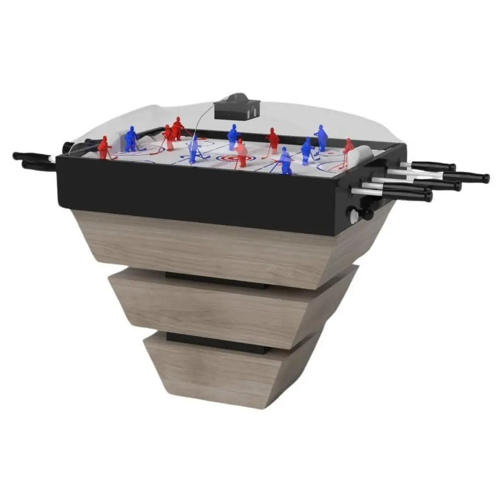 Handcrafted with clean lines, sharp angles, and a pyramid base, the Vogue dome hockey table in chrome with black strikes the perfect balance between sport-inspired style and contemporary design. Timeless in its appeal and revered for its practicality and purpose, this custom game table is beautifully crafted from durable metal with solid black maple wood accents that give it a cutting edge look.Size:45”X34”X47”