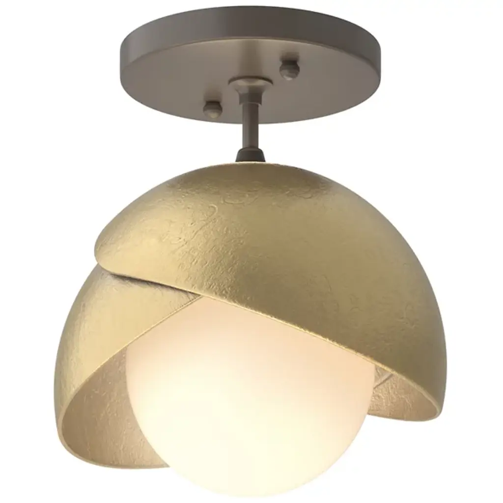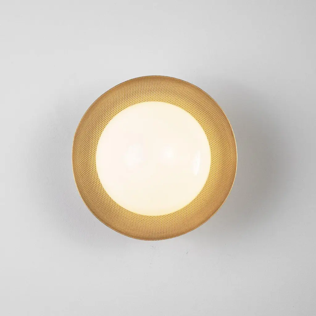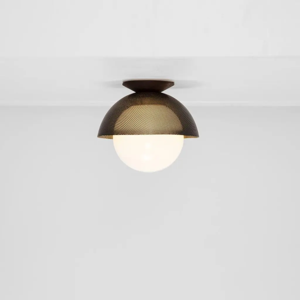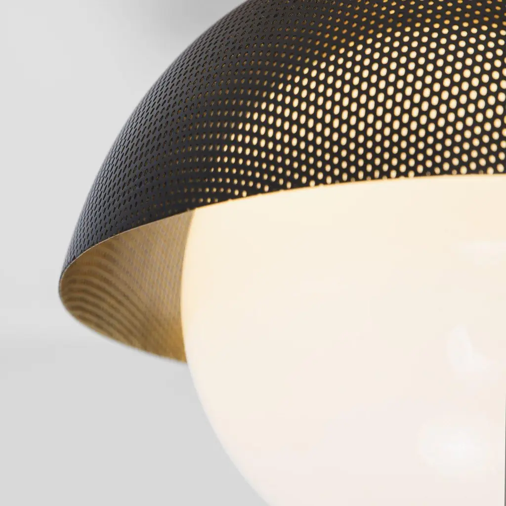 This hand-spun 10" dome is meticulously brushed and waxed to a matte satin finish. The hand blown glass provides pleasant surface diffusion while also complimenting the light's overall form. The fixture is finished with a black walnut back-plate that is turned on a lathe and finished with natural oils. UL certified.