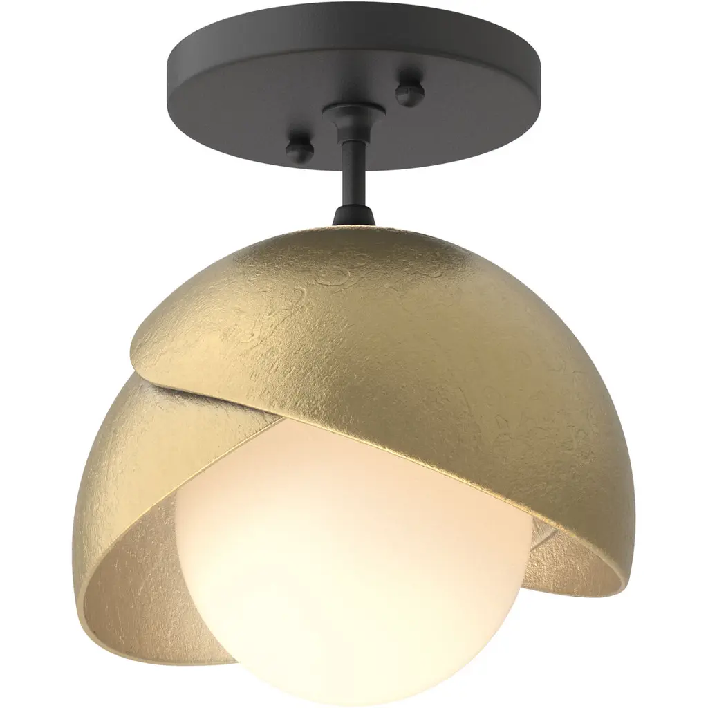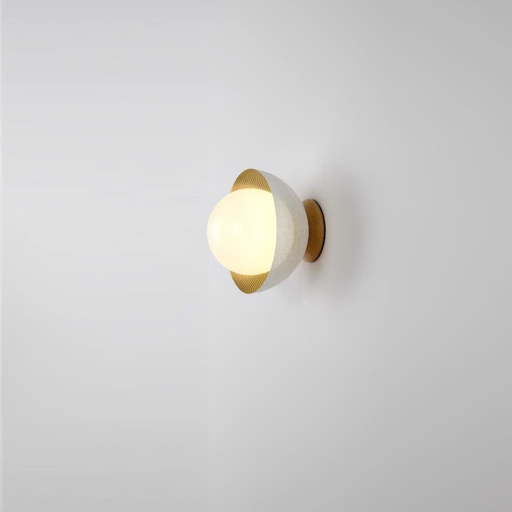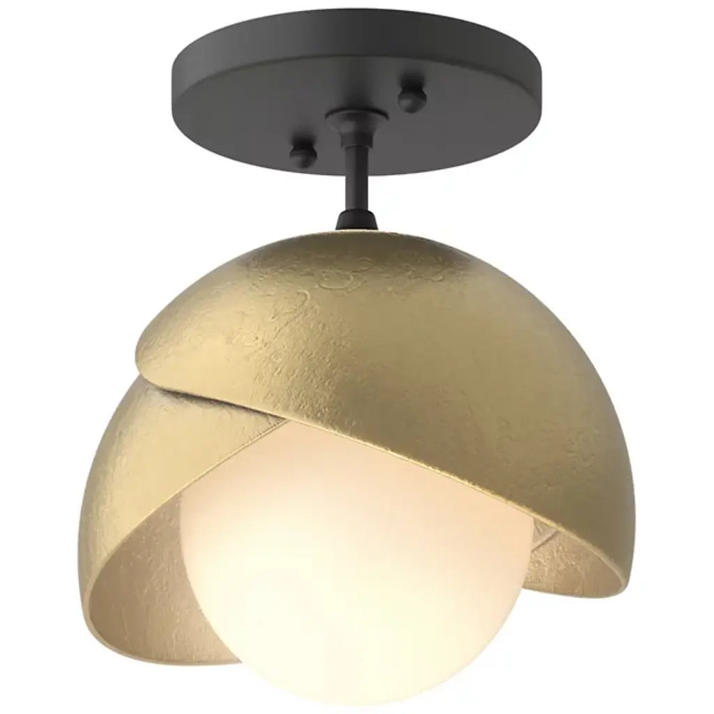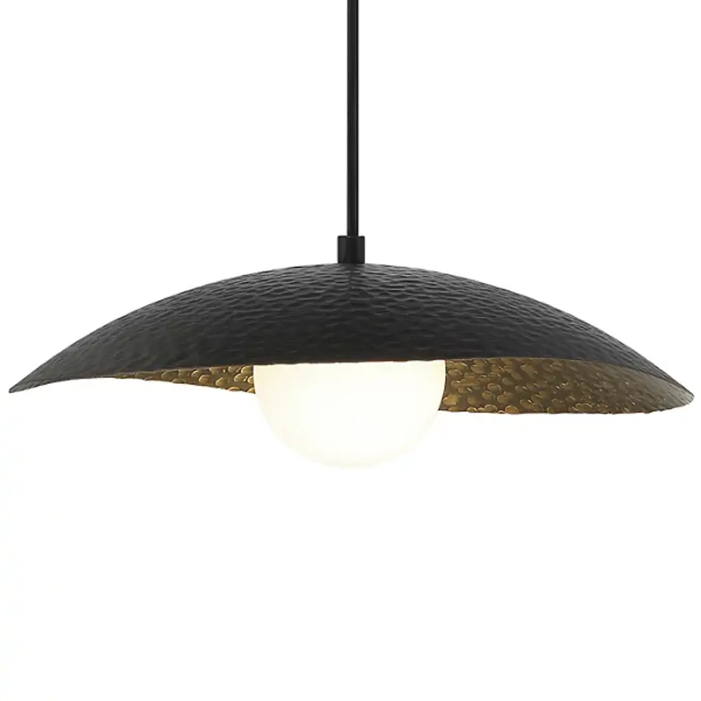 This hand-spun 10" dome is meticulously brushed and waxed to a matte satin finish. The hand blown glass provides pleasant surface diffusion while also complimenting the light's overall form. The fixture is finished with a black walnut back-plate that is turned on a lathe and finished with natural oils. UL certified.